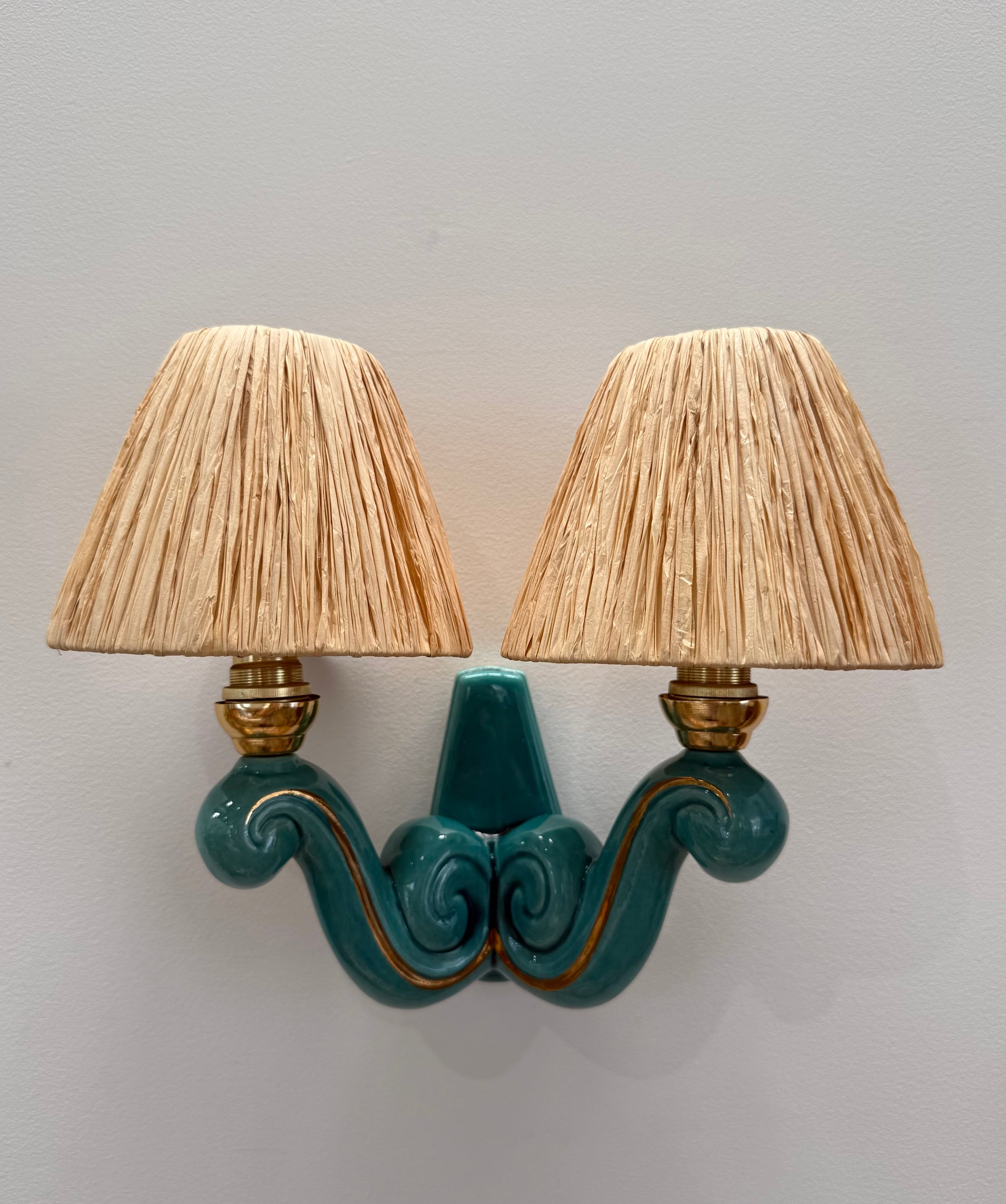 1950’s French ceramic wall light in aqua green with gold accents. New custom made raffia shades. Made in France.
