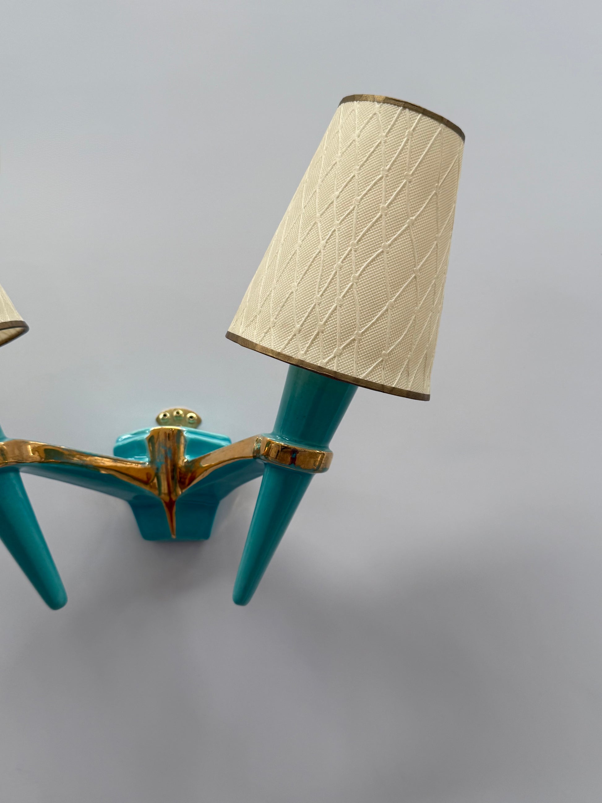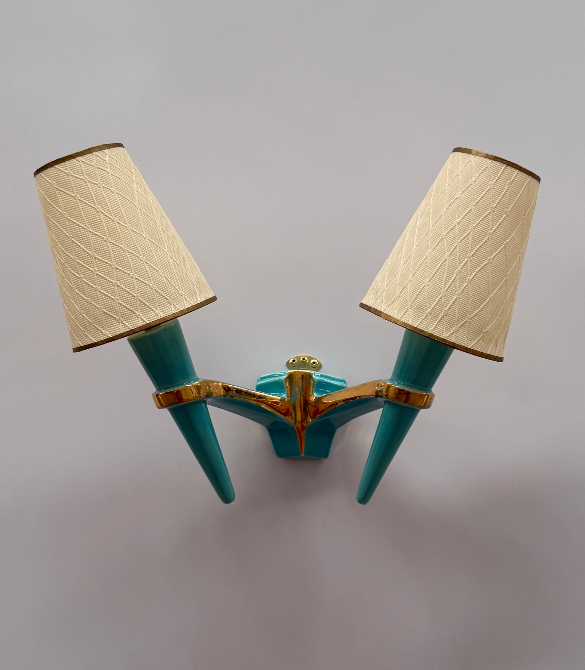 1950’s French ceramic wall light in aqua green with gold accents. Original fabric shades. Made in France.