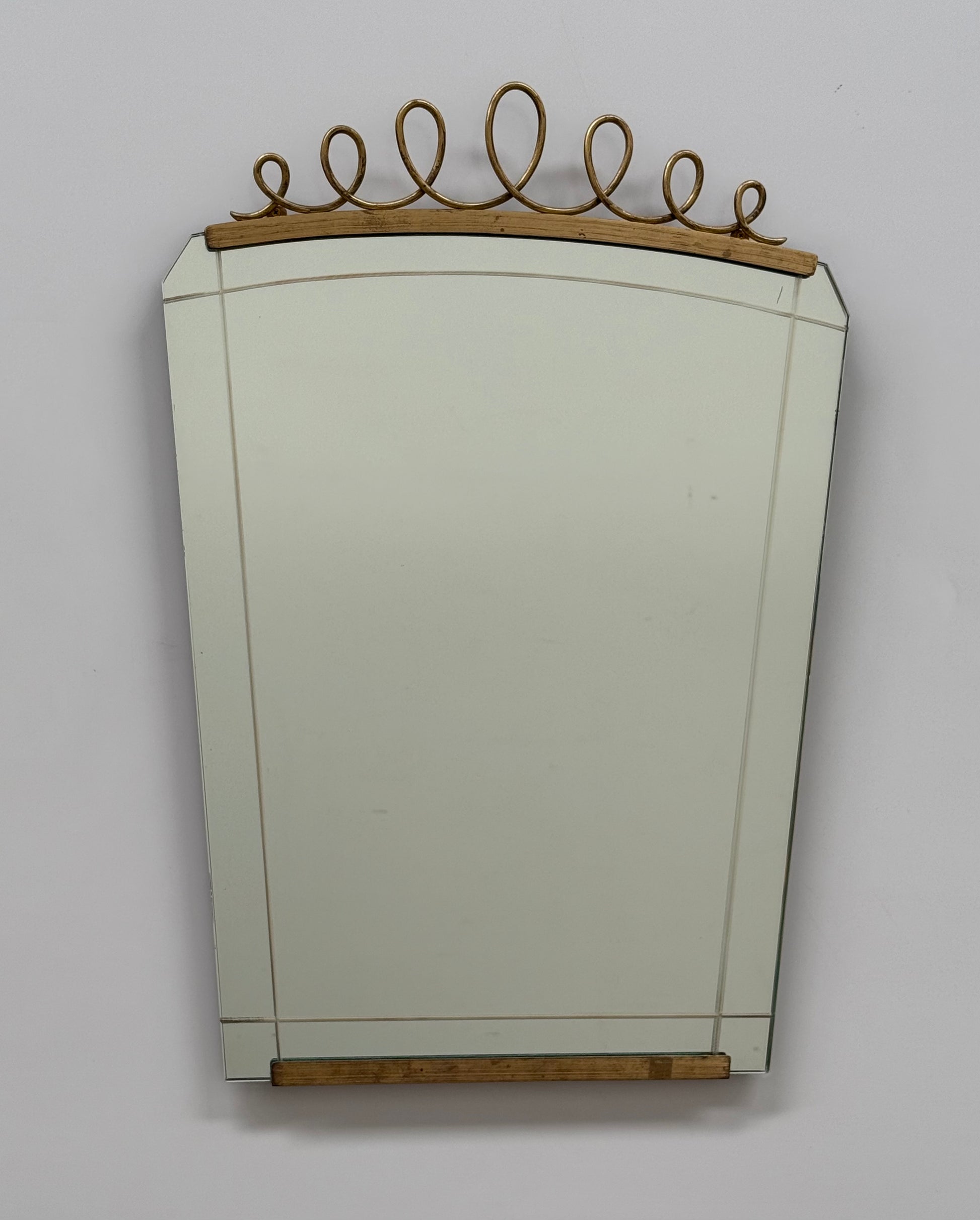 1950’s Italian glass and decorative brass mirror with brass spiral detailing at the top of the frame. Beautiful etched glass mirror with bevelled edge glass