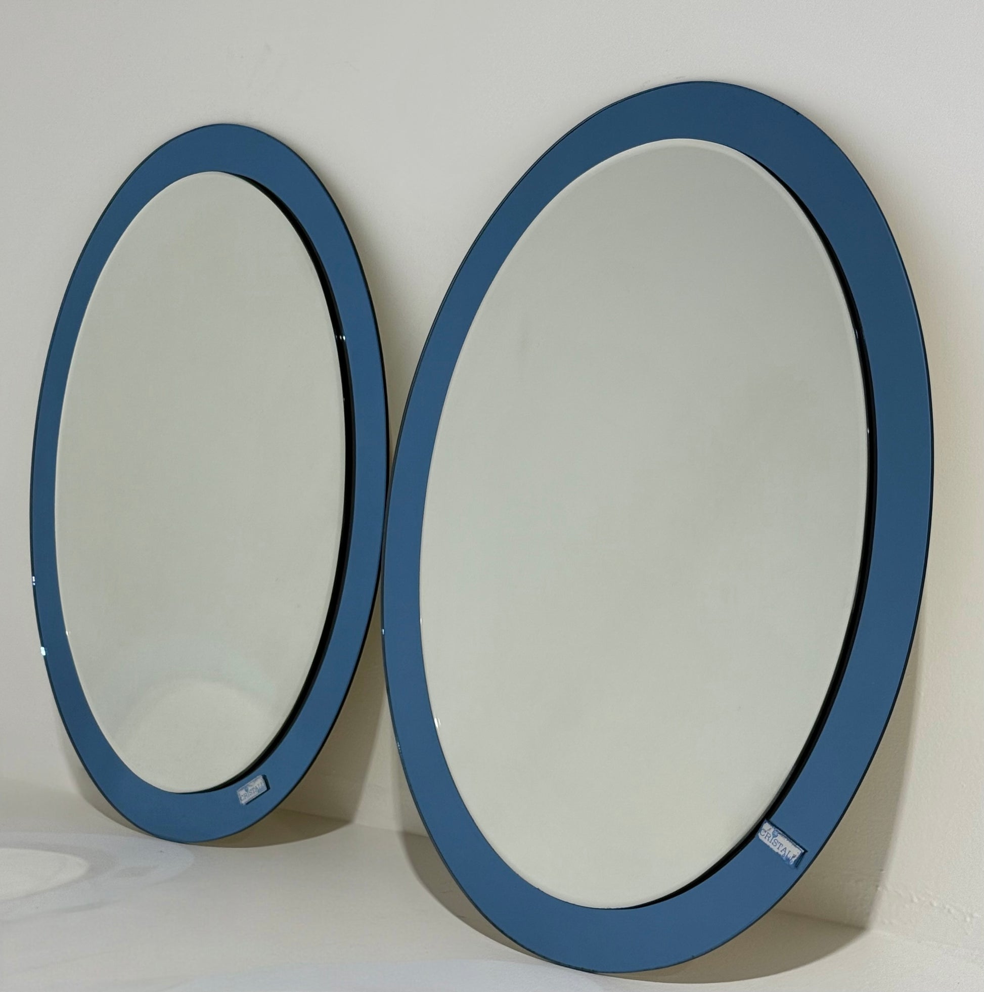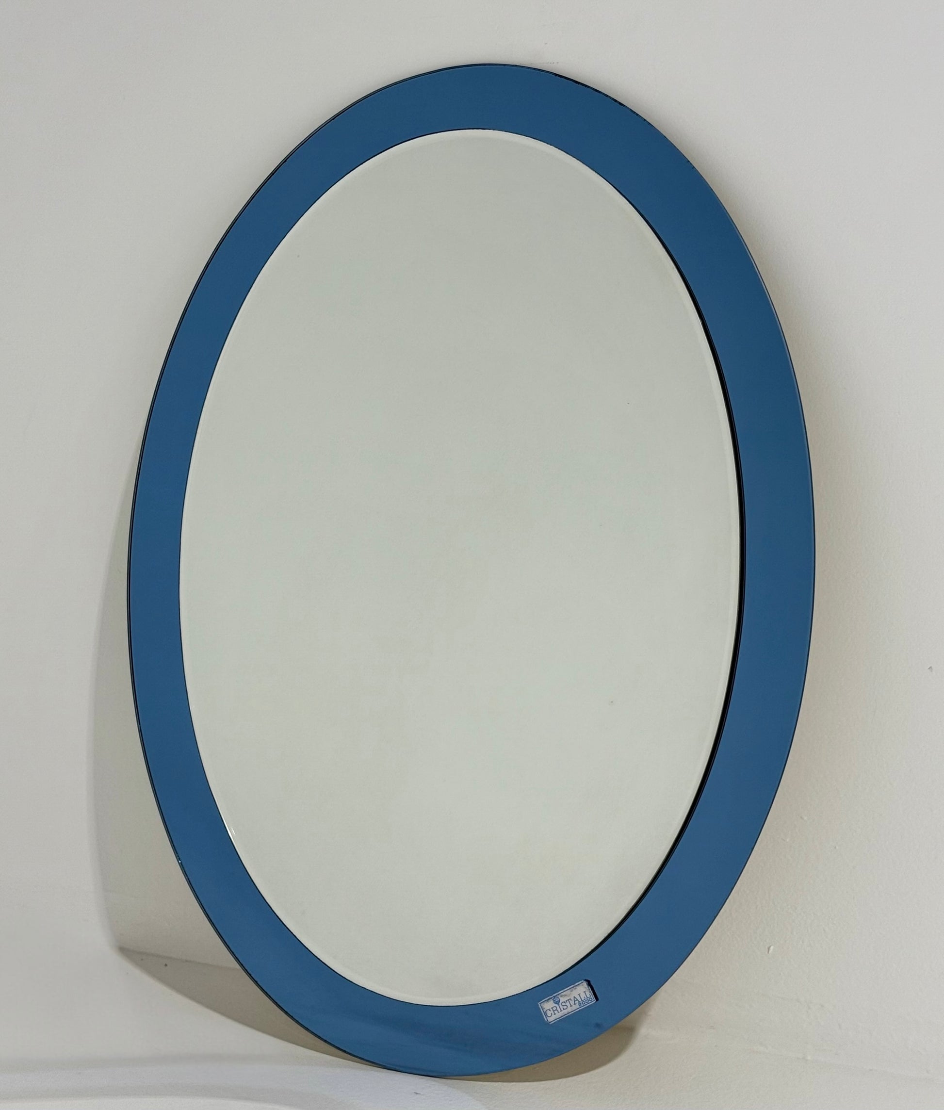 Beautiful Italian azzurra blue coloured glass mirror. Bevelled edge glass mirror on a blue glass frame. Circa 1970’s. Original label remains on the mirror. Could easily be removed but has been left for authenticity. Sourced in Italy
