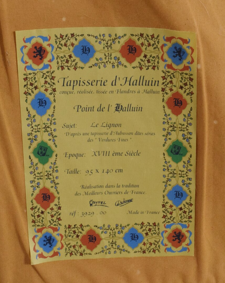 Vintage French verdure tapestry. Rich shades of blue and green in the typical Aubusson style. It is after 'Le Lignon' an 18th Century Aubusson tapestry in the 'Verdures fines' series. Original label on the reverse indicates that this is a Halluin tapestry, a type of French textile often in the classic Aubusson style which was produced by workshops in Halluin France. It is woven in incredible detail and texture.