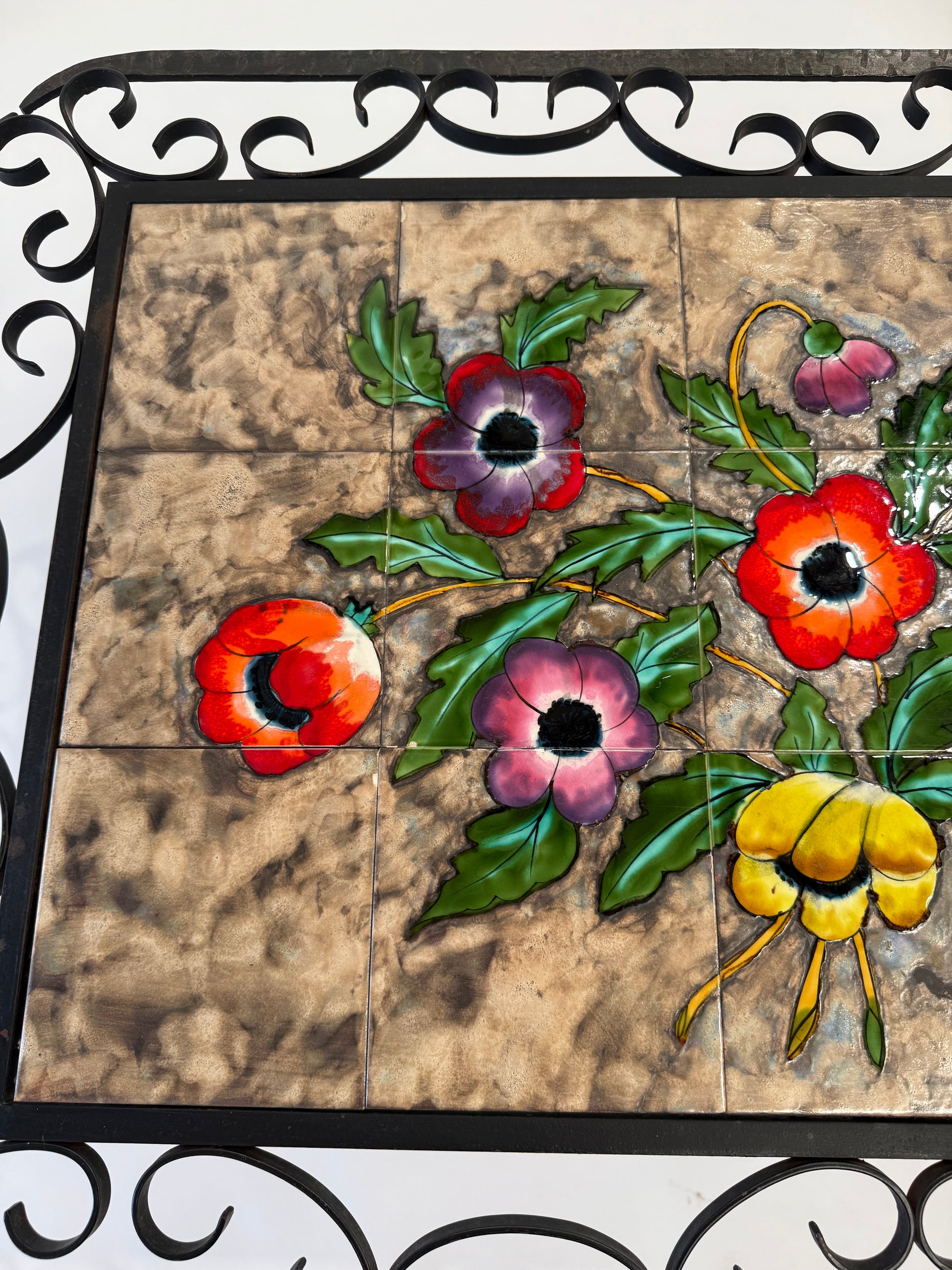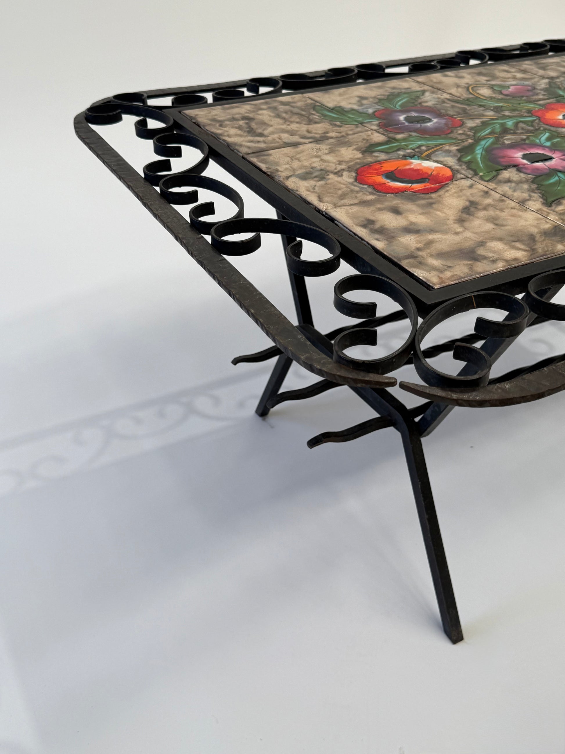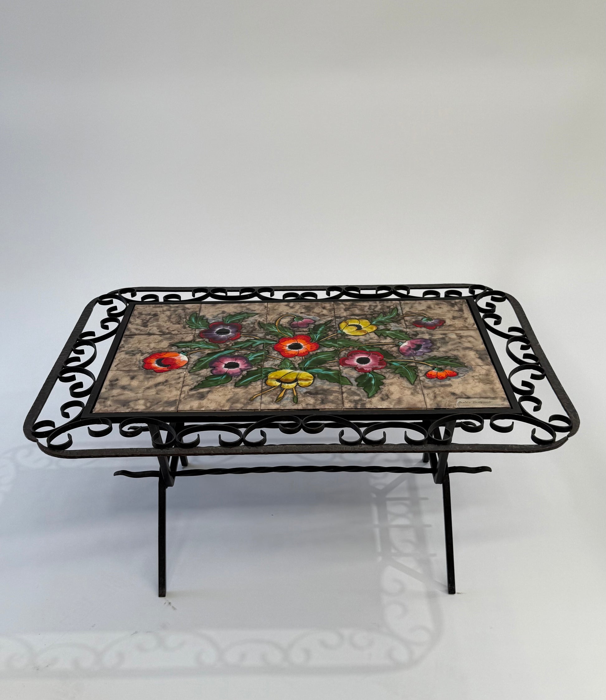 Adorable vintage French wrought iron and hand painted tiled coffee table. Made in Vallauris, circa 1950’s. Lovely decorative iron frame with hand painted floral motif tiles