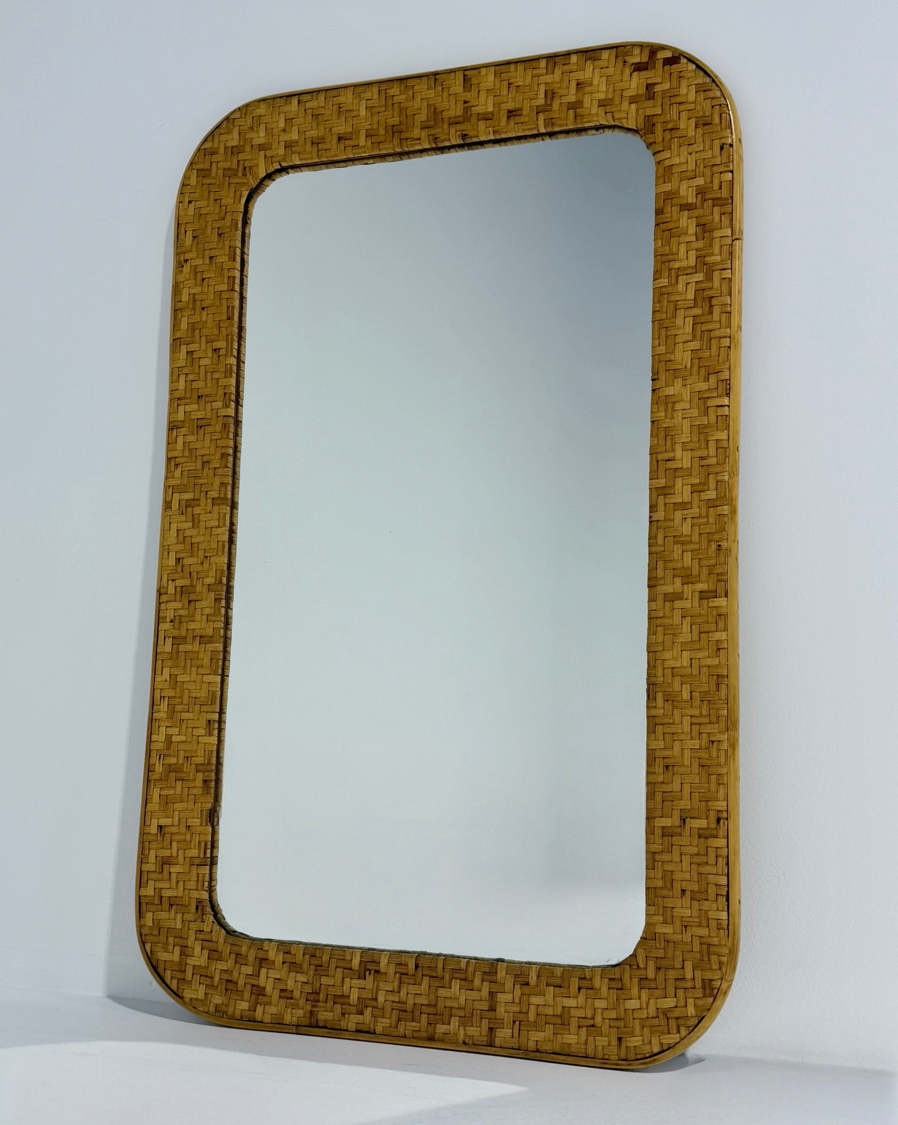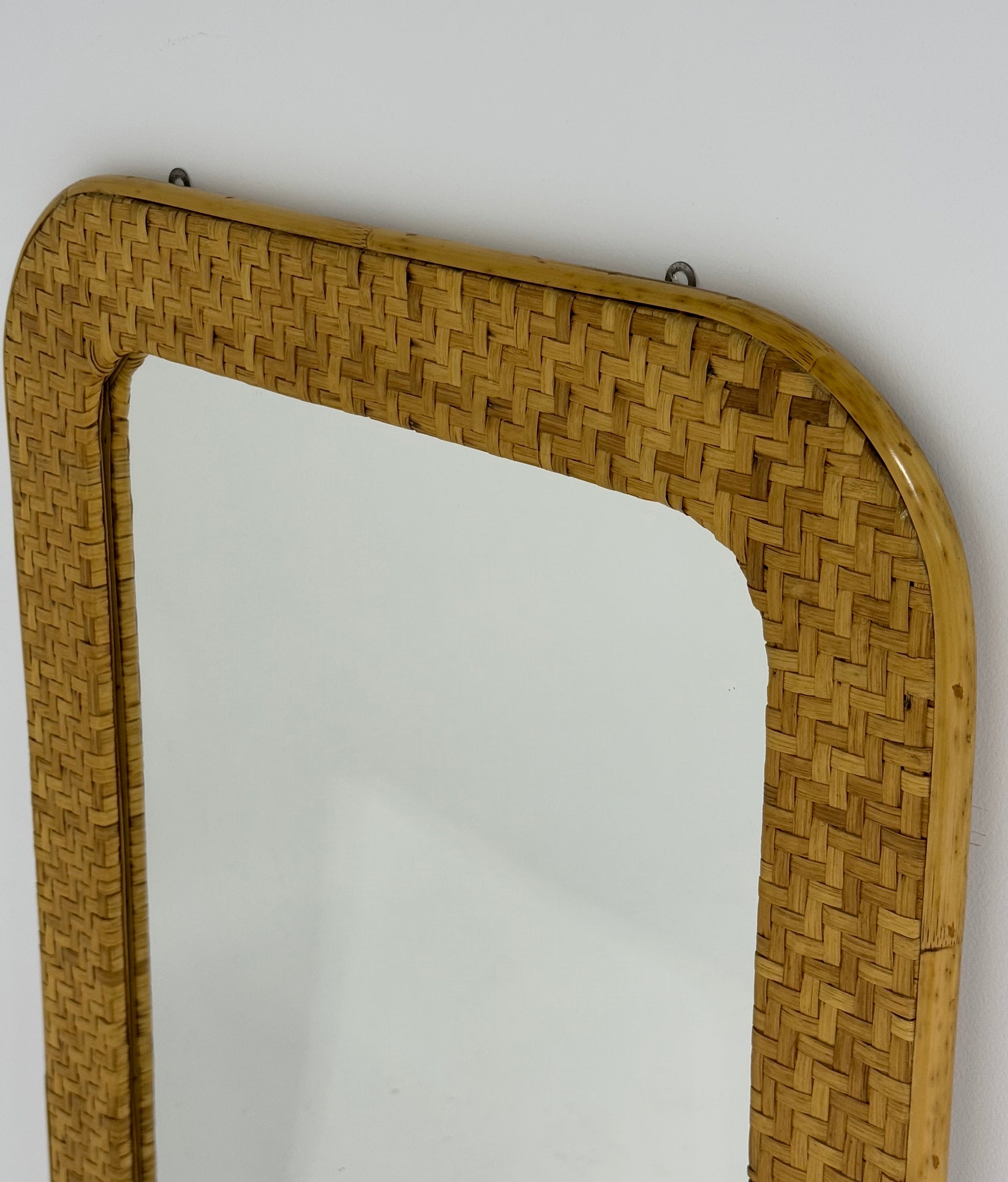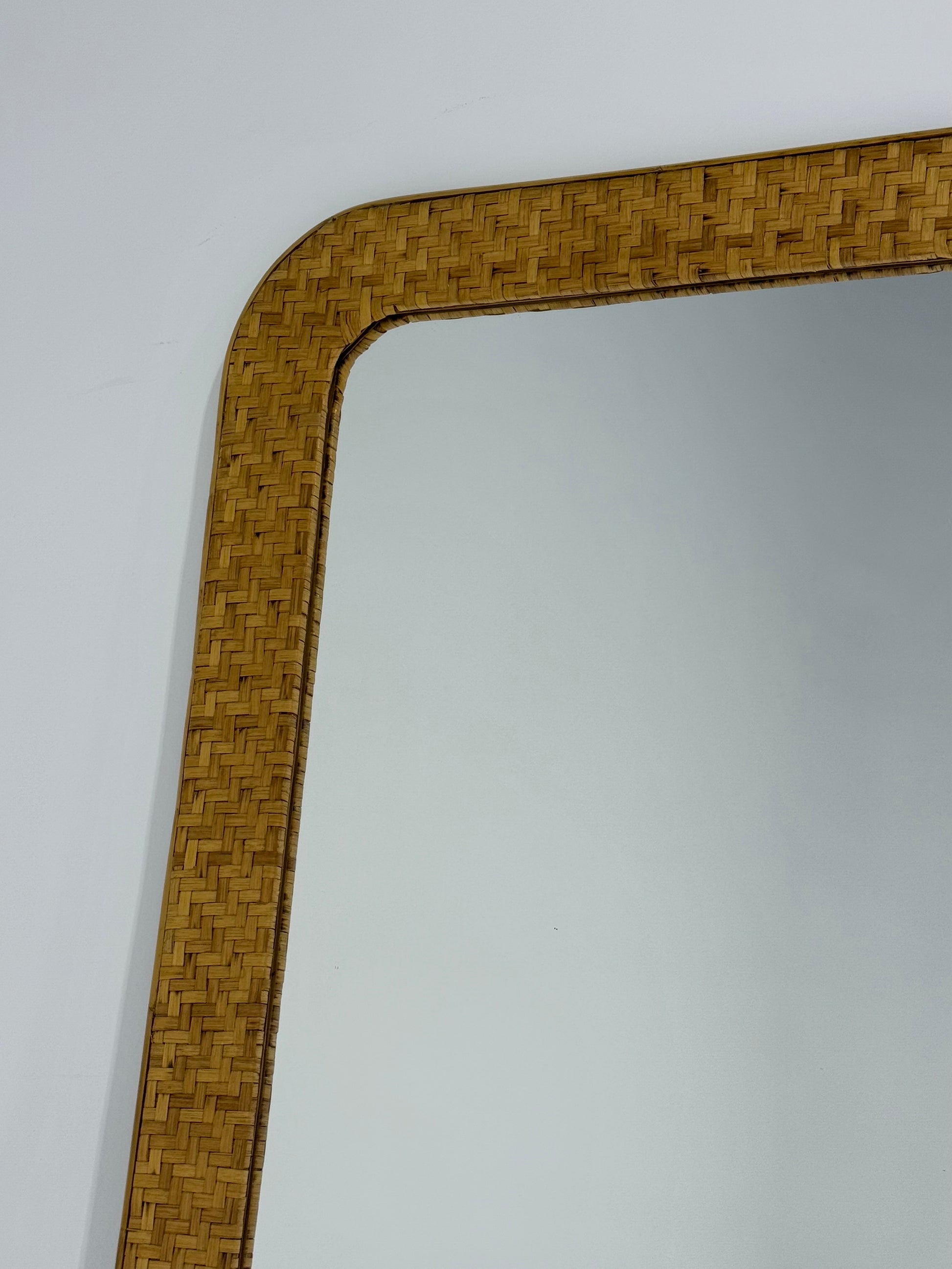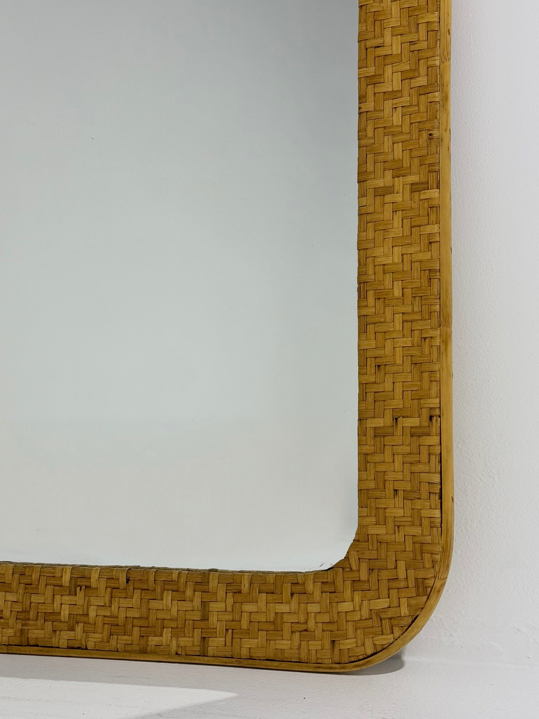 Large Vintage Italian woven bamboo and rattan mirror. Circa 1960’s. An unusually large shape for this style, serves as a full length mirror.