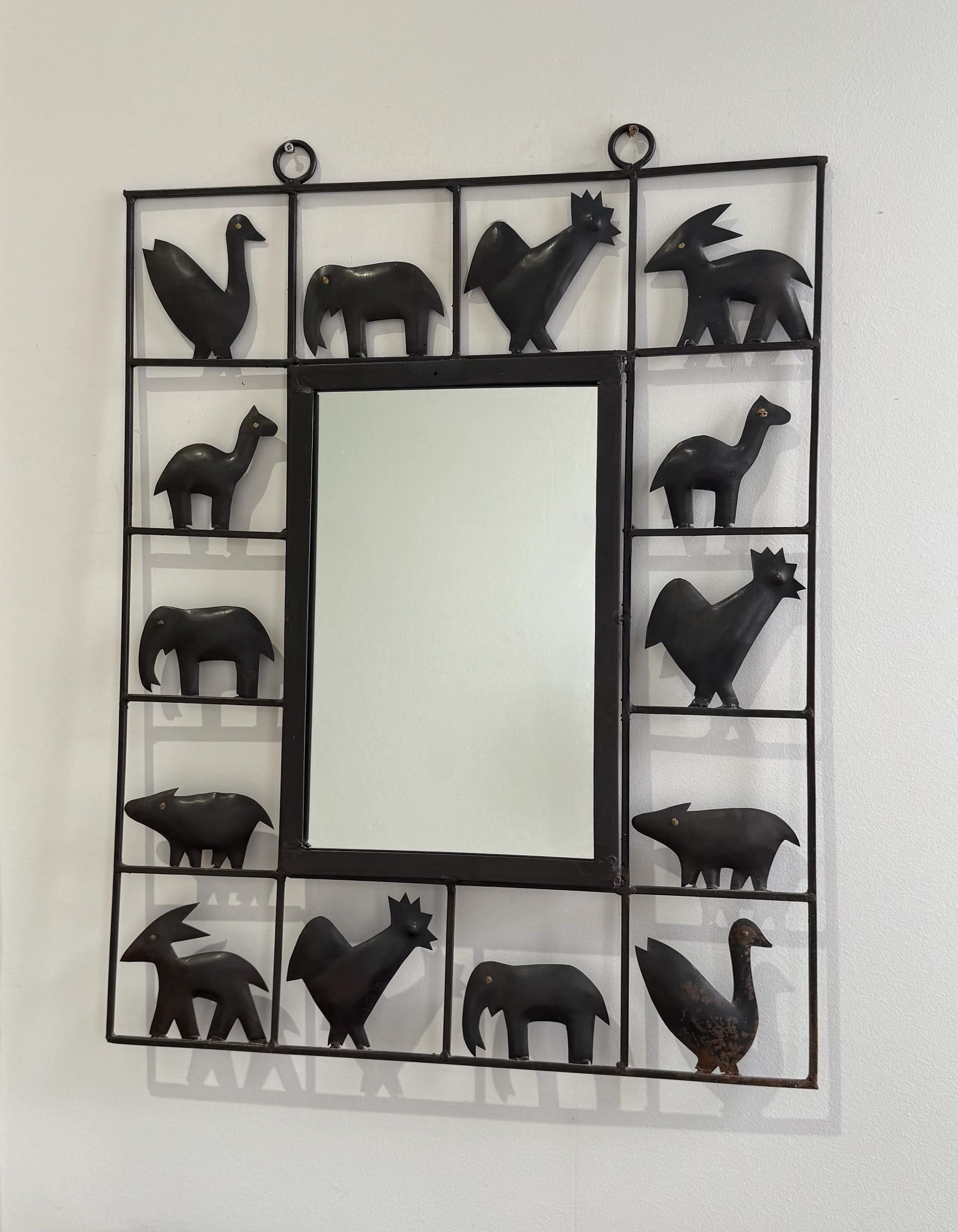 Rare French wrought iron mirror with animal motifs by Jean Touret at Atelier Marolles. Circa 1950’s. Sourced in France