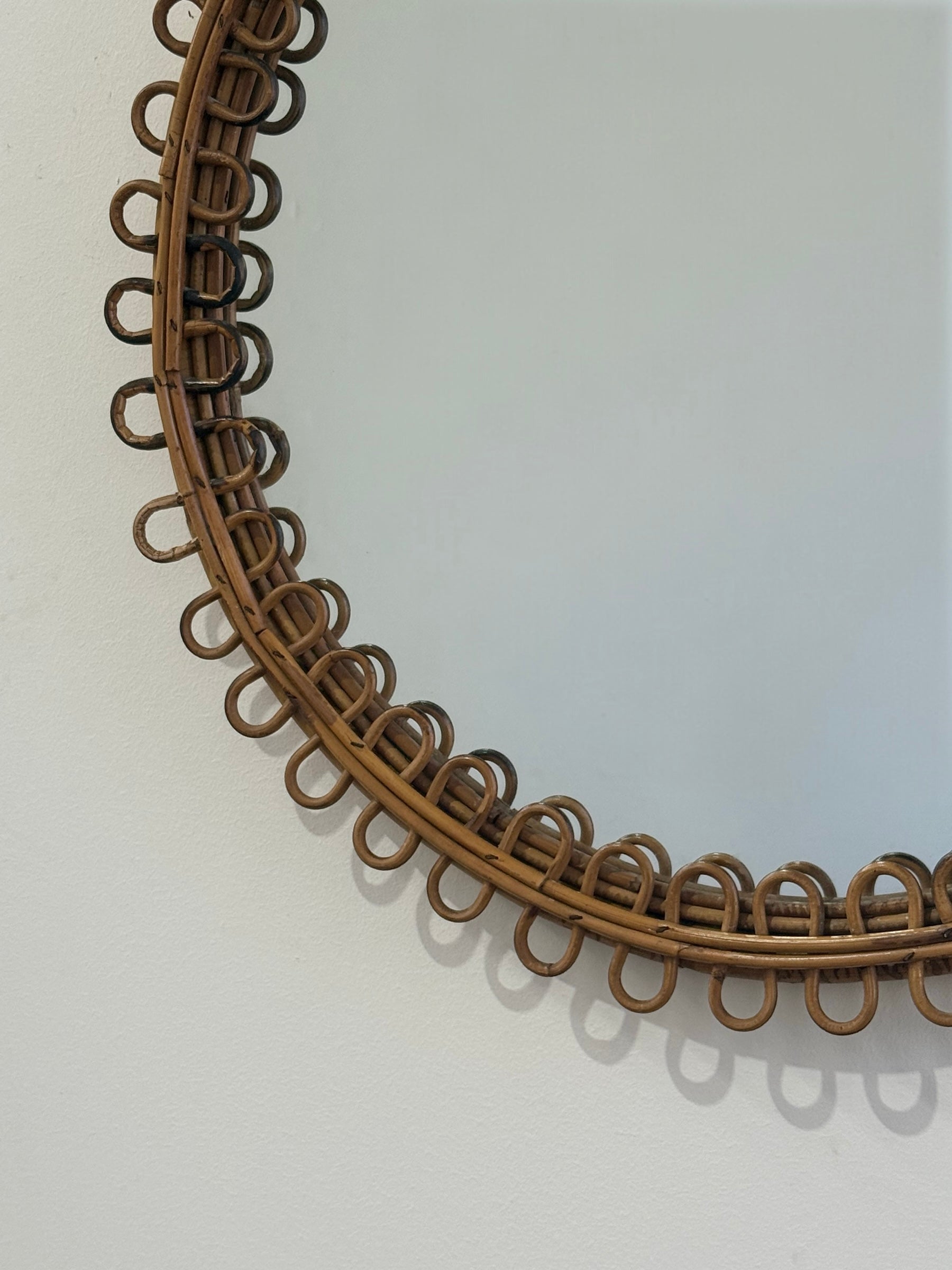 Round Italian bamboo mirror with loop frame by Franco Albini for Bonacina. Circa 1960’s. Sourced in Italy