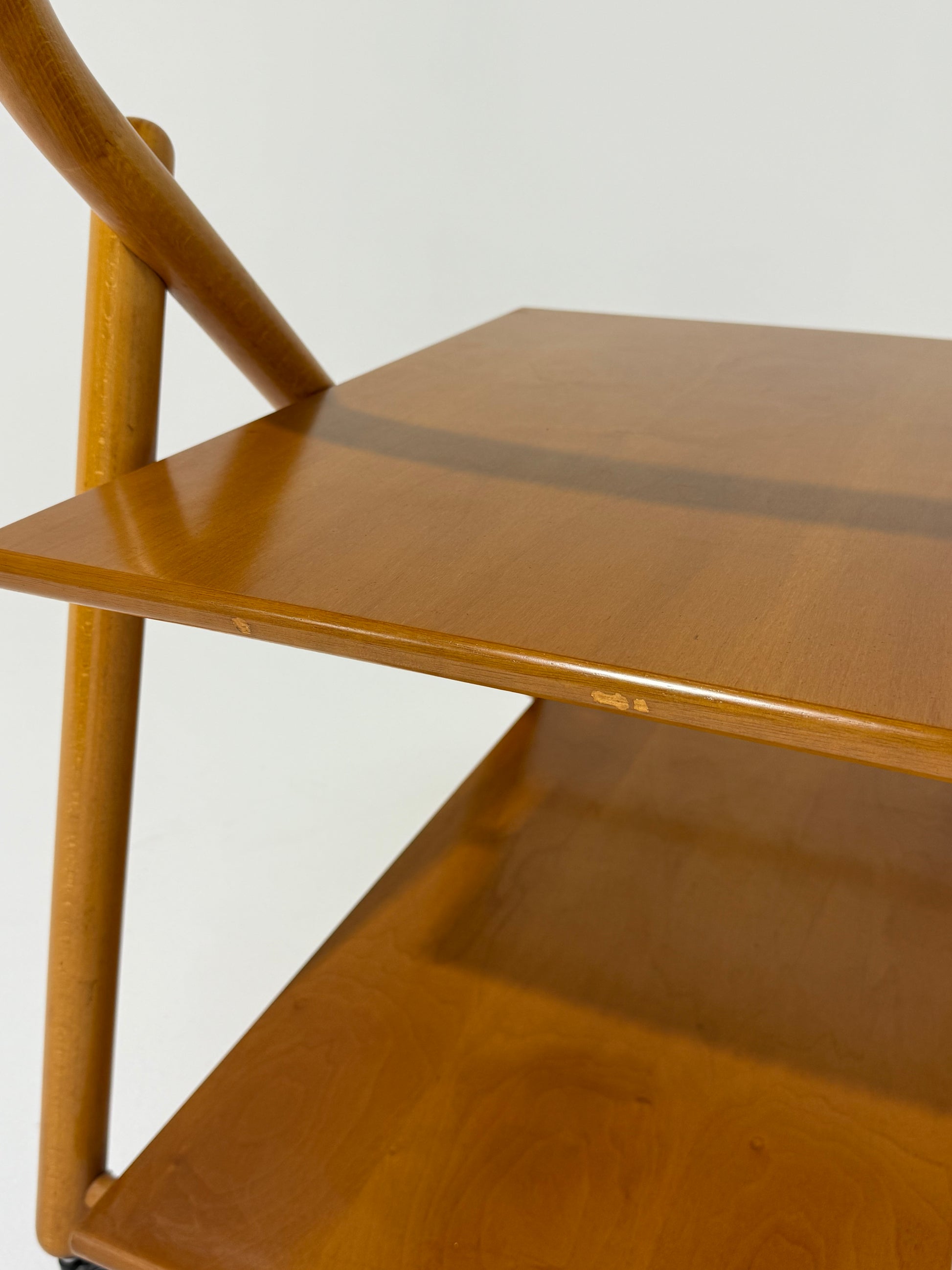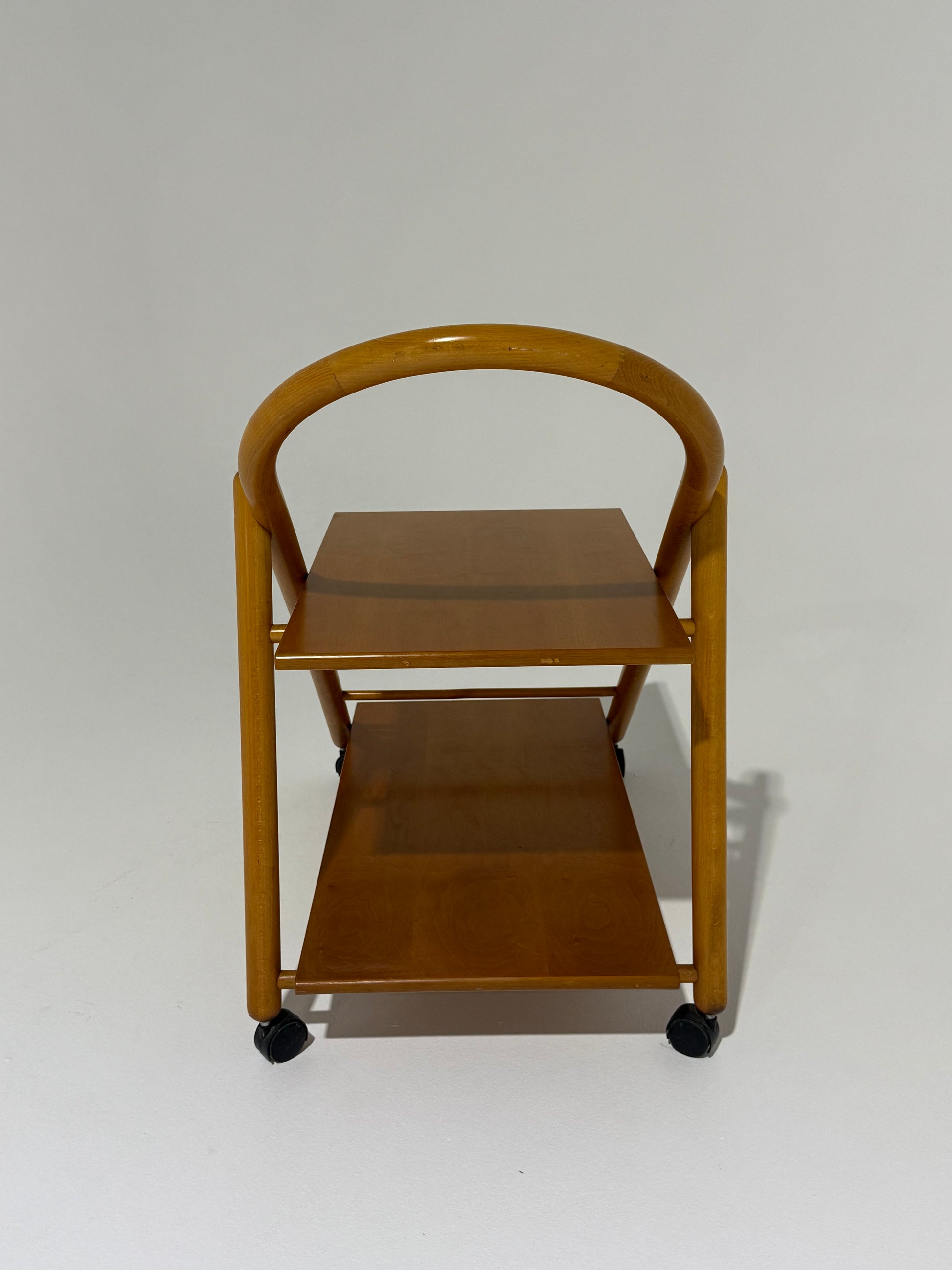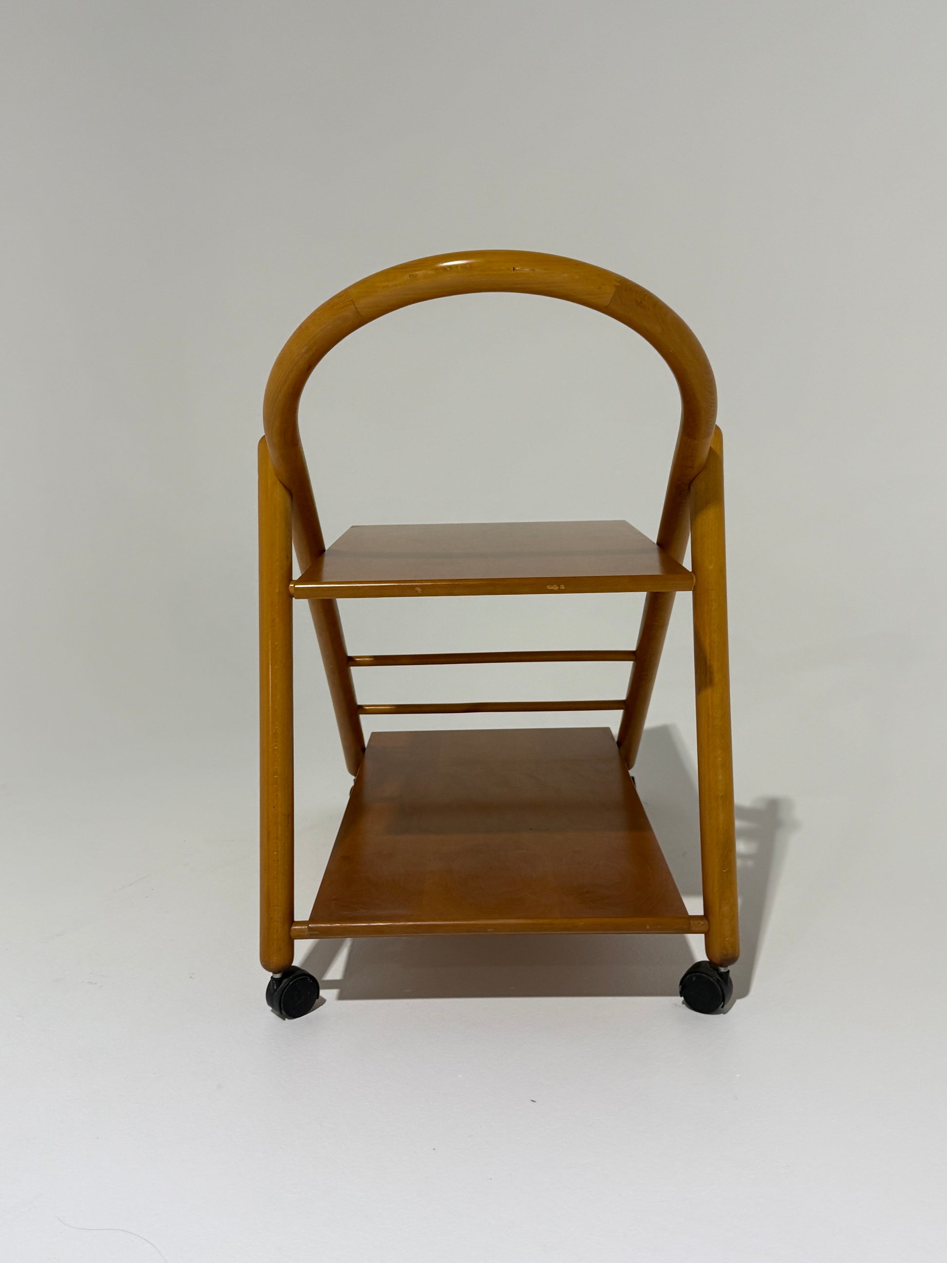 Unique Italian vintage timber bar trolley. Memphis Style design with two shelves and a curved frame. Most likely made from pine. Circa 1980’s