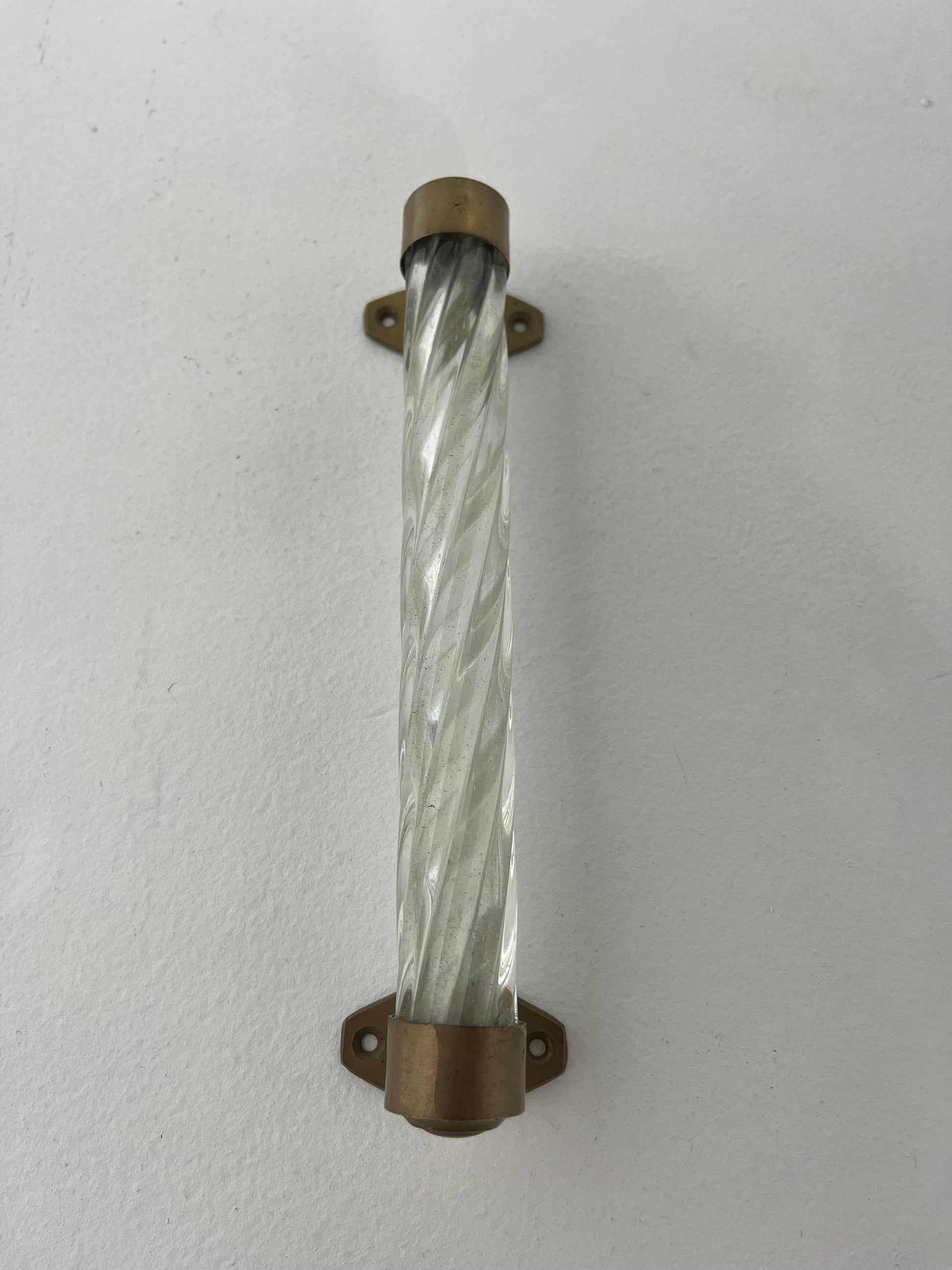 Vintage Italian Murano glass drawer/door pull with brass hardware. Beautiful twisted glass detailing. There are three sizes available. This is the LARGE Sourced in Italy.