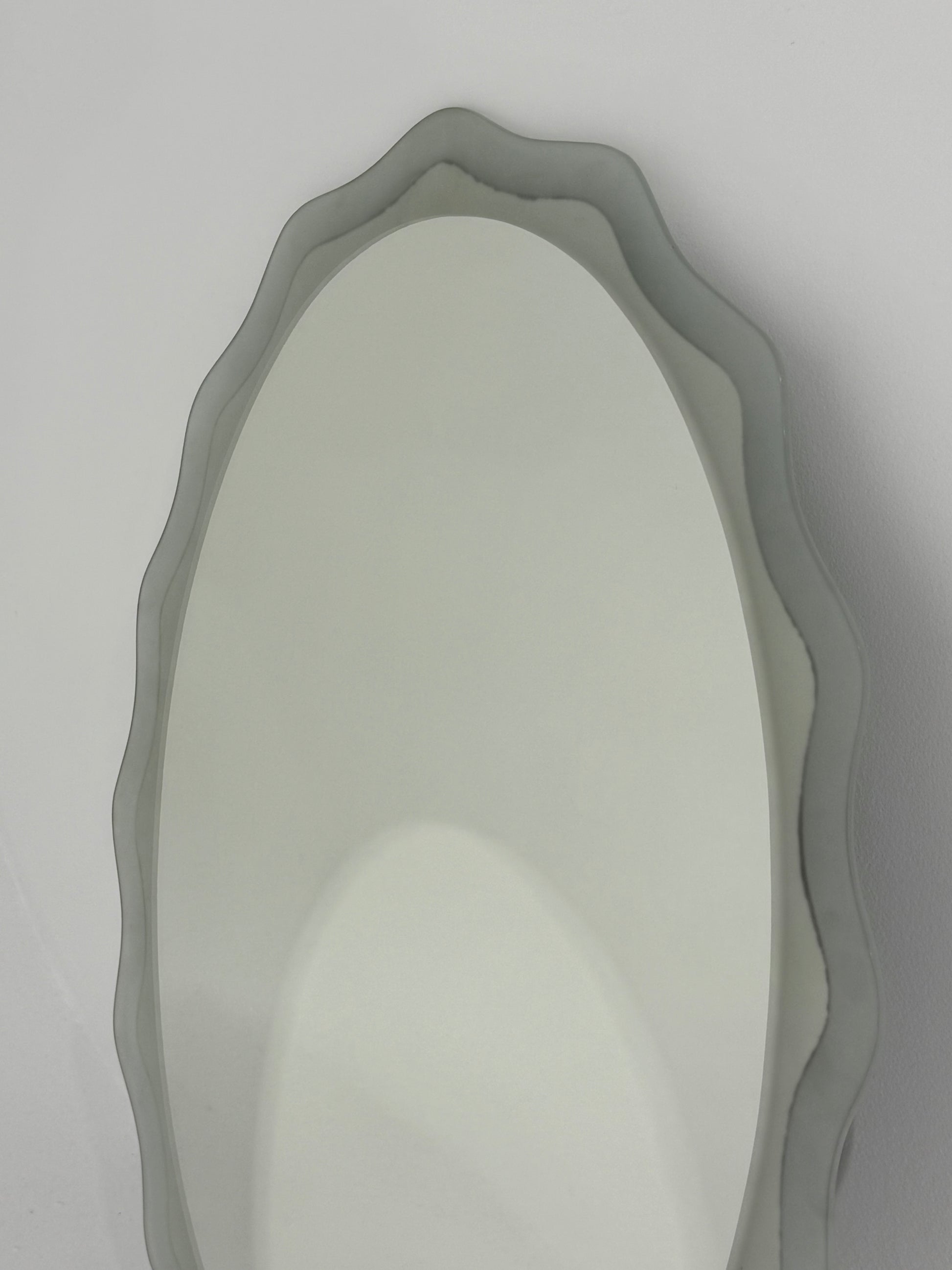 Italian glass mirror with scalloped edge frame. Matching pair available. Striking sandblasted glass production in blue glass. Metal fixing frame on the reverse.