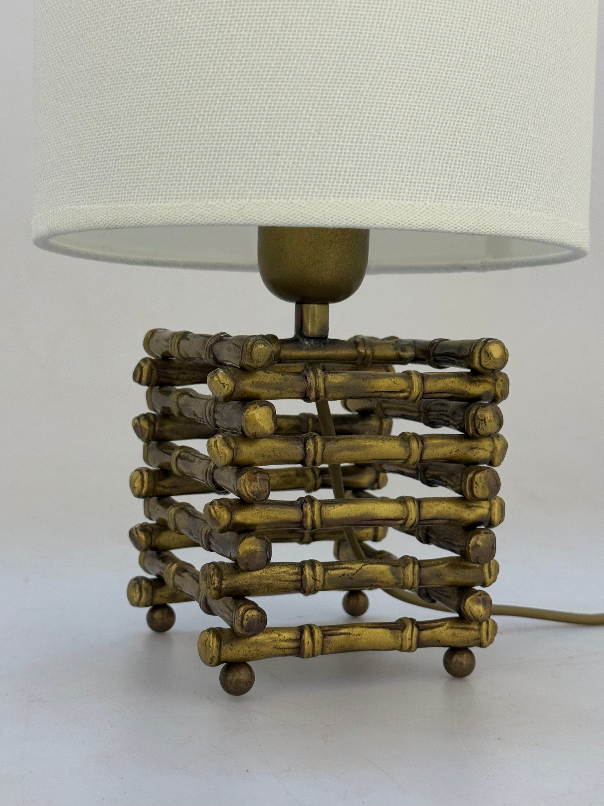 Fantastic vintage brass lamp with faux bamboo decorative design. Attributed to Maison Jansen. New linen shade. Classic vintage 1970’s style.