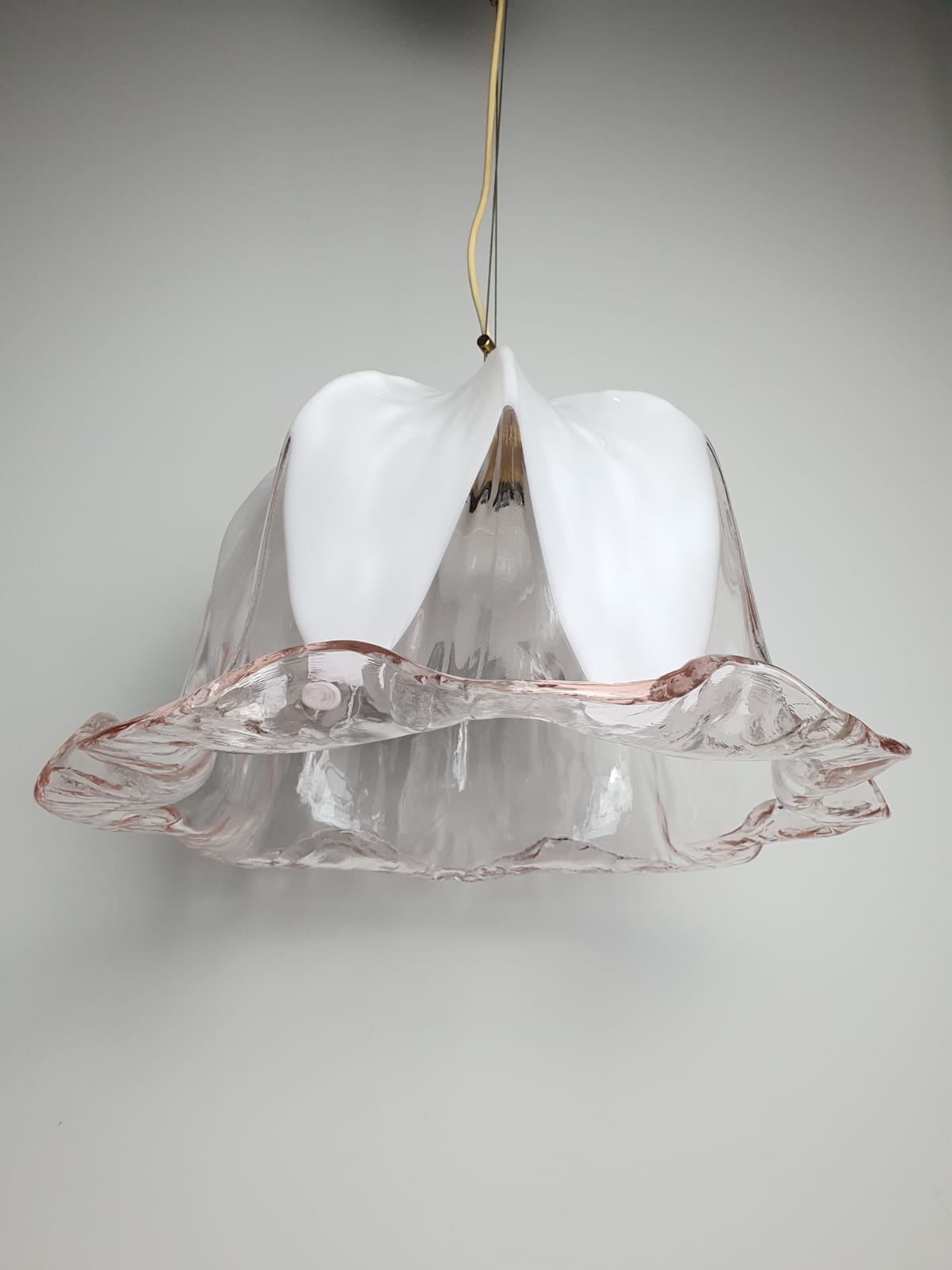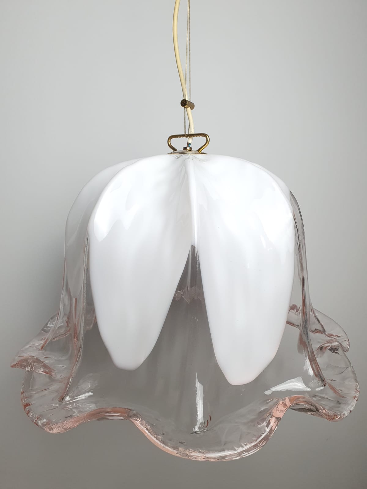 Stunning vintage Murano glass tulip shaped pendant by La Murrina. Circa 1990’s. Featuring a beautiful handlblown glass shade in milky white and rose pink glass. Brass hardware and brass ceiling rose. Signed La Murrina. Sourced in Italy.