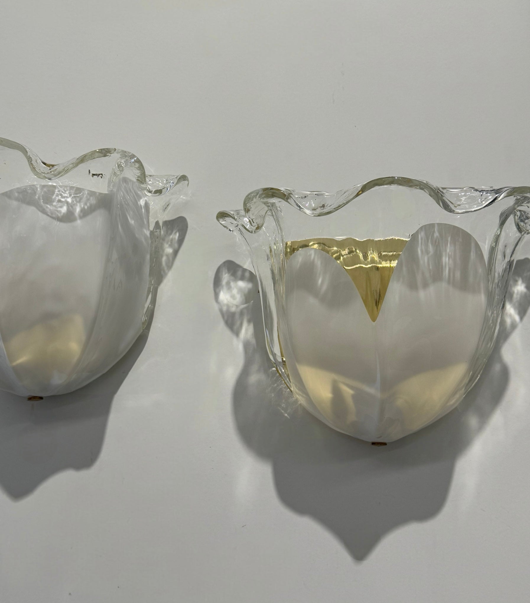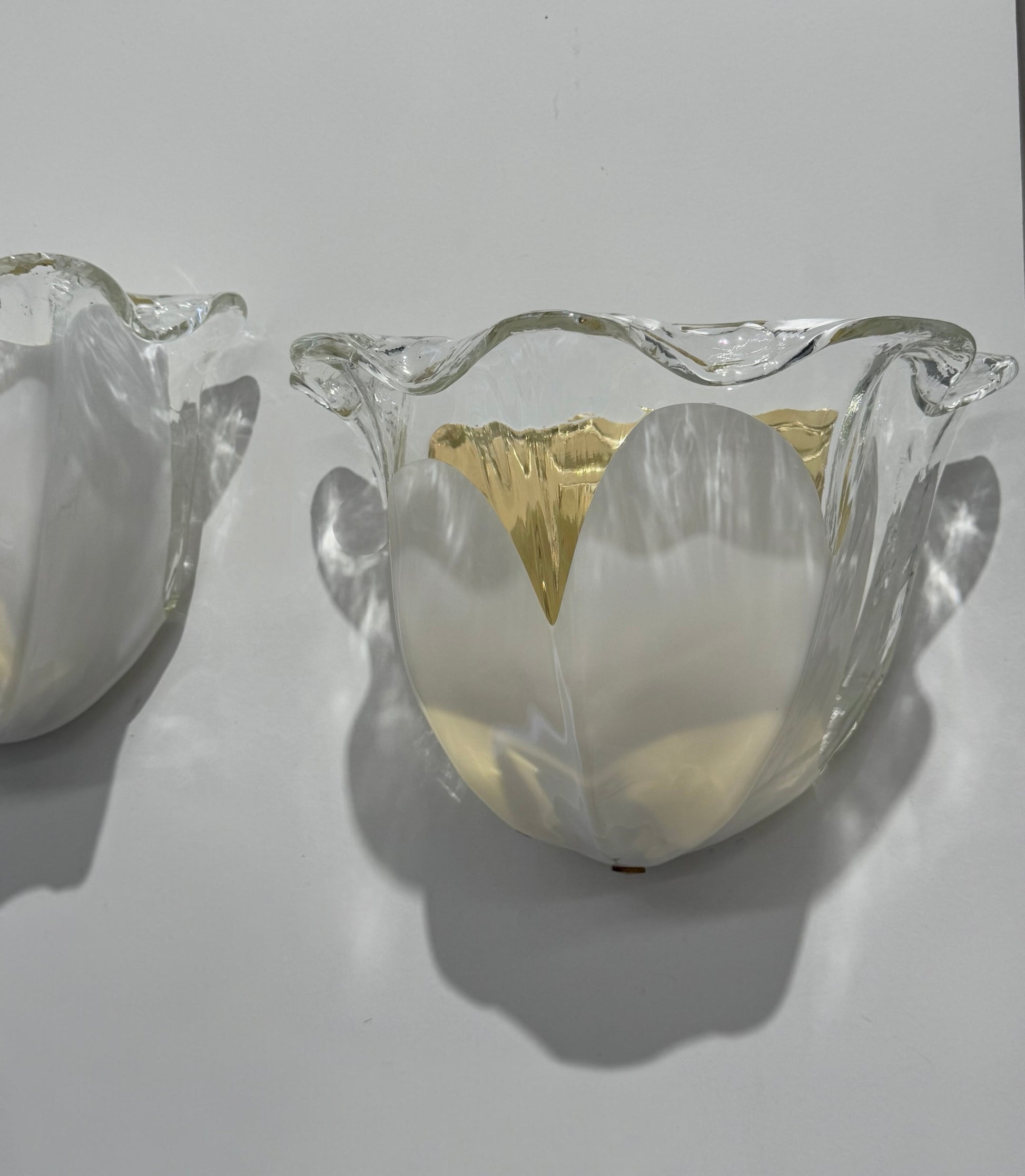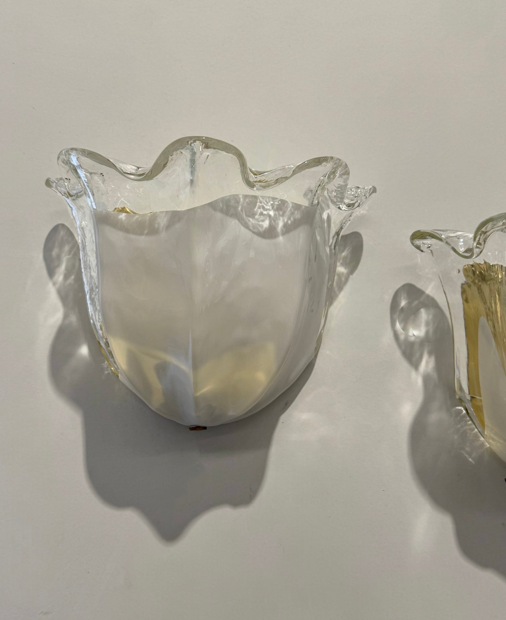 Gorgeous pair of Murano wall lights in opaque milky white and transparent glass. Beautiful tulip shape with scalloped trim. Produced by La Murrina. Brass hardware. Signed La Murrina. Sourced in Italy