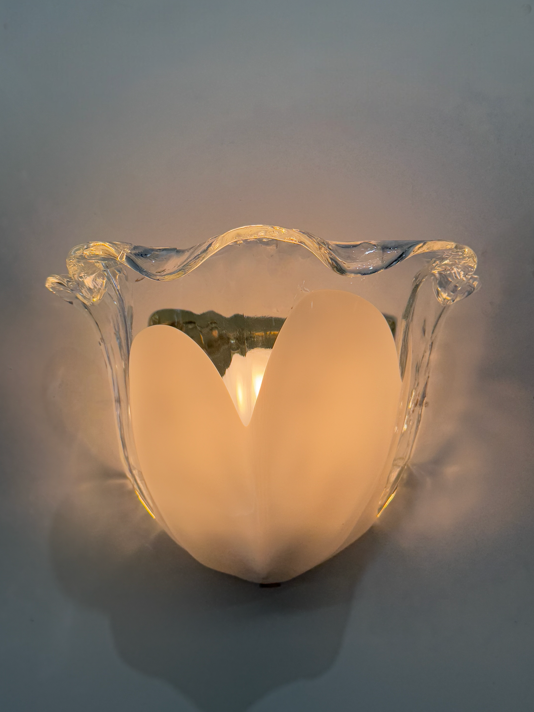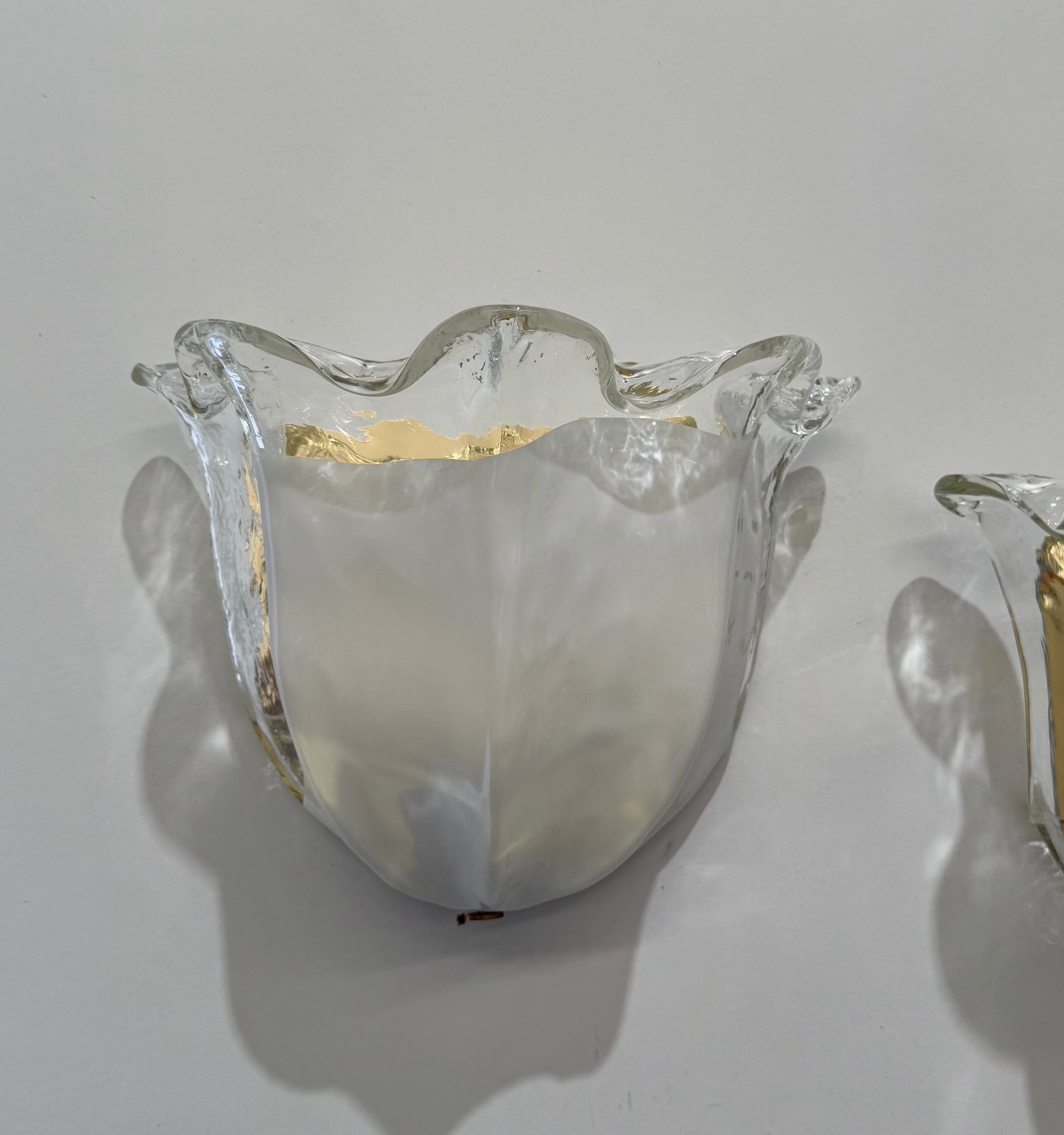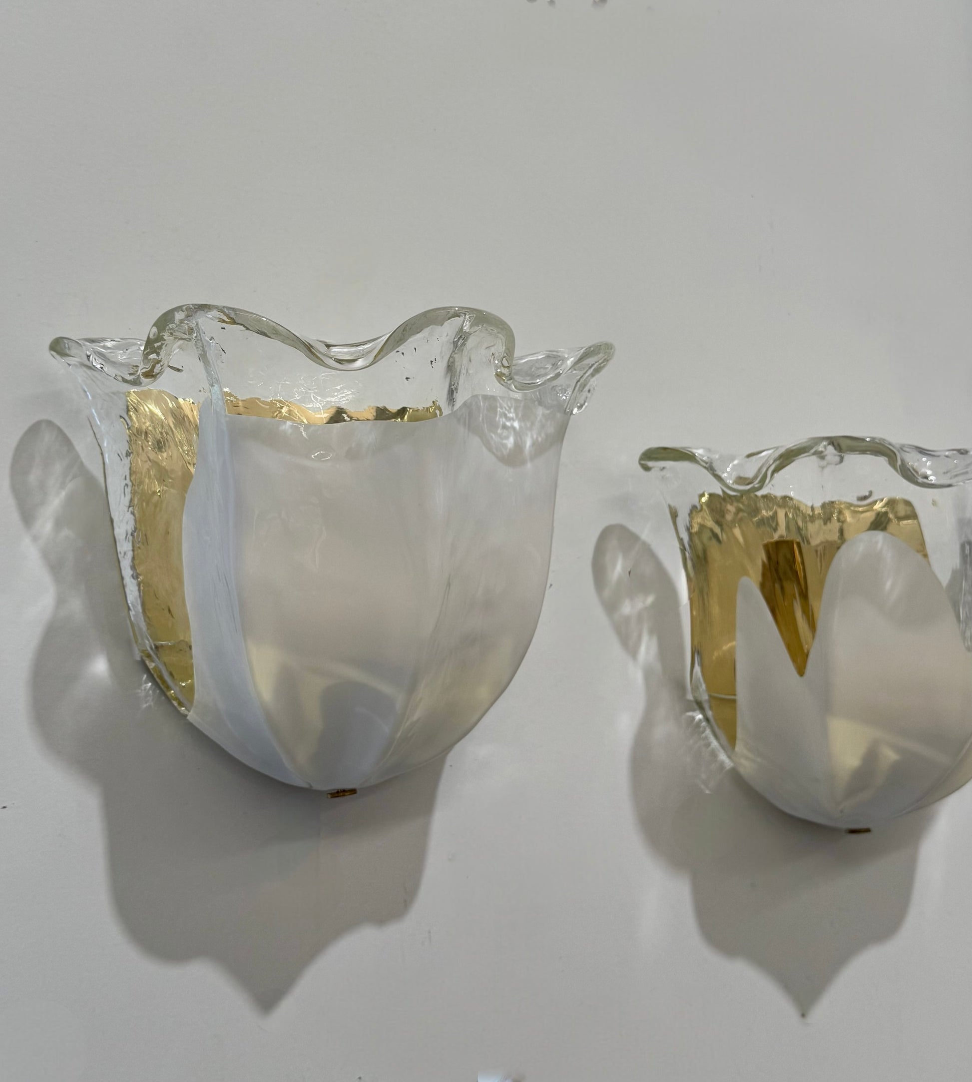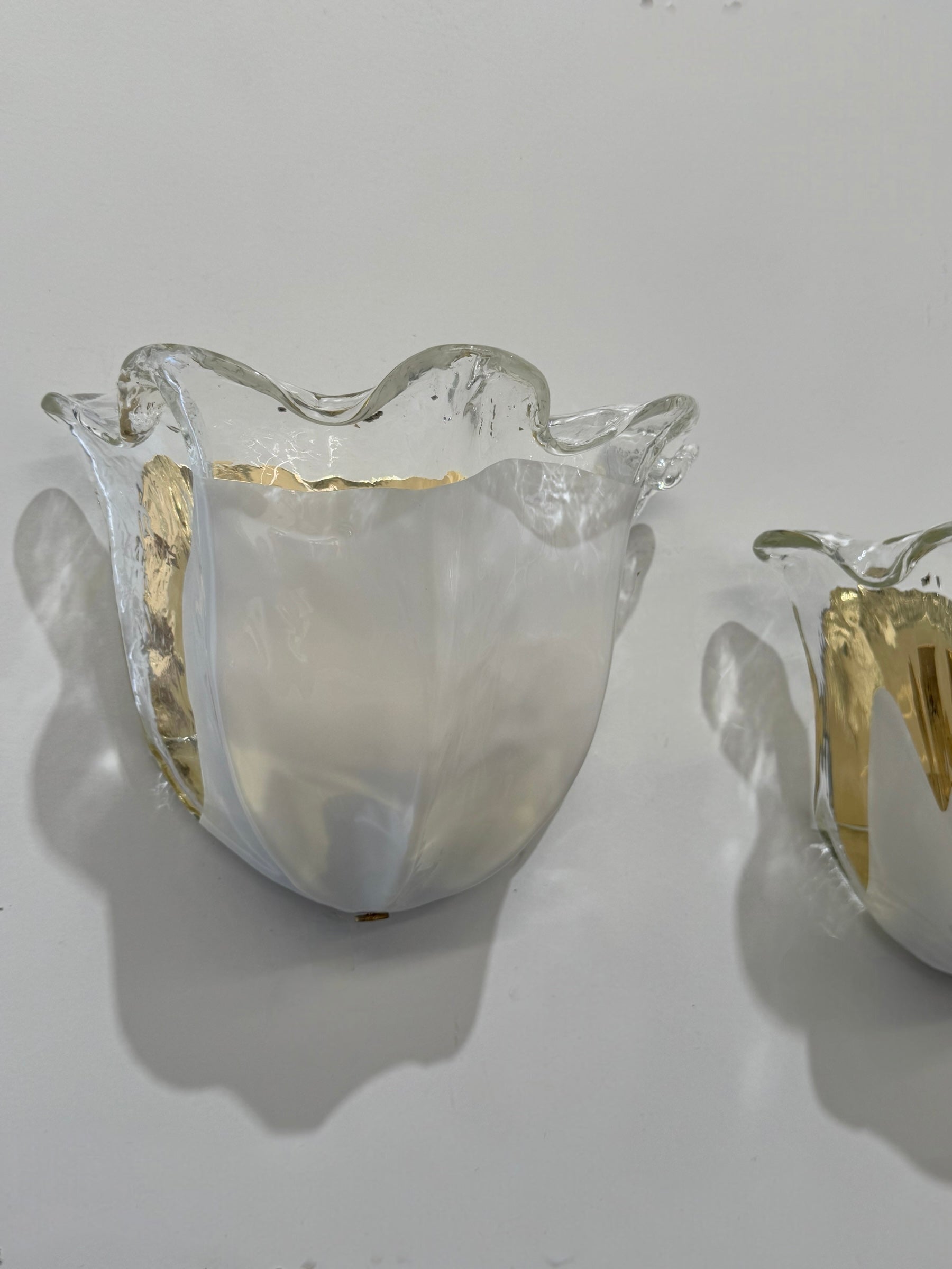 Gorgeous pair of Murano wall lights in opaque milky white and transparent glass. Beautiful tulip shape with scalloped trim. Produced by La Murrina. Brass hardware. Signed La Murrina. Sourced in Italy