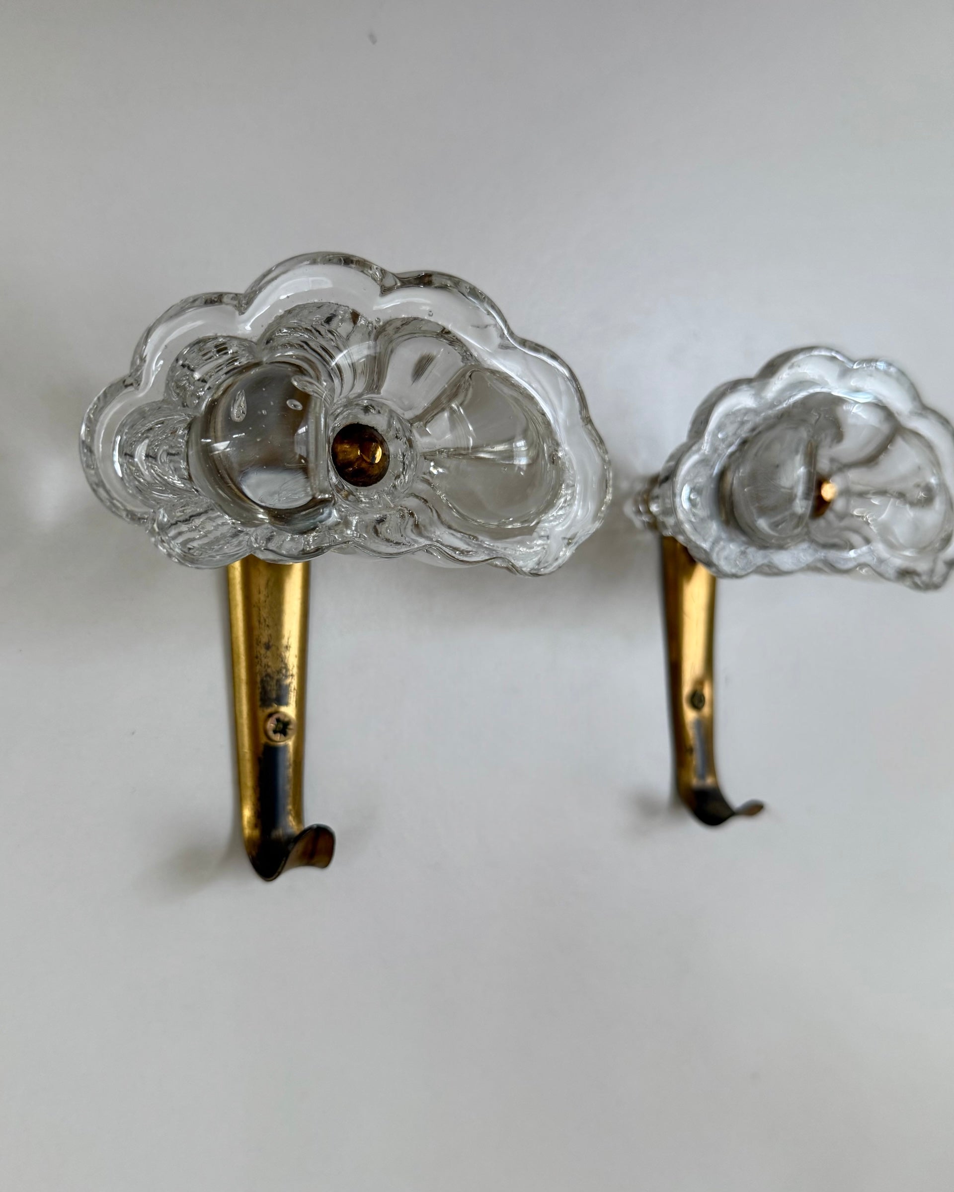 Elegant Italian Murano glass coat hook with brass hardware and scalloped glass. Beautiful filagree cut glass on brass hardware. A large size for this style.