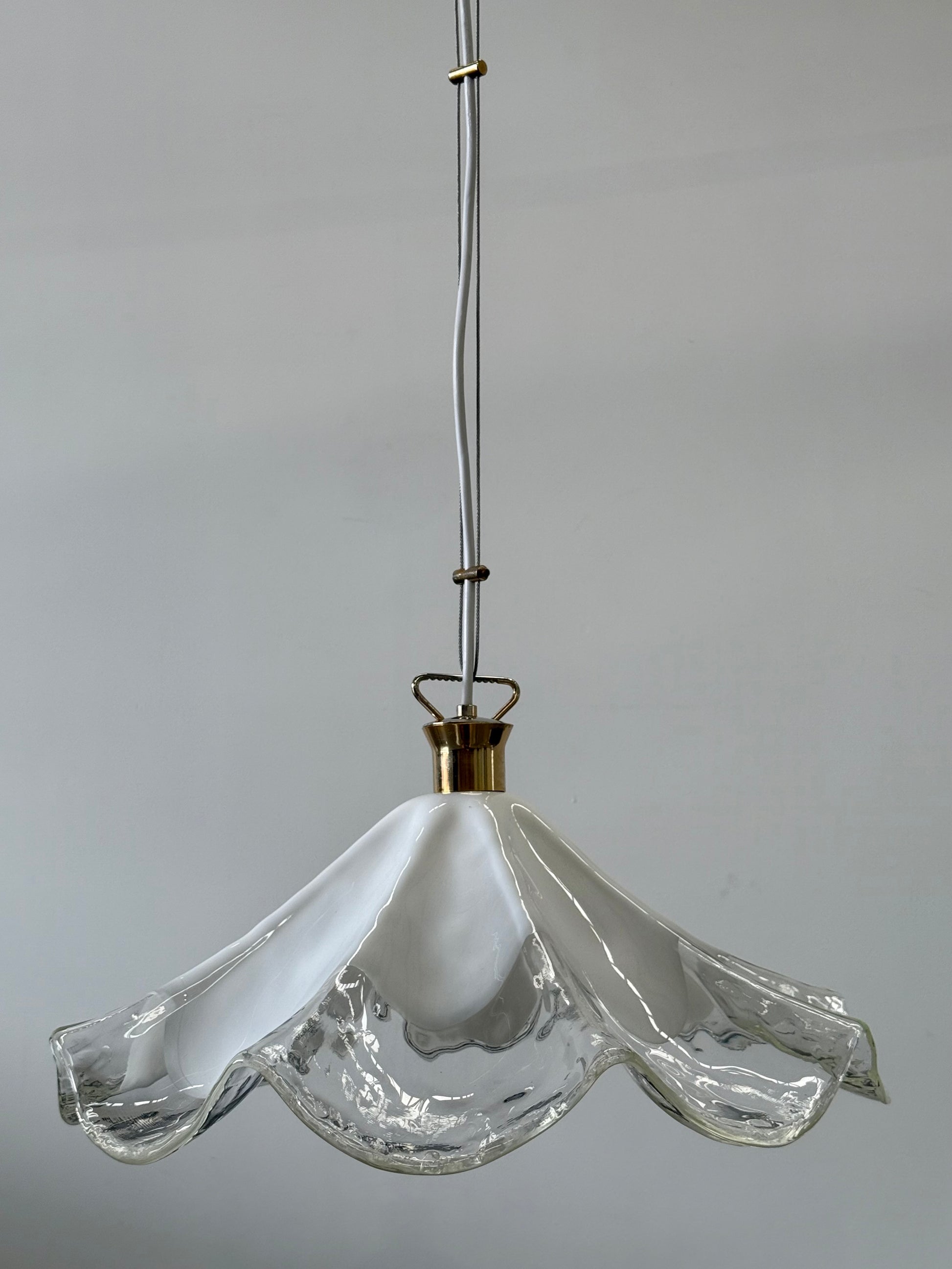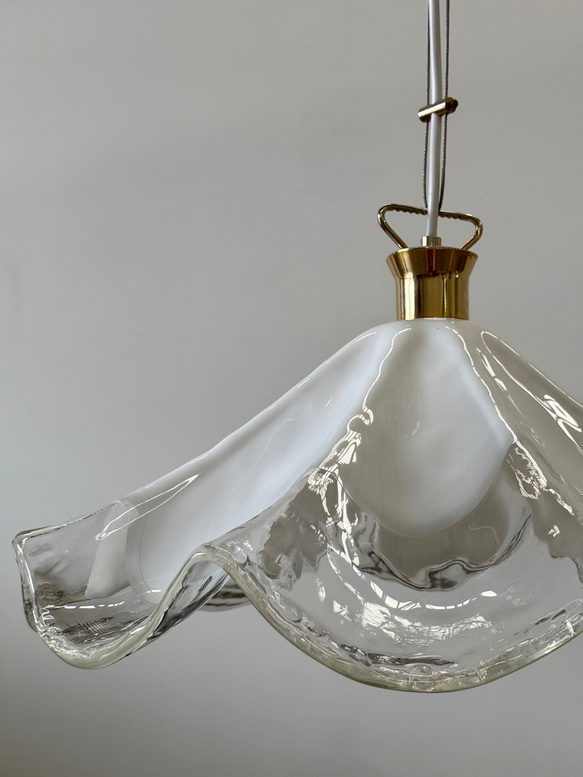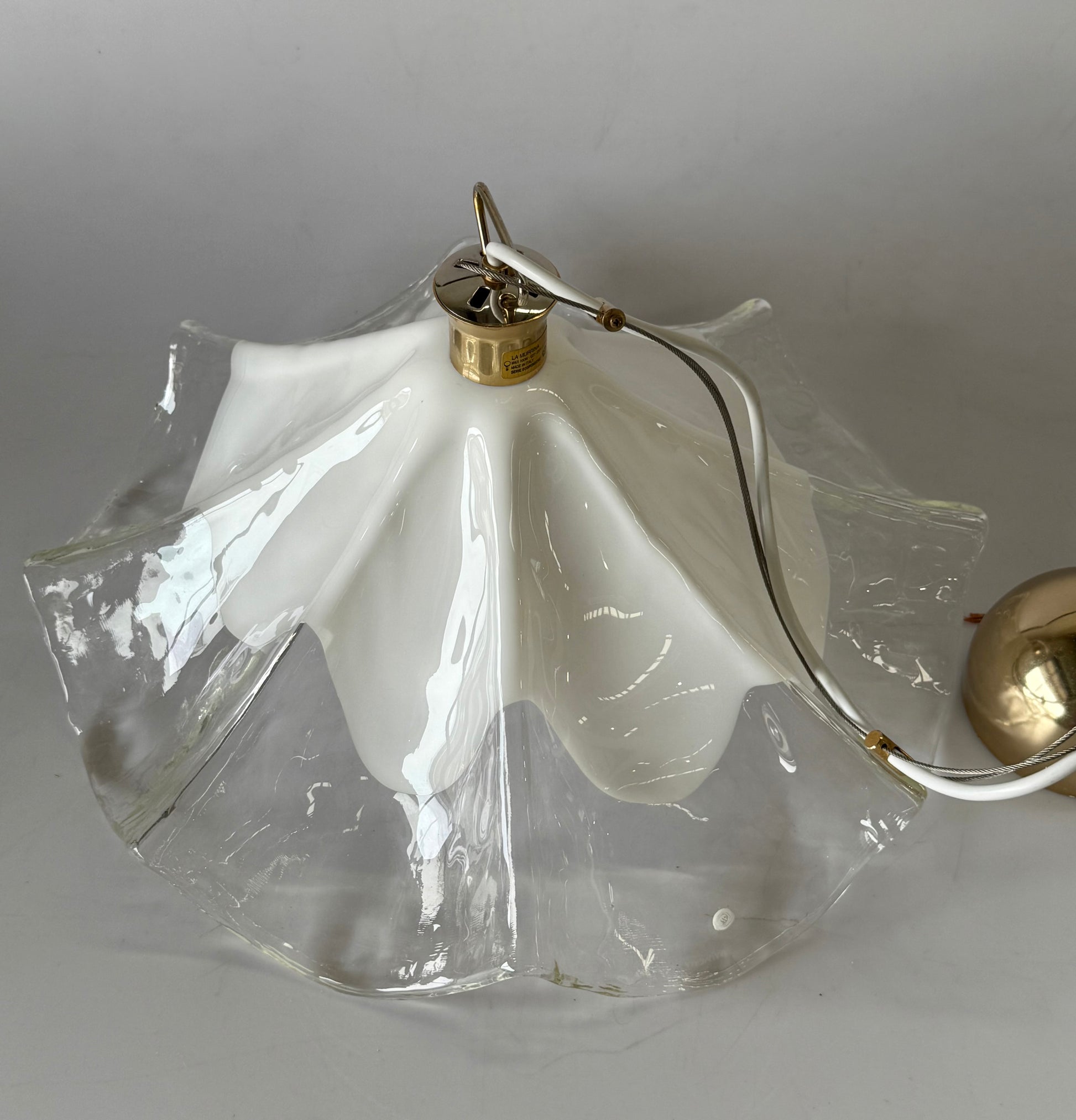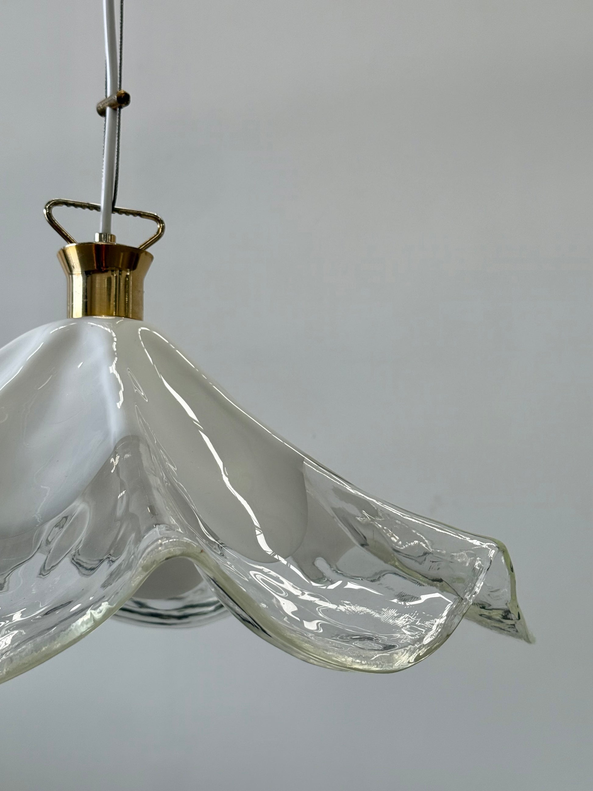 Stunning vintage Murano glass handkerchief pendant light. Circa 1990’s. Produced by La Murrina. Featuring a beautiful handblown glass shade in transparent and milky white glass. Brass hardware. Signed. The pendant has been rewired and is in excellent condition.