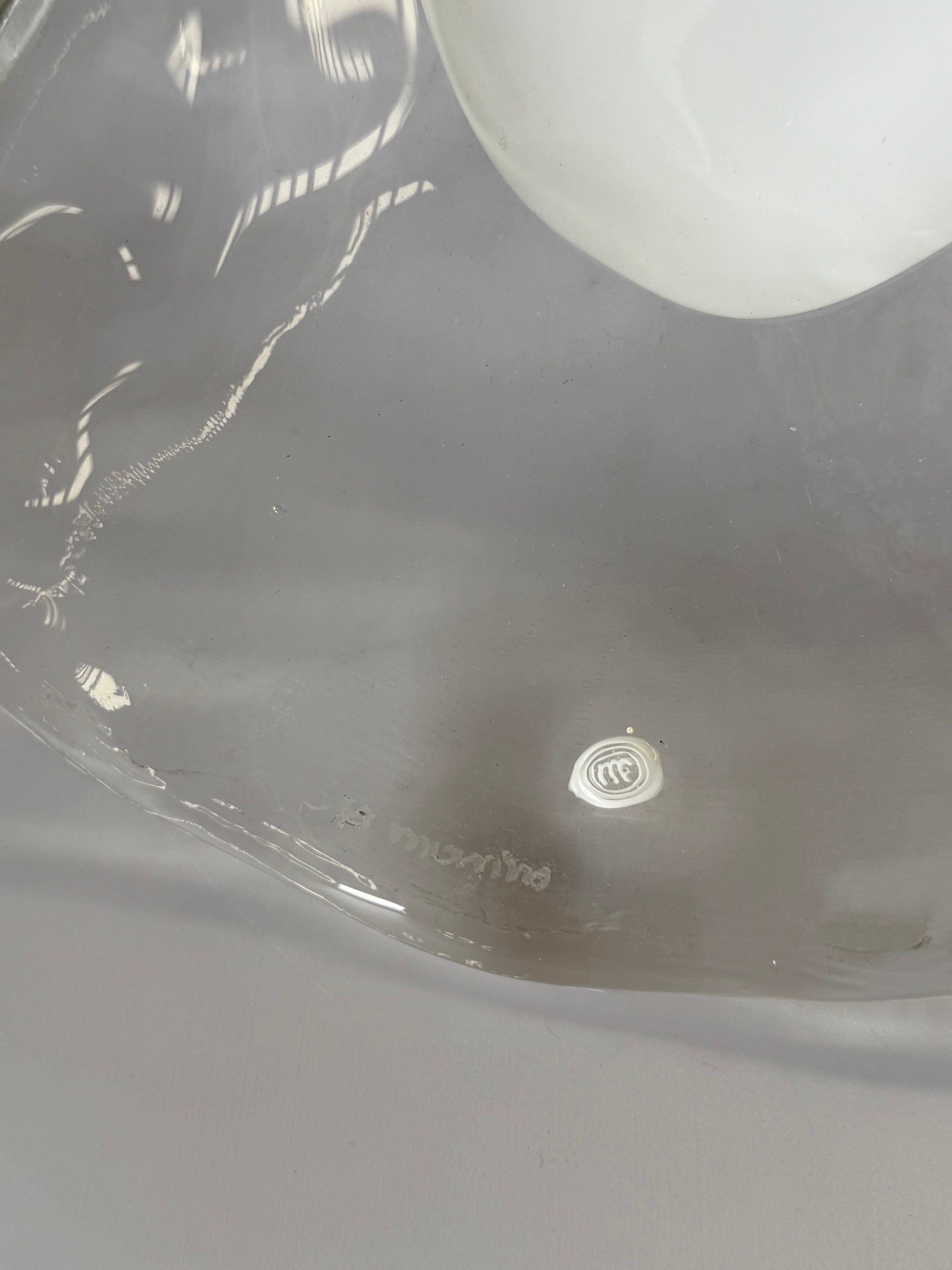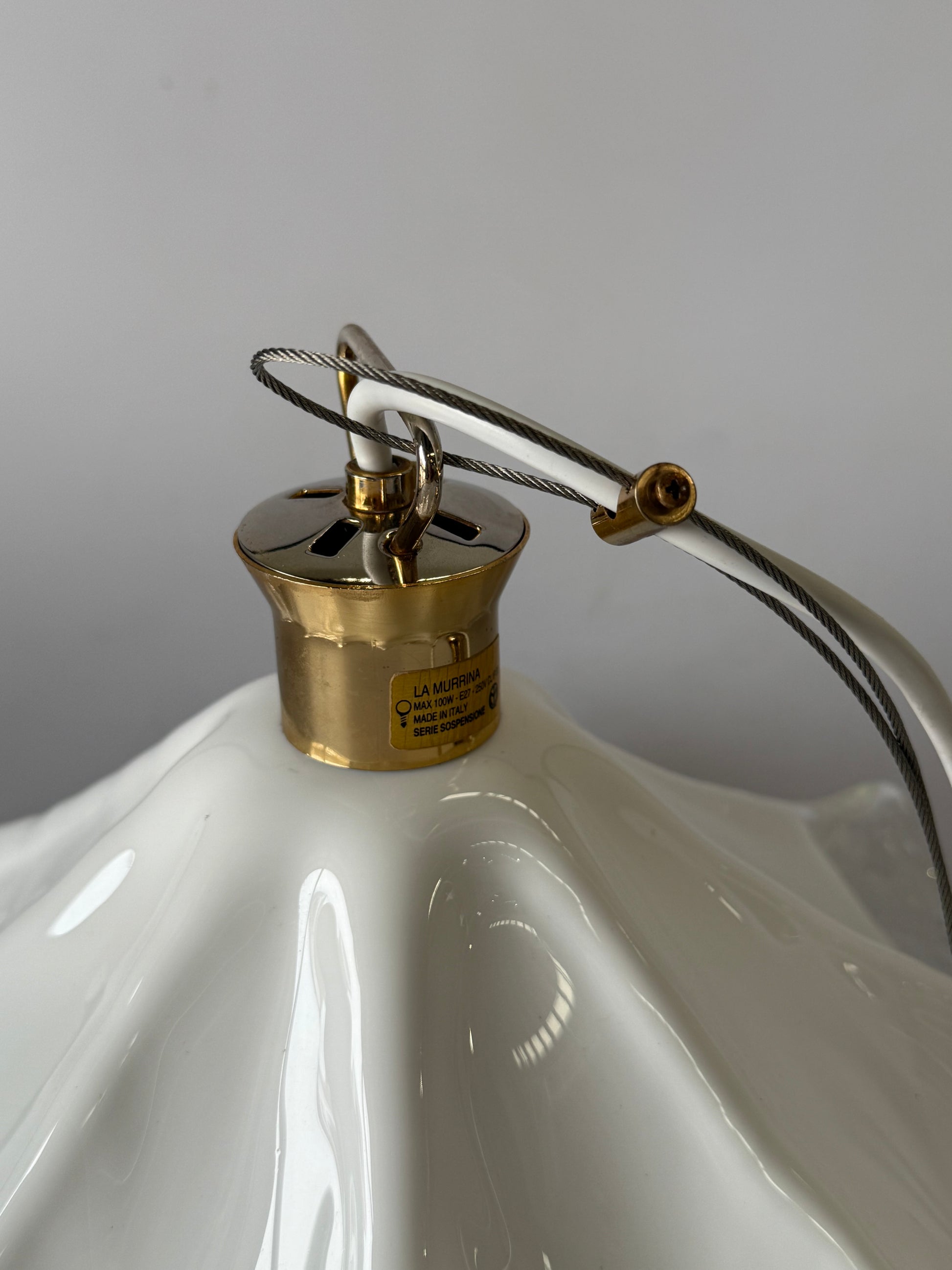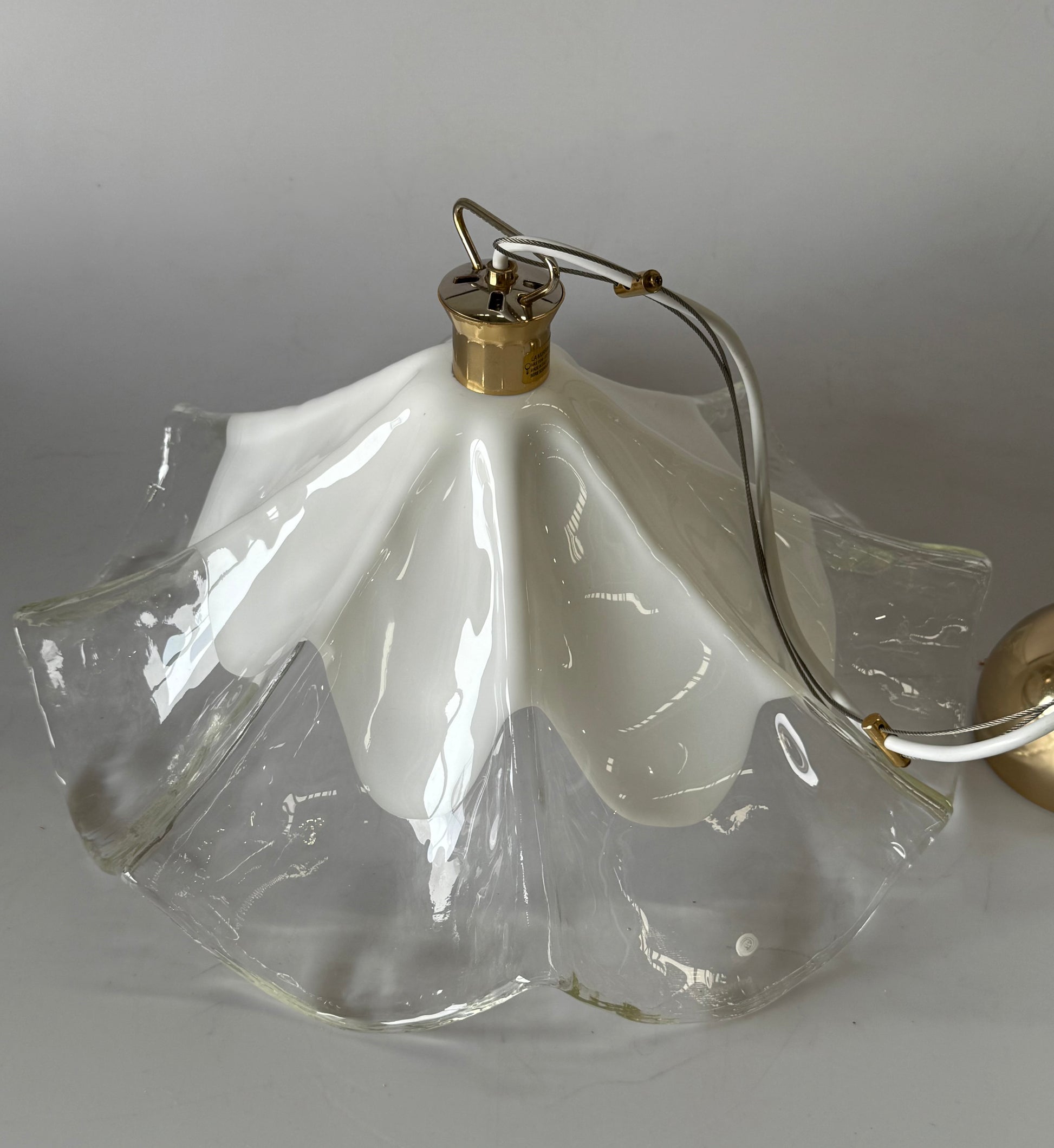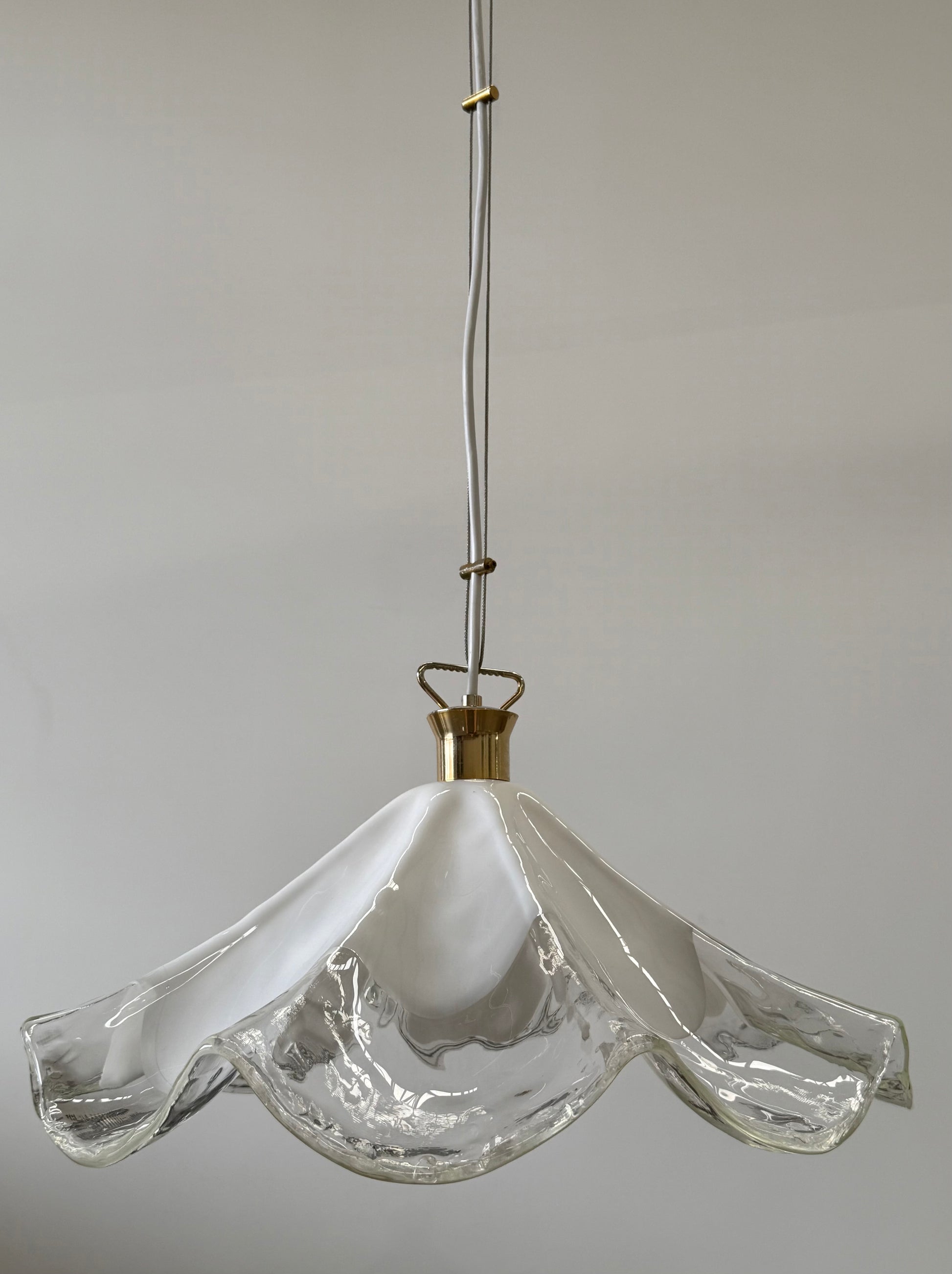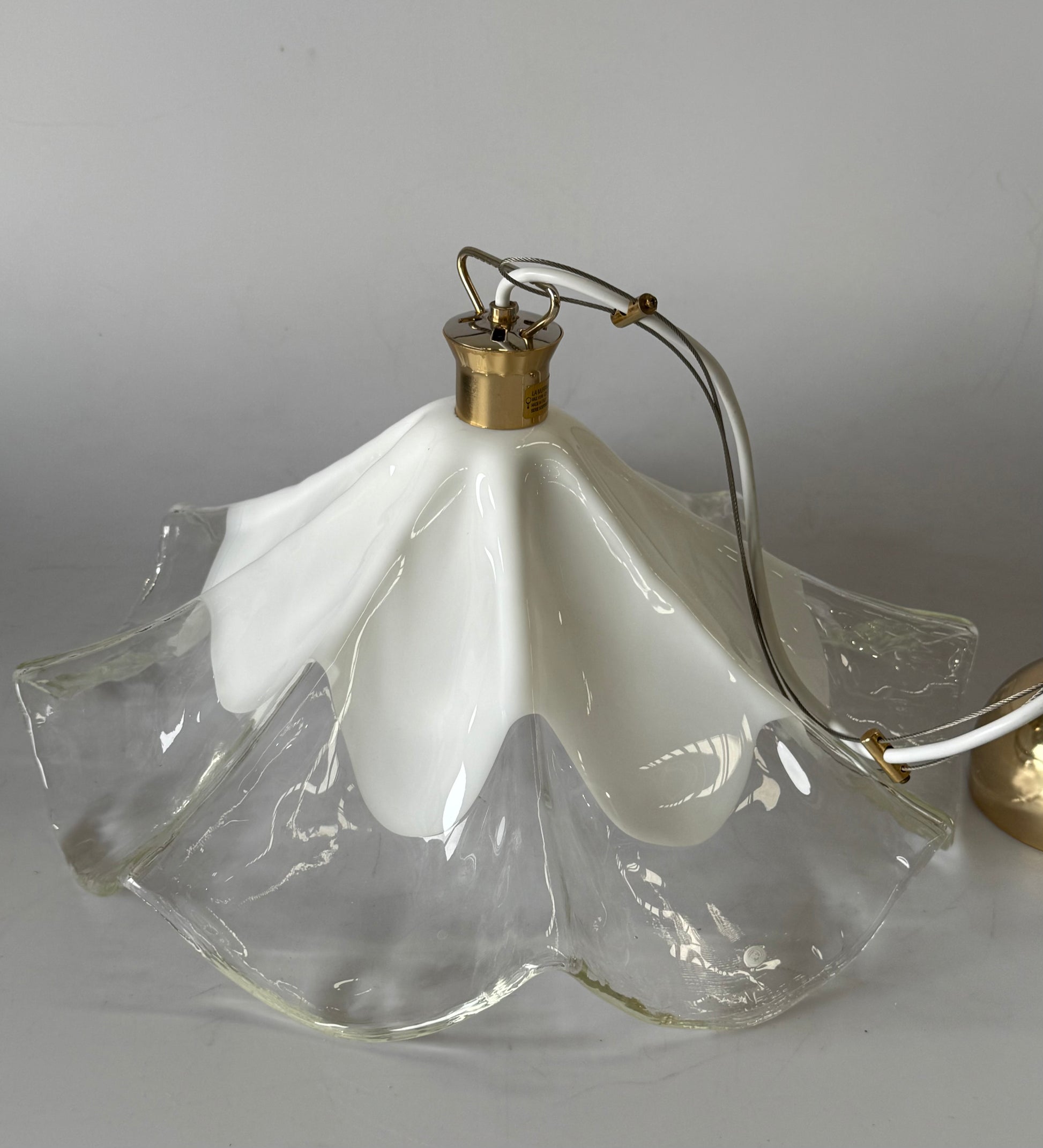 Stunning vintage Murano glass handkerchief pendant light. Circa 1990’s. Produced by La Murrina. Featuring a beautiful handblown glass shade in transparent and milky white glass. Brass hardware. Signed. The pendant has been rewired and is in excellent condition.