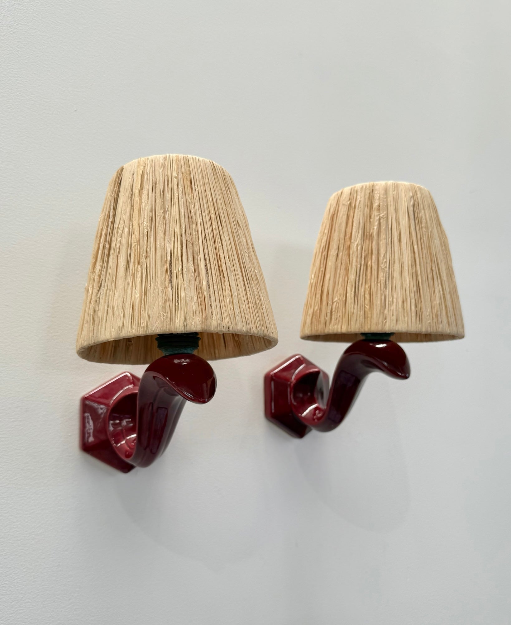 Pair of 1950’s French ceramic wall lights in burgundy with new custom made raffia shades. Sourced in France.