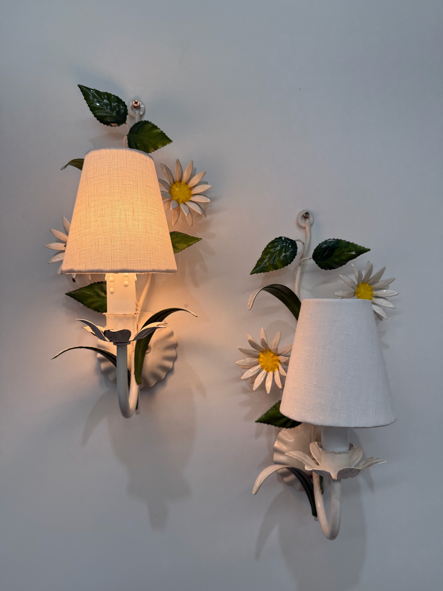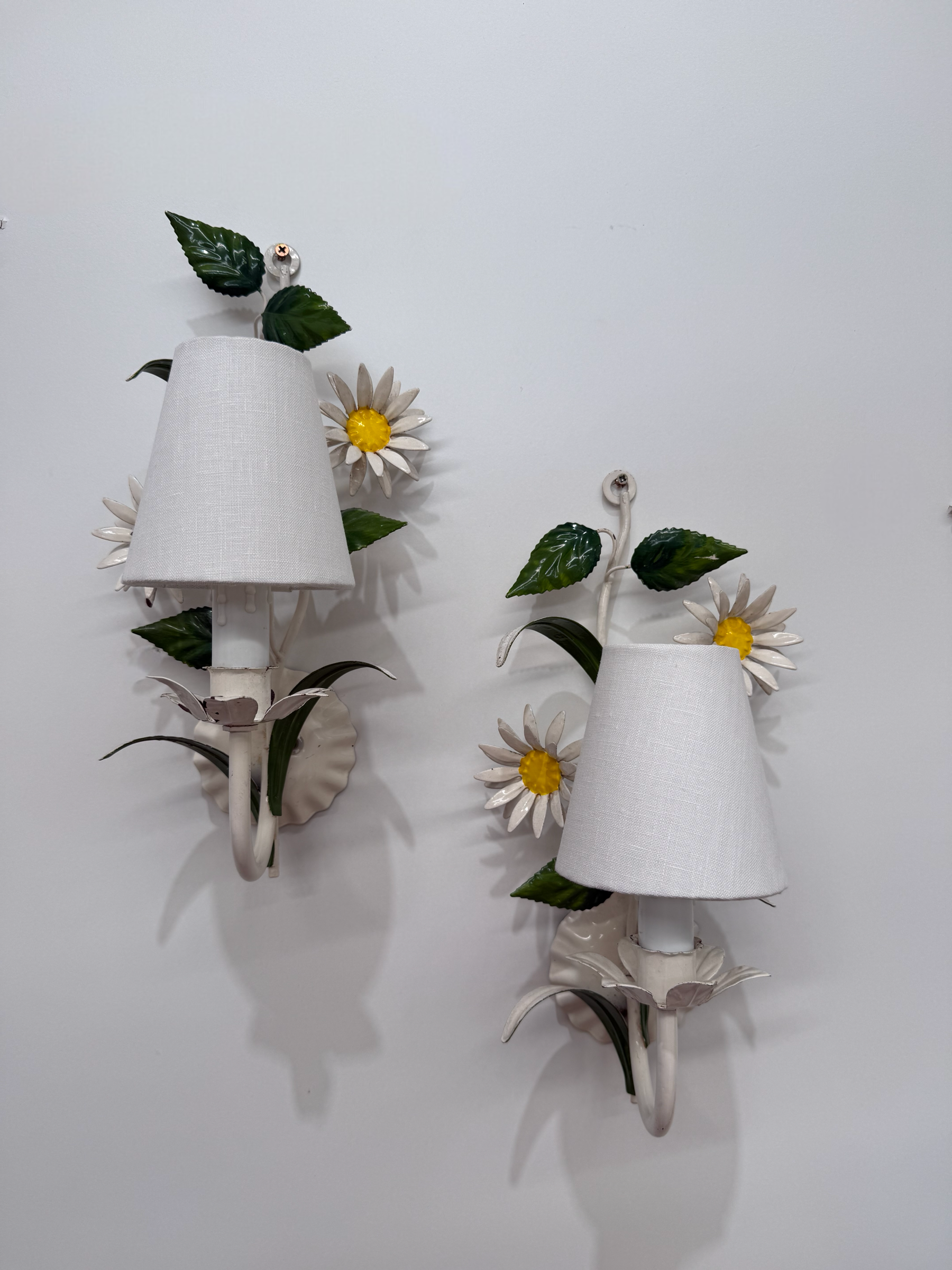Gorgeous pair of 1950’s French floral wall lights with new custom made linen shades. Painted metal decorative floral design. Sourced in France.