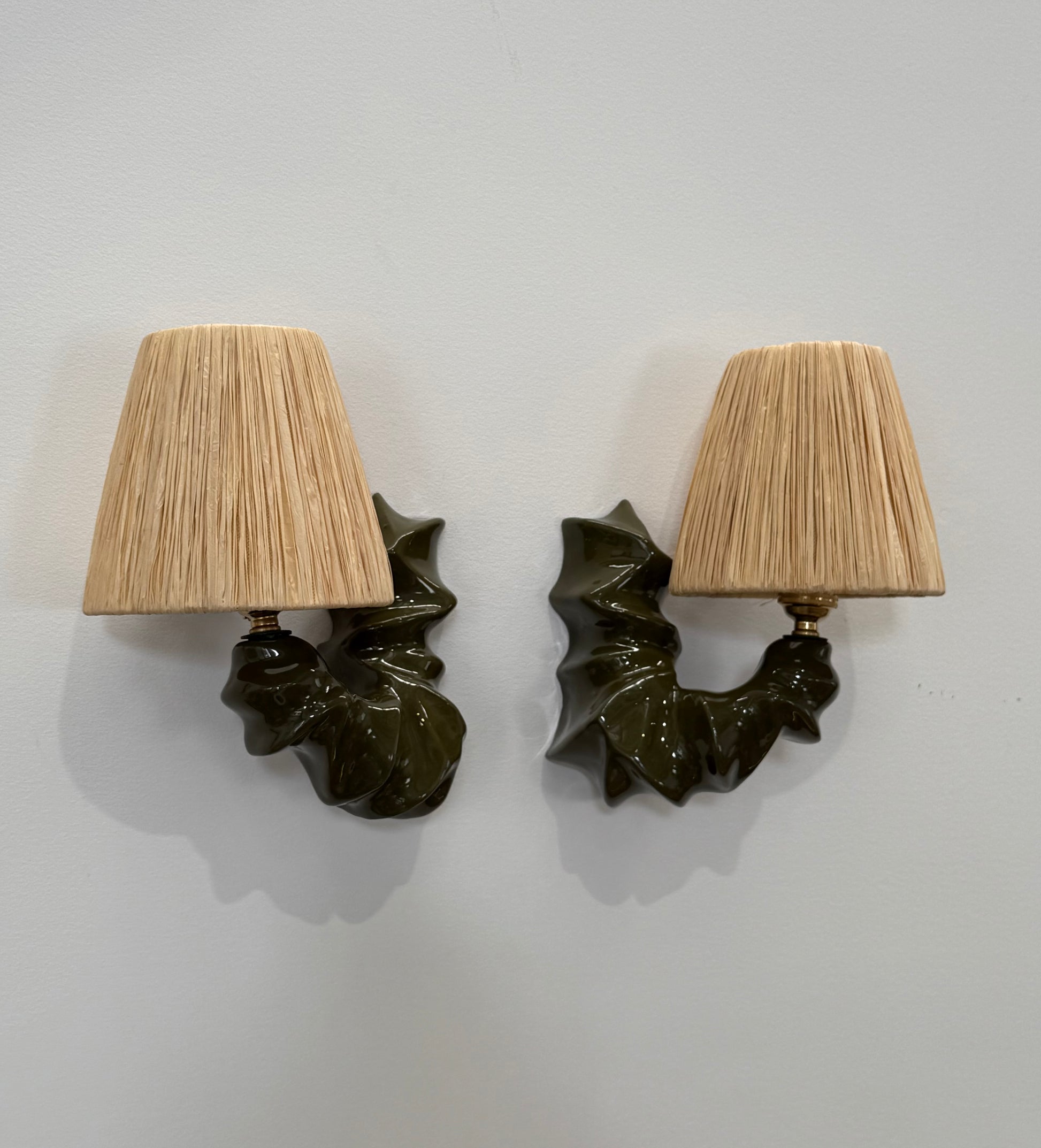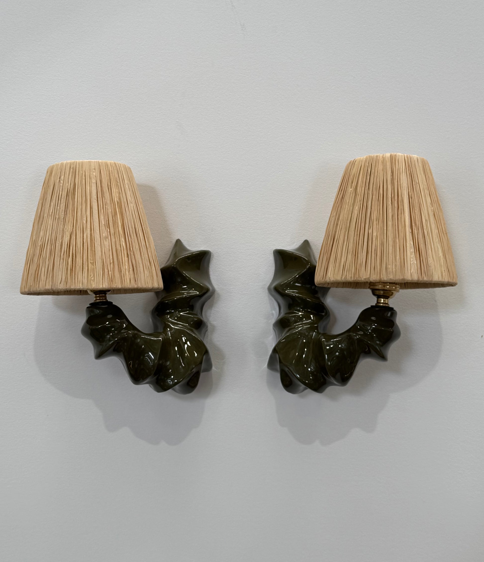 Pair of ARCO Ceramic & Raffia Wall Lights - Forest Green