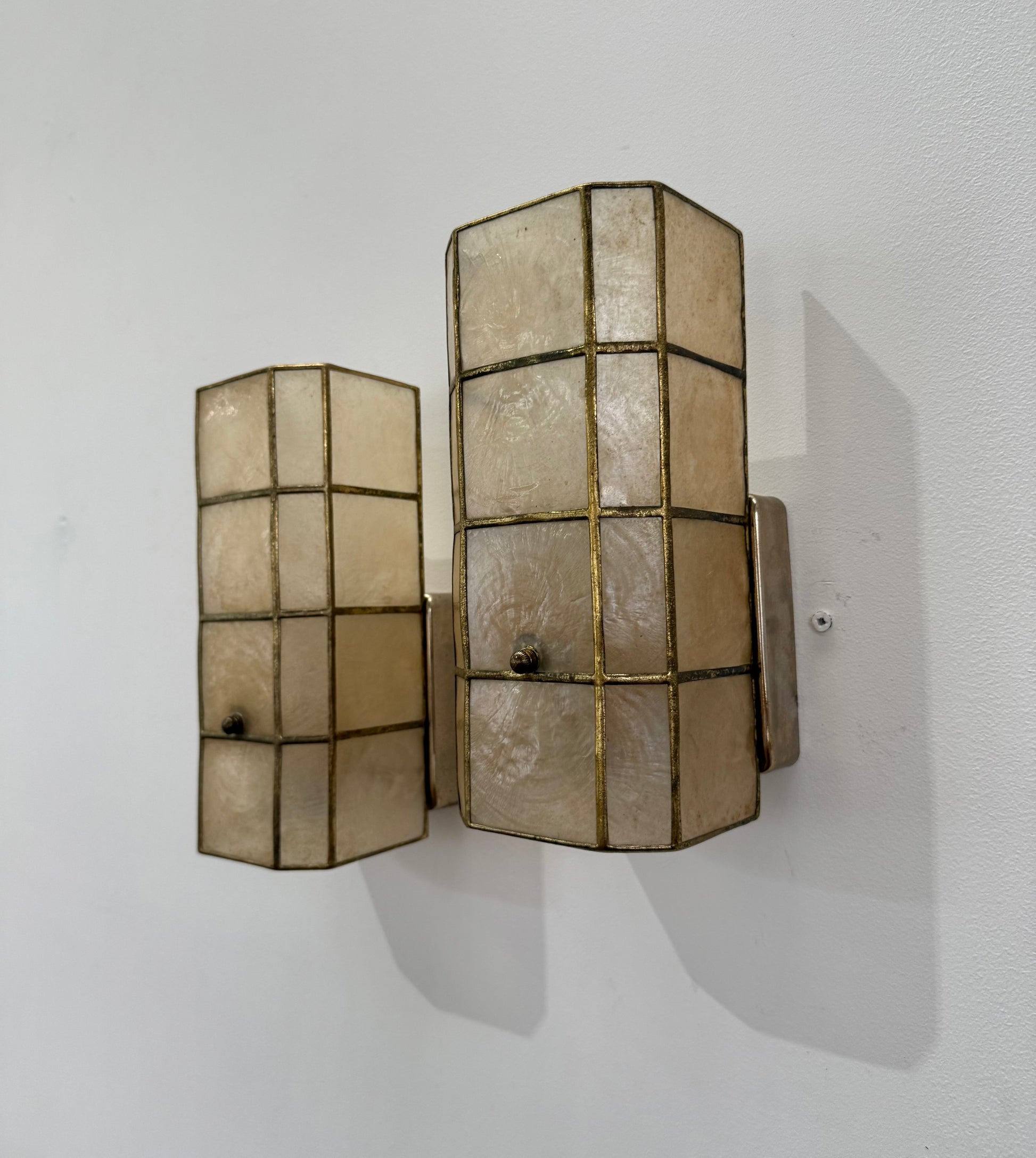 Lovely French vintage mother of pearl wall lights with brass hardware. Circa 1960’s. A mother of pearl frame sits on a brass fitting and screws into the wall. A B22 globe is required for each light. Sourced in France