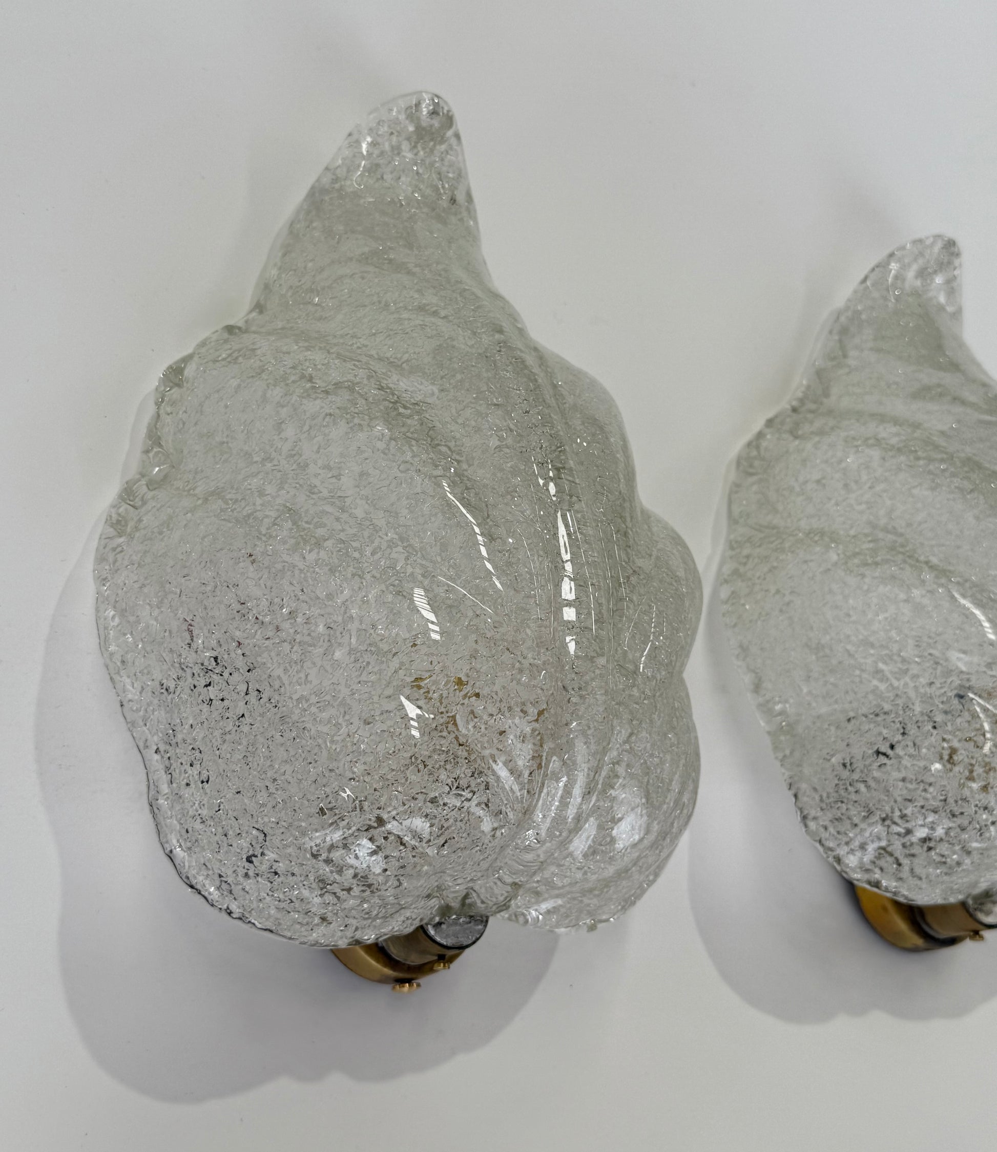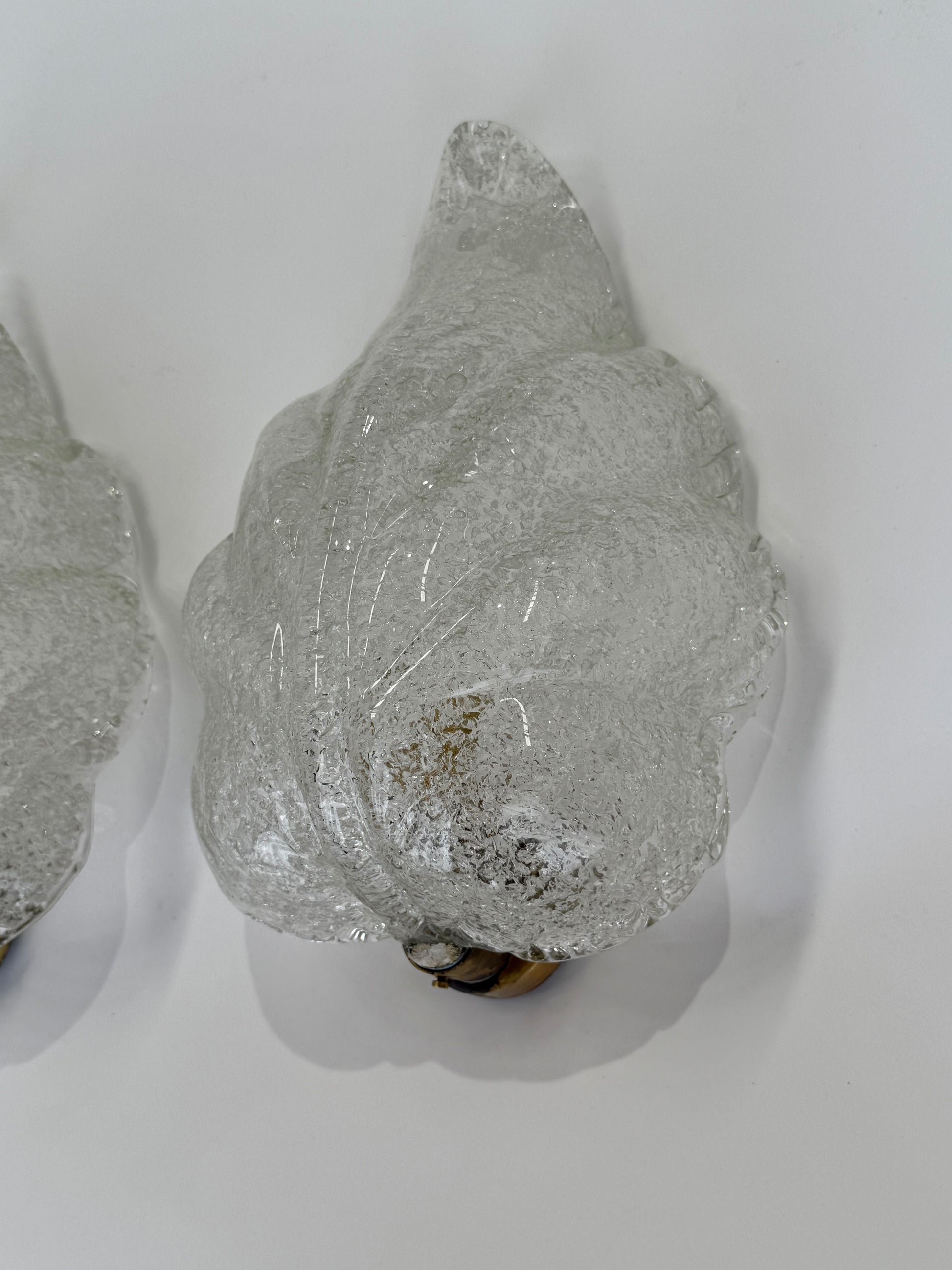 Gorgeous pair of large transparent Murano glass wall lights in the shape of a leaf by Barovier. Brass hardware. Small granules of glass line the inside of the light, known as "graniglia" effect. Sourced in Italy
