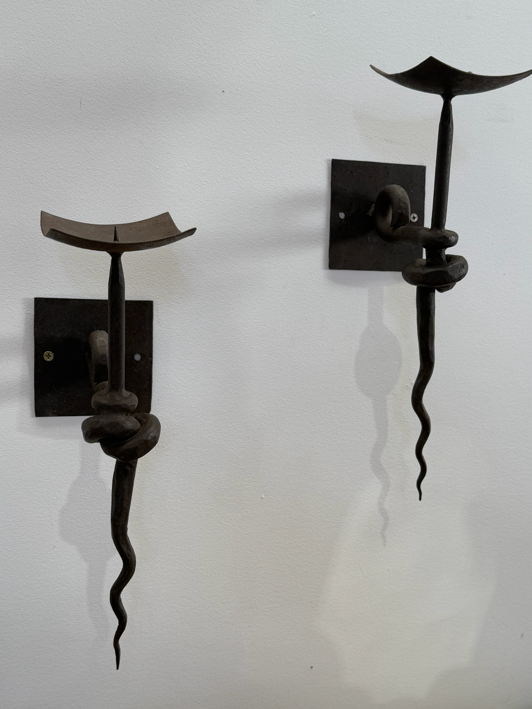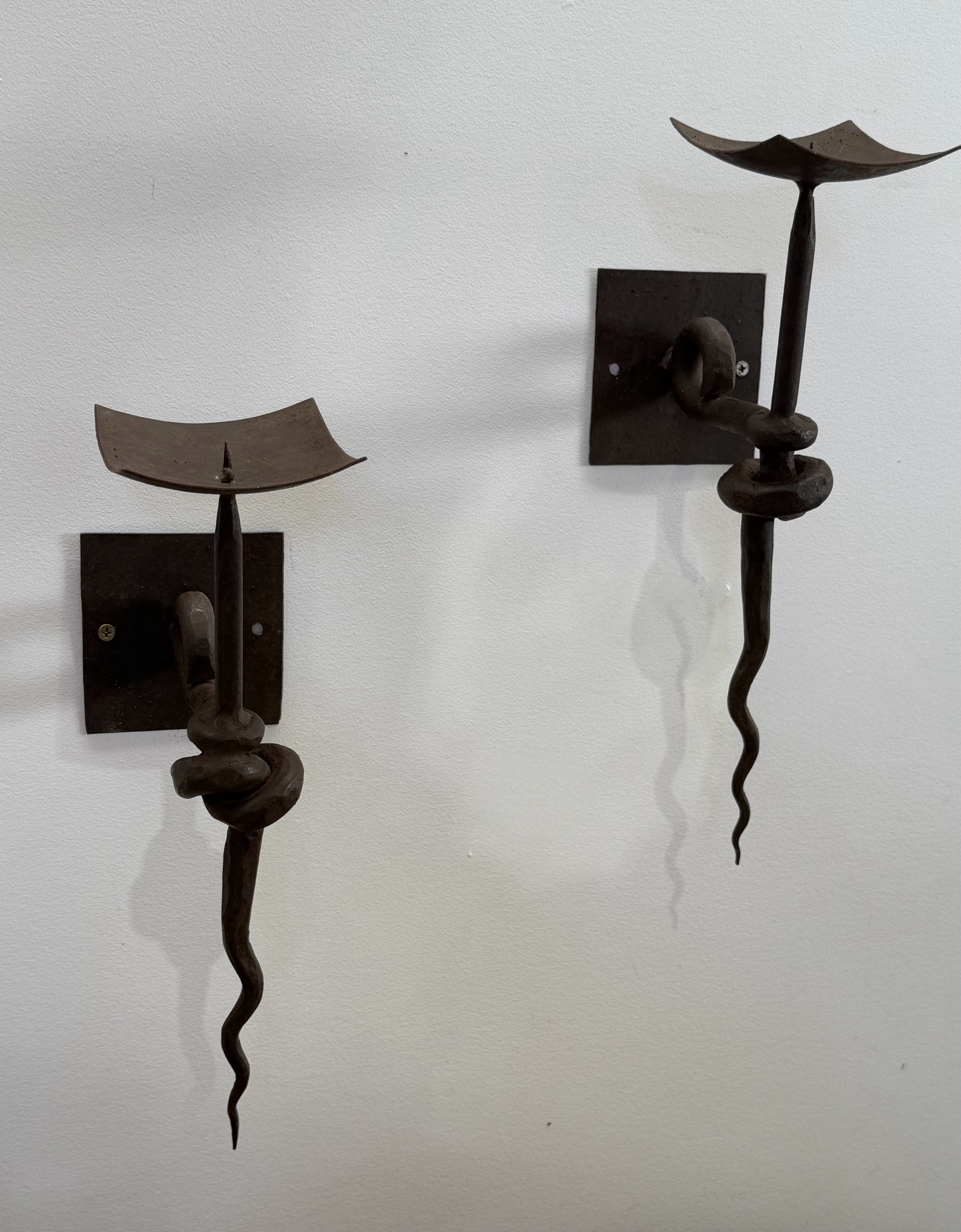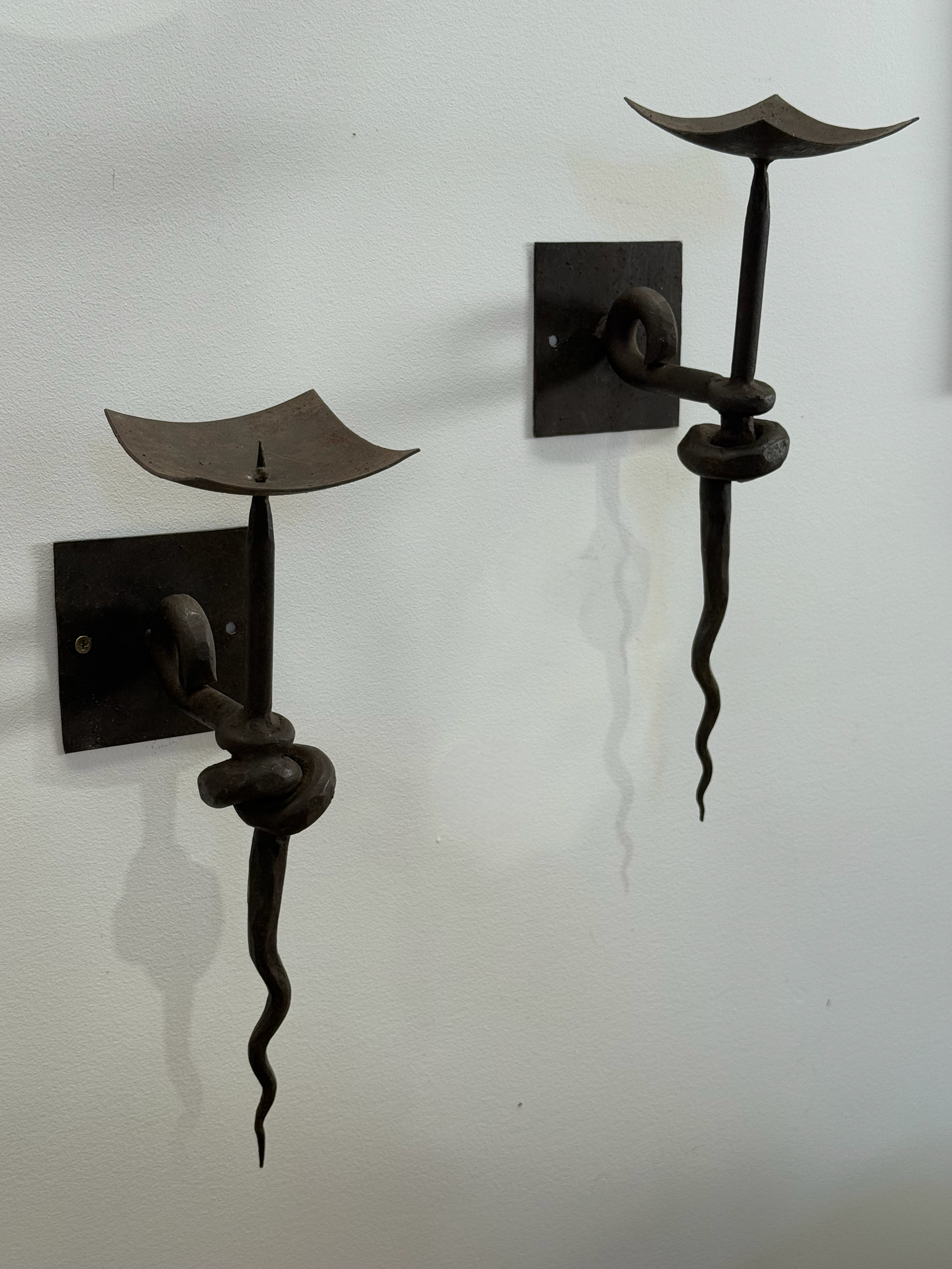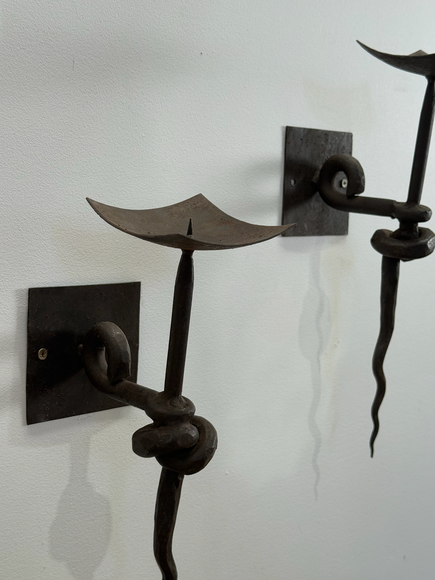 Pair of 1950’s French wrought iron brutalist wall mounted candle holders, attributed to the artists from Atelier Marolles. Decorative handmade pieces. Sourced in France.