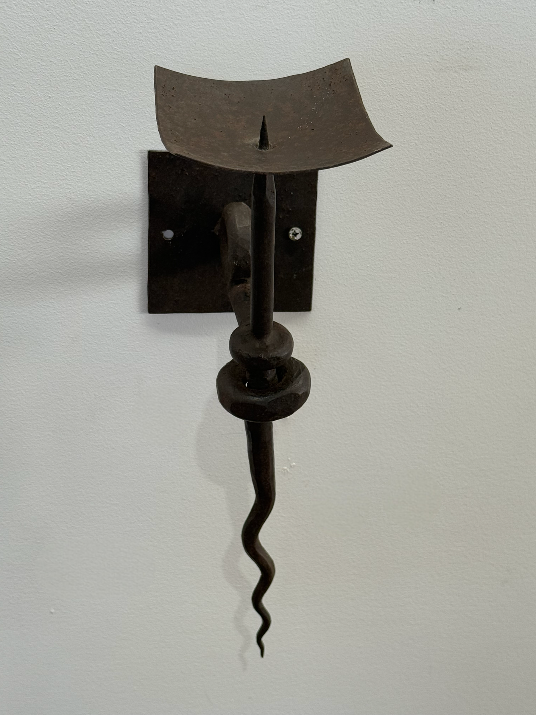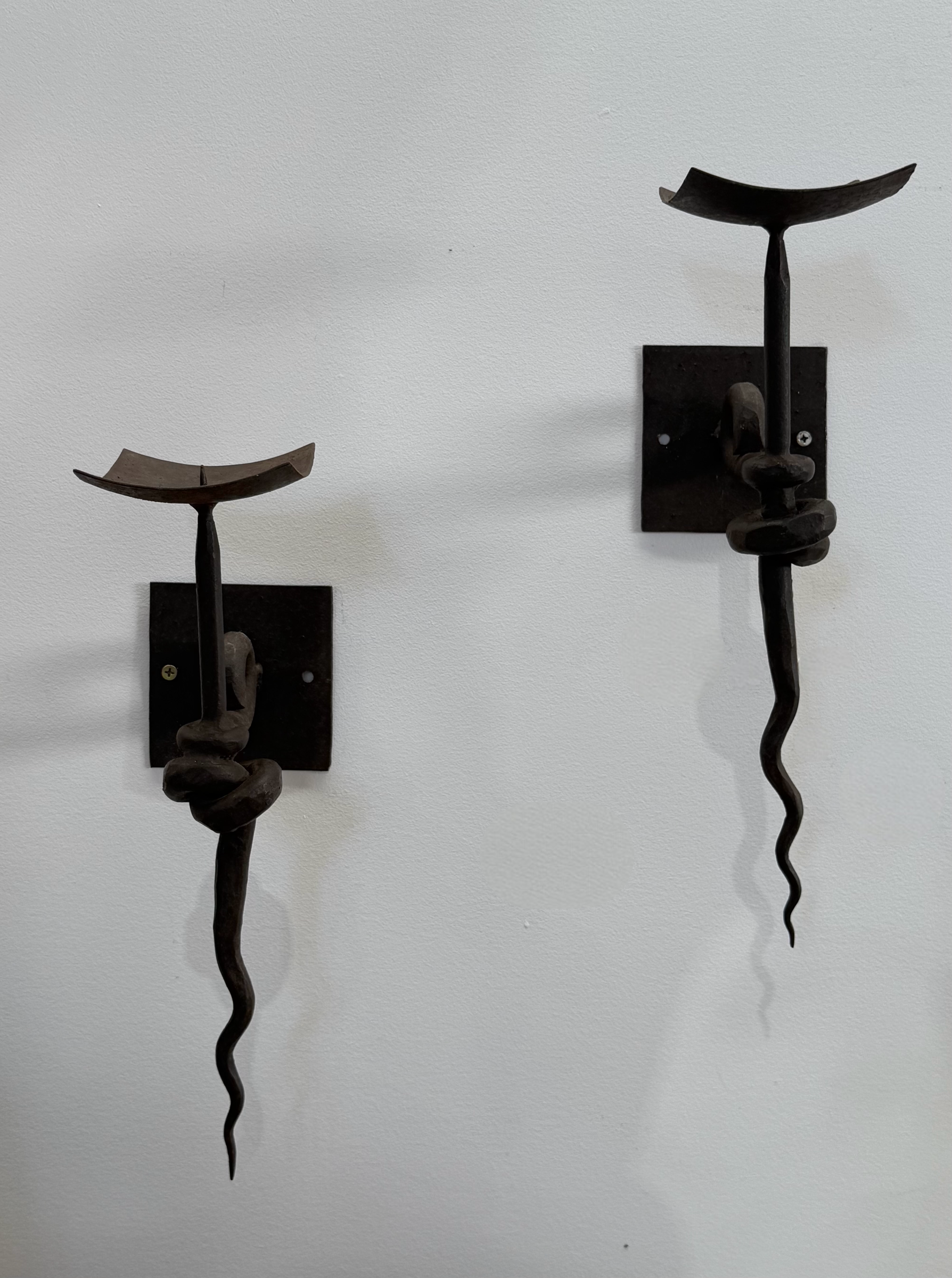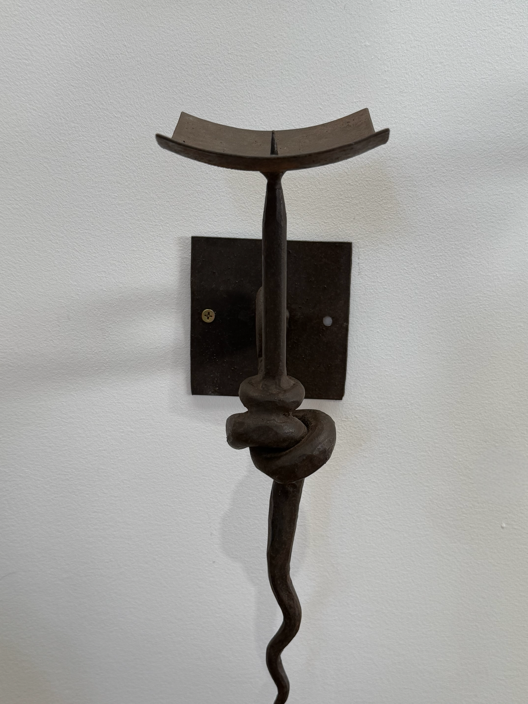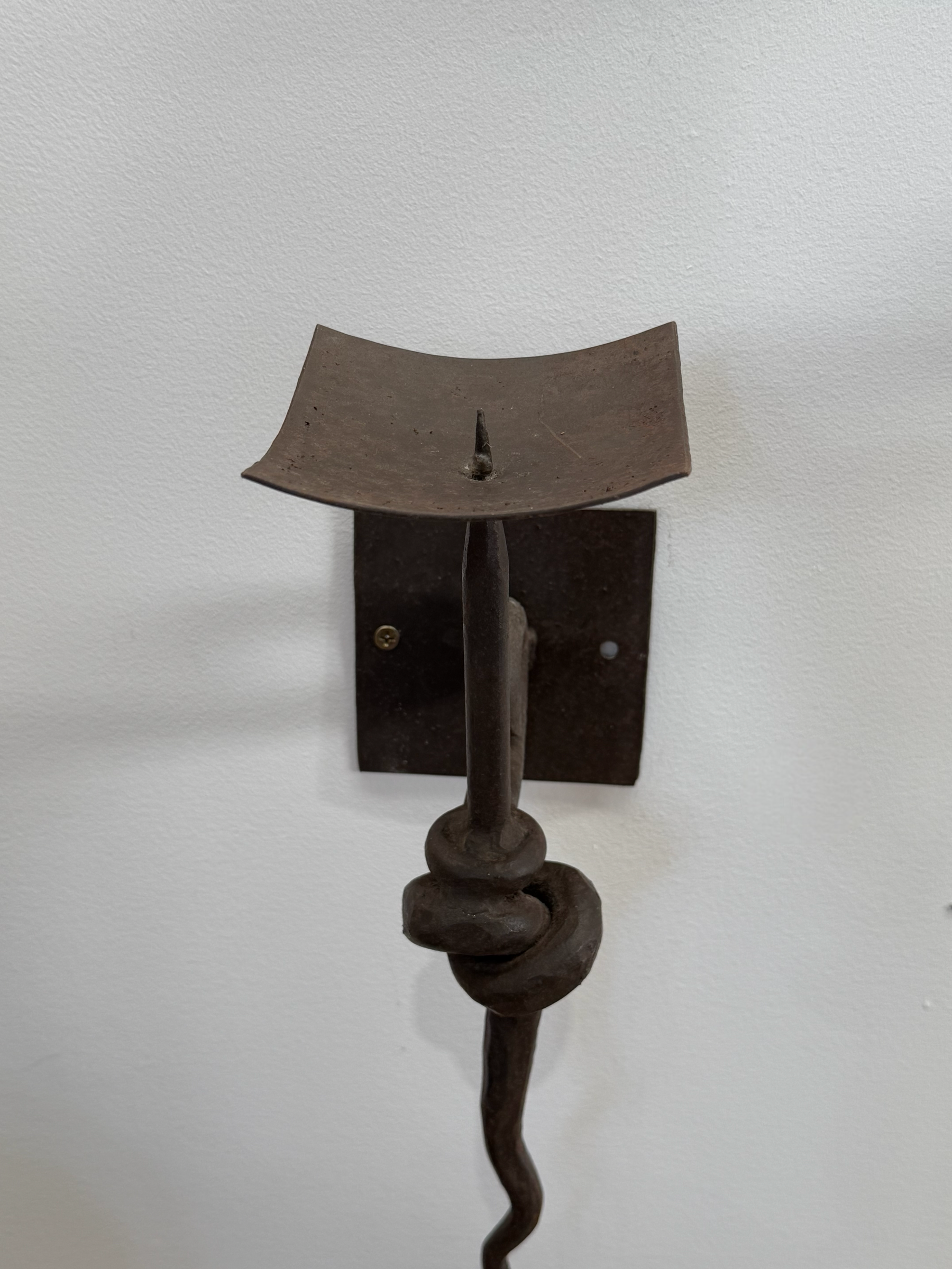 Pair of 1950’s French wrought iron brutalist wall mounted candle holders, attributed to the artists from Atelier Marolles. Decorative handmade pieces. Sourced in France.