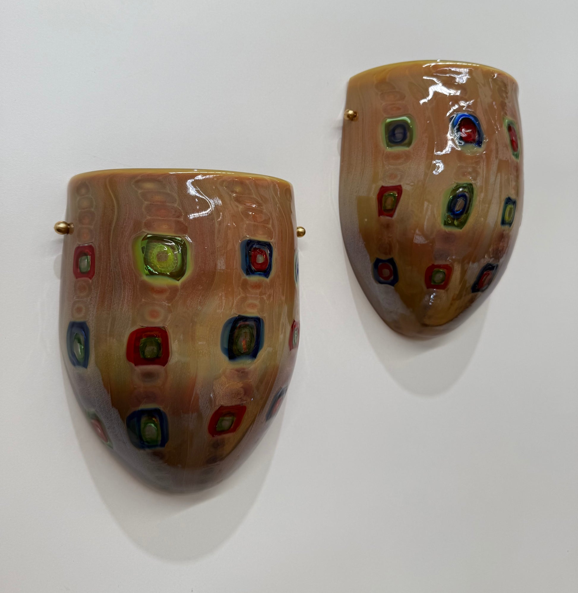 Unique pair of Murano glass multi coloured wall lights with brass hardware. Circa 1980’s. Sourced in Italy