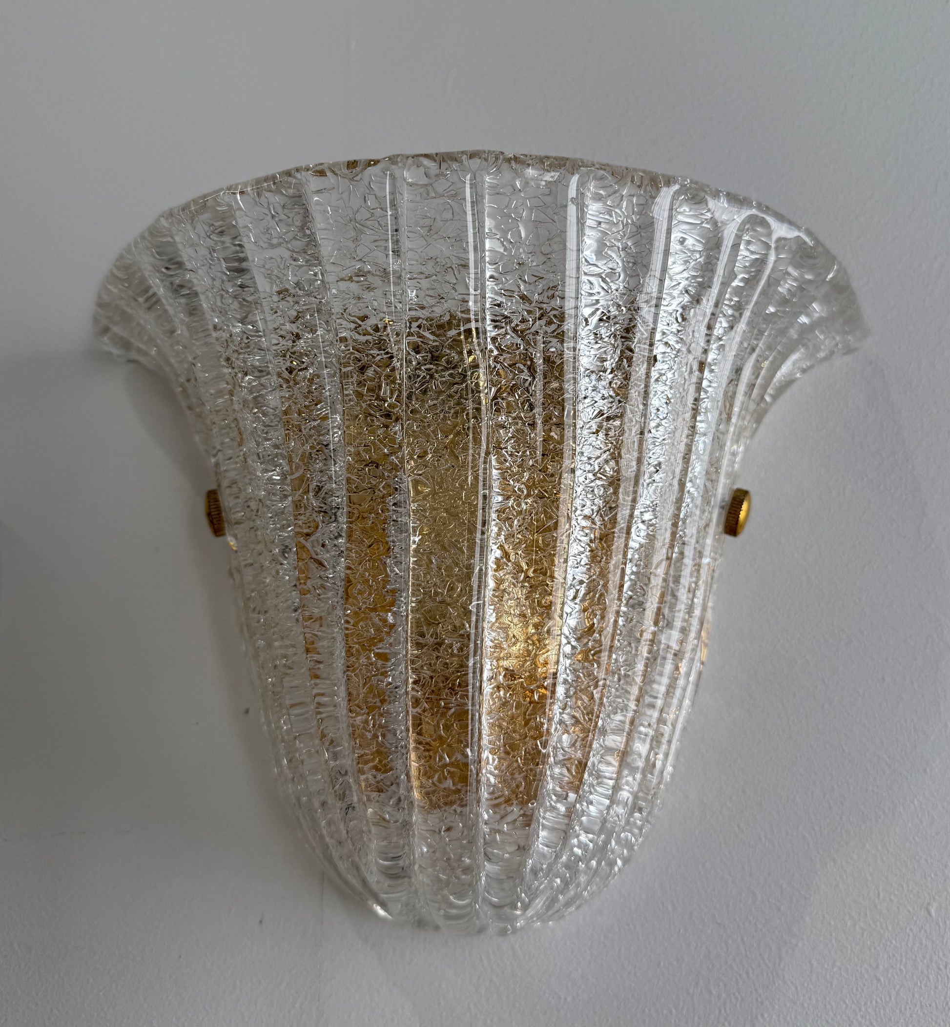Gorgeous pair of Murano glass wall sconce with brass hardware by Barovier & Toso. Featuring a ribbed exterior and trim, there are small crystal glass pieces (Graniglia) on the inner side of the glass shade. Sourced in Italy