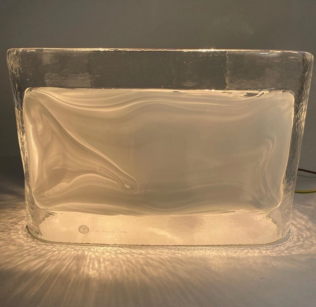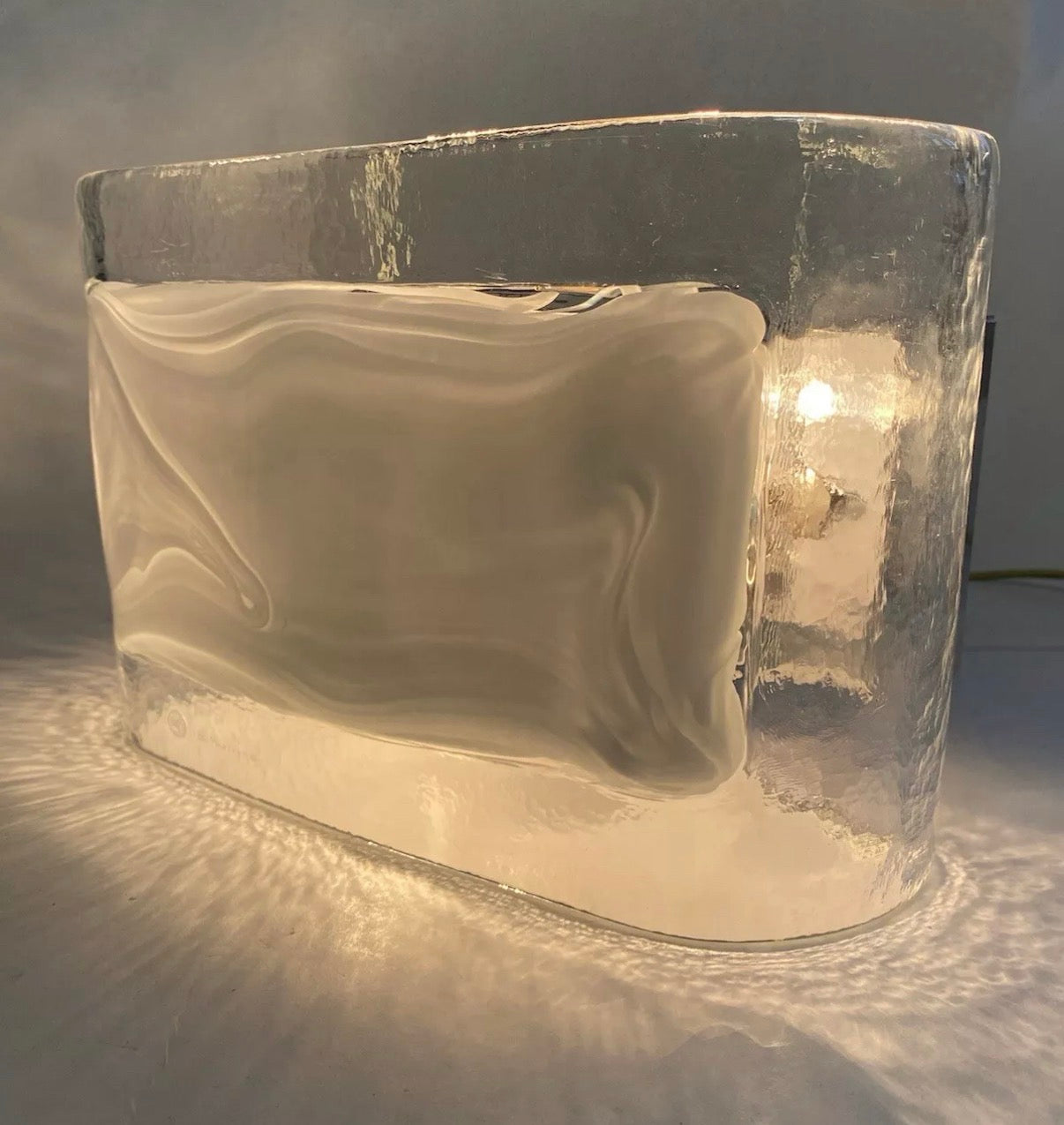 Murano glass wall lights produced by La Murrina. Circa 1980’s. A thick curved glass shade in a transparent glass with a milky white panel sits on a brass fitting with two E14 globes. Signed La Murrina. Sourced in Italy