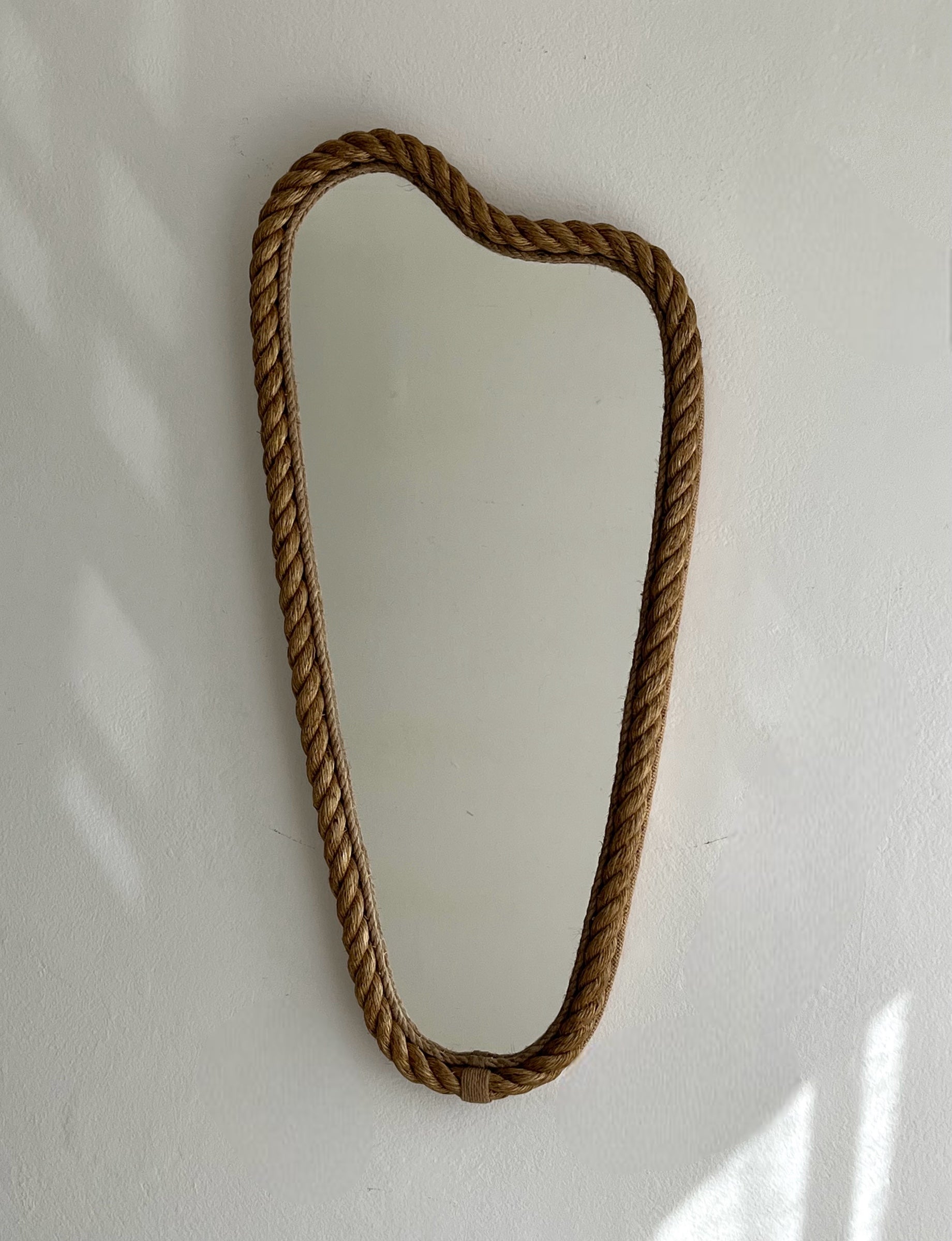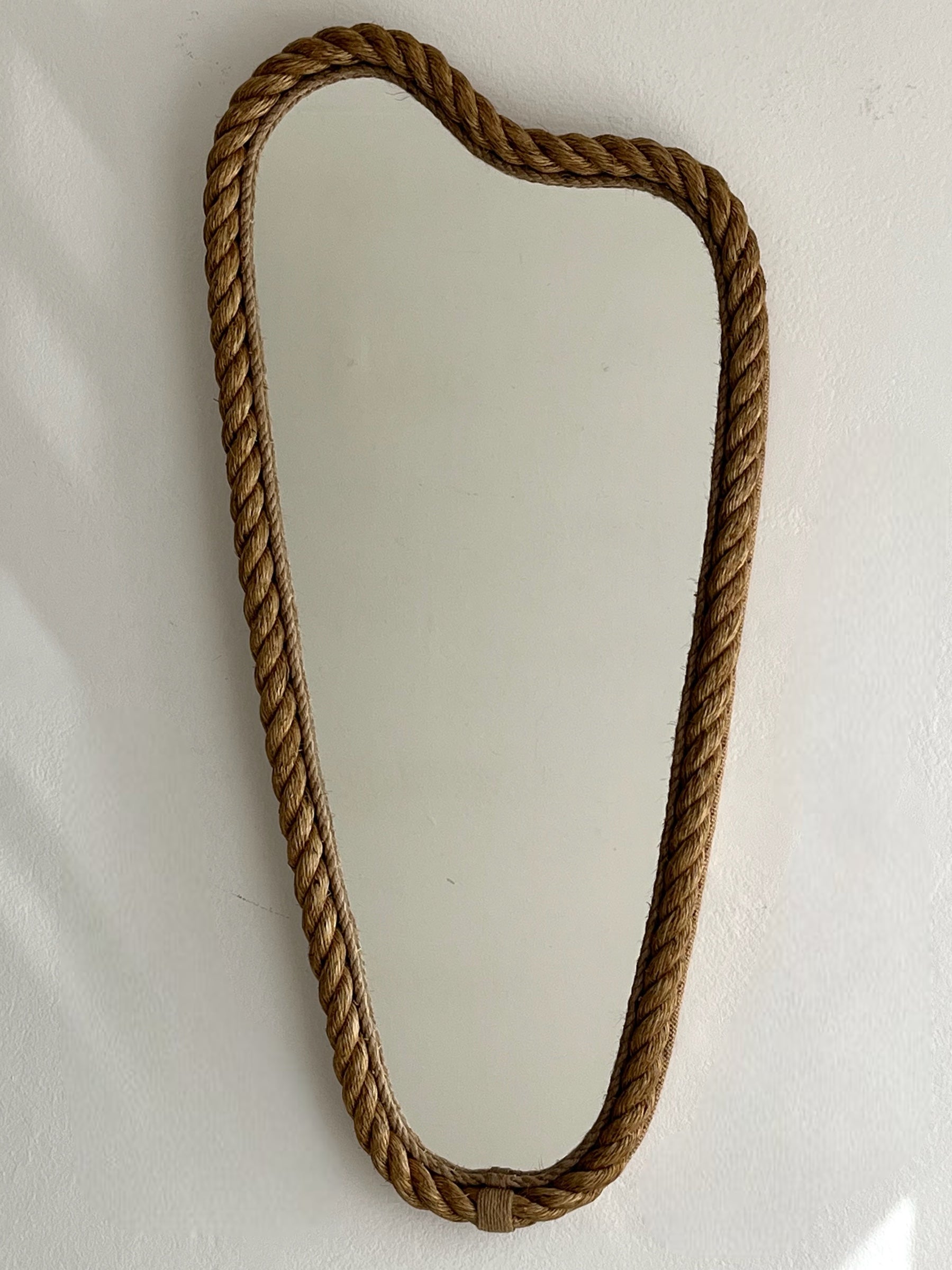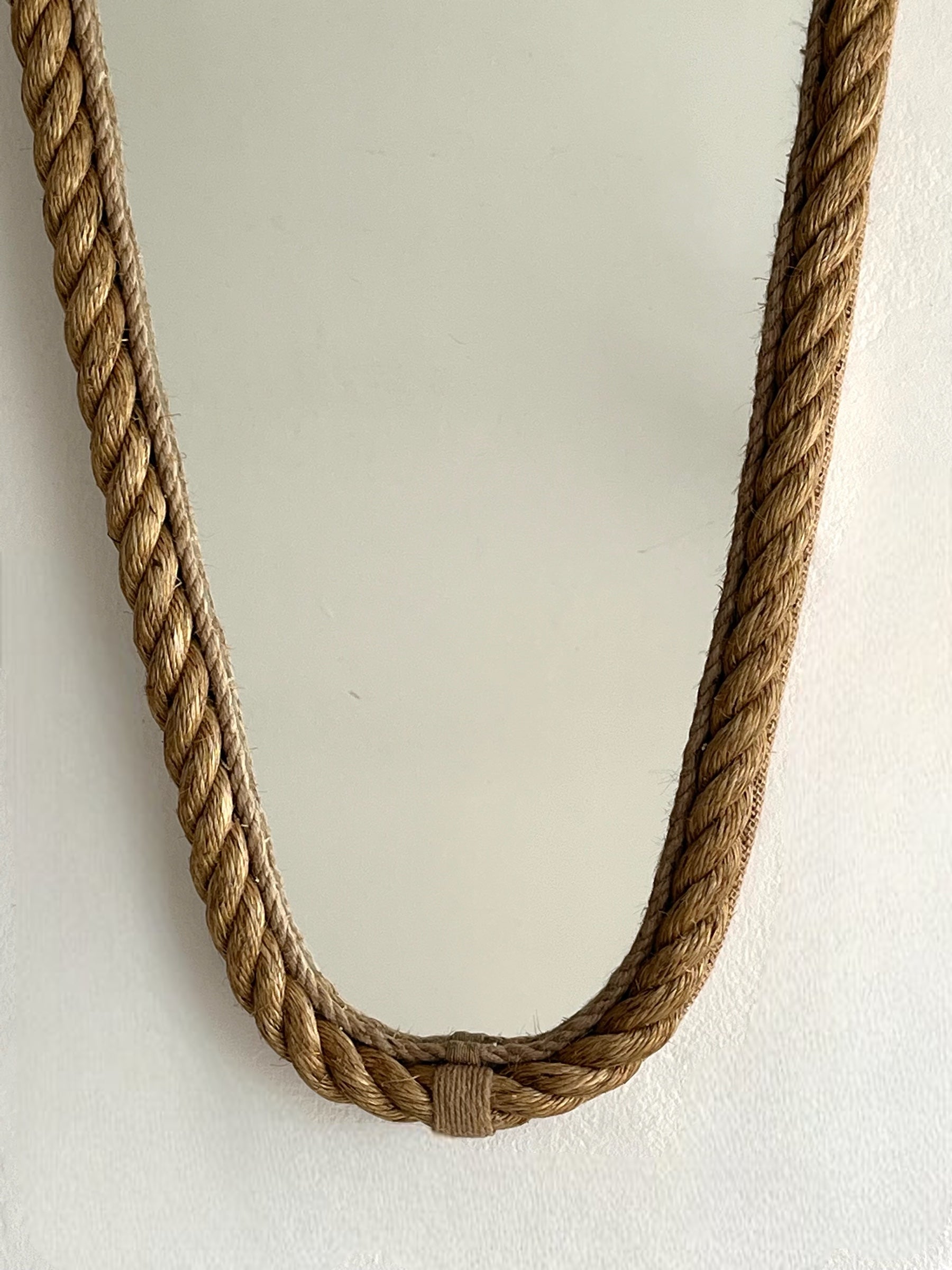 French rope mirror in the style of Audoux Minet. Generous size and unique sculptural shape with twisted rope frame and braided rope detailing in the inner frame. Sourced in France.