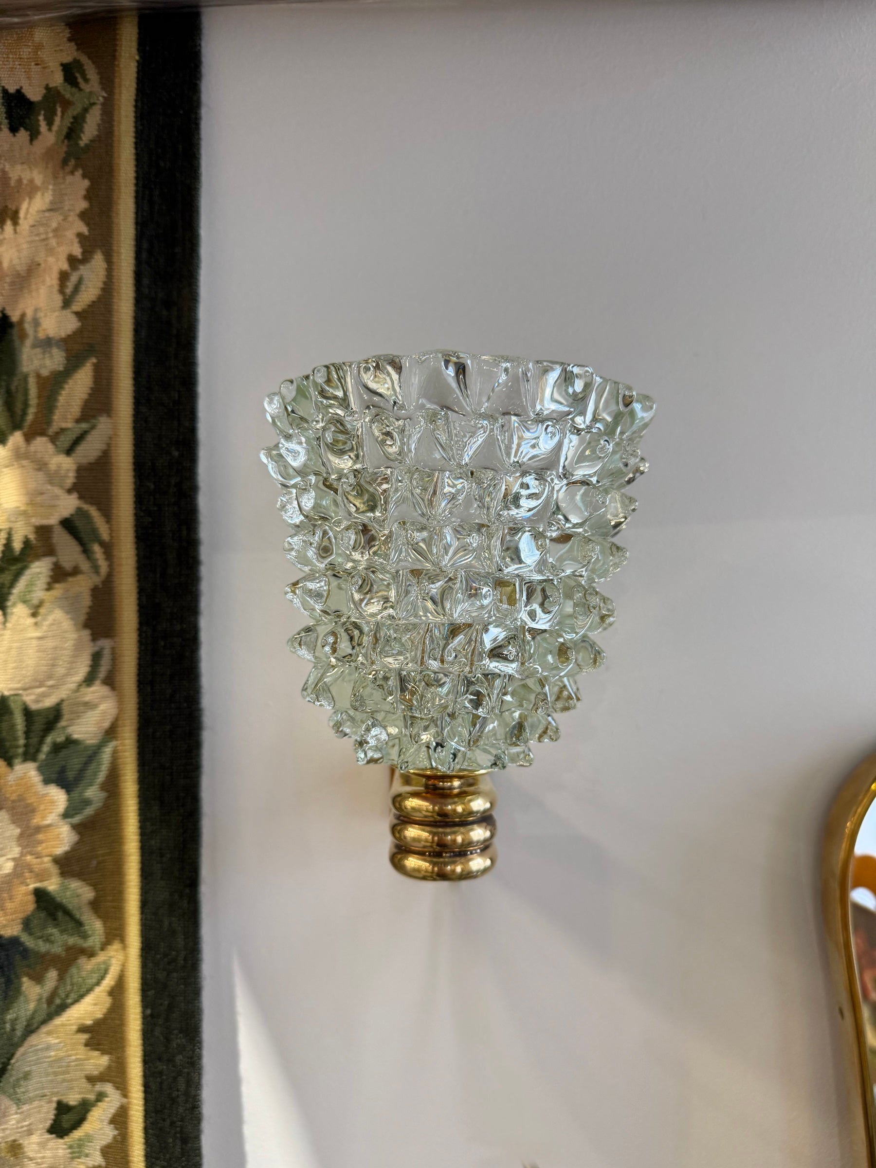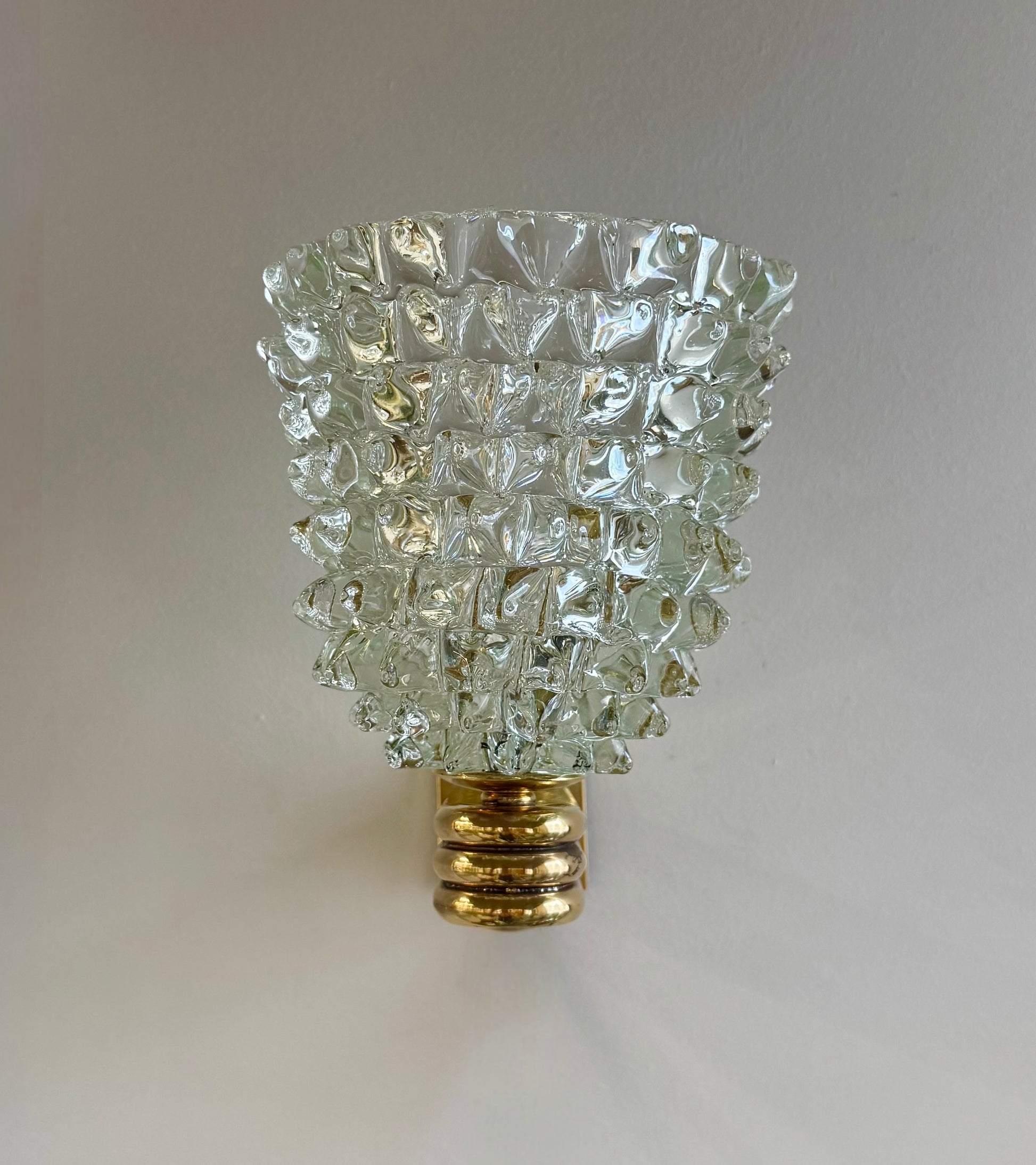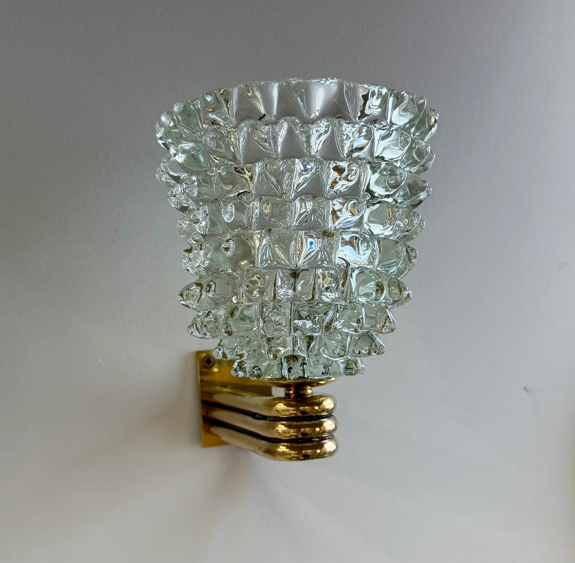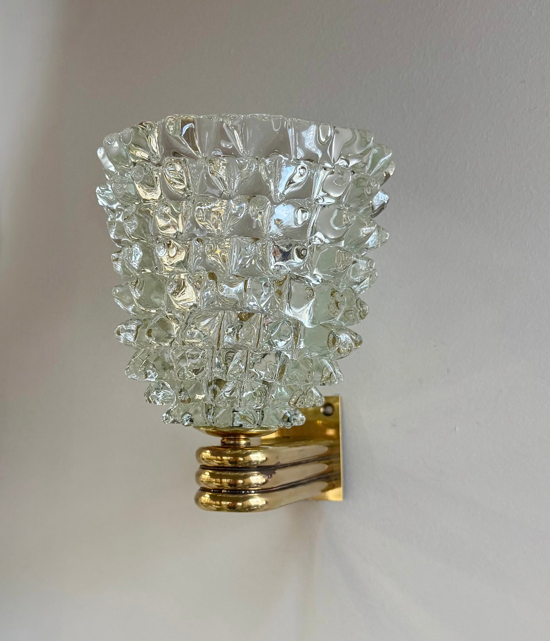 Beautiful hand blown Italian Murano glass and brass wall lights in the Rostrato technique by Barovier. Circa 1940’s. The glass has a very slight green tinge. Brass hardware