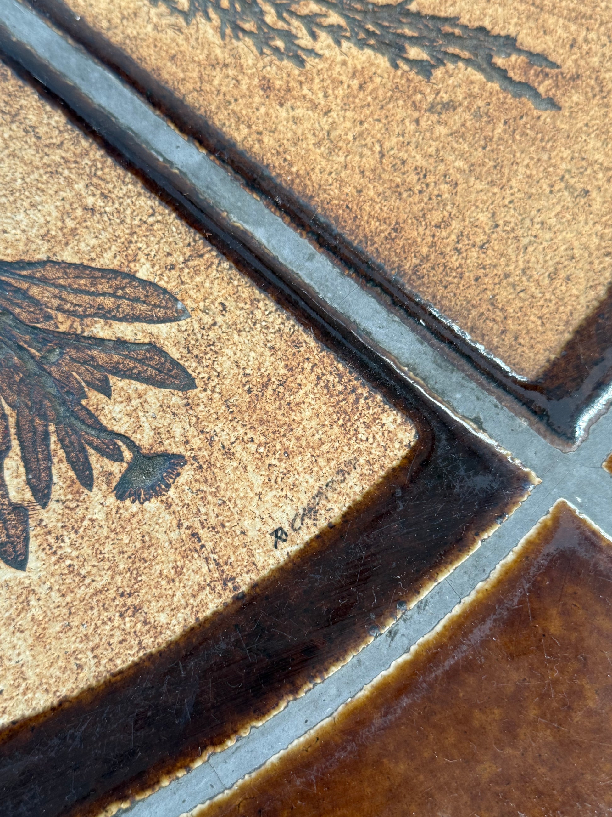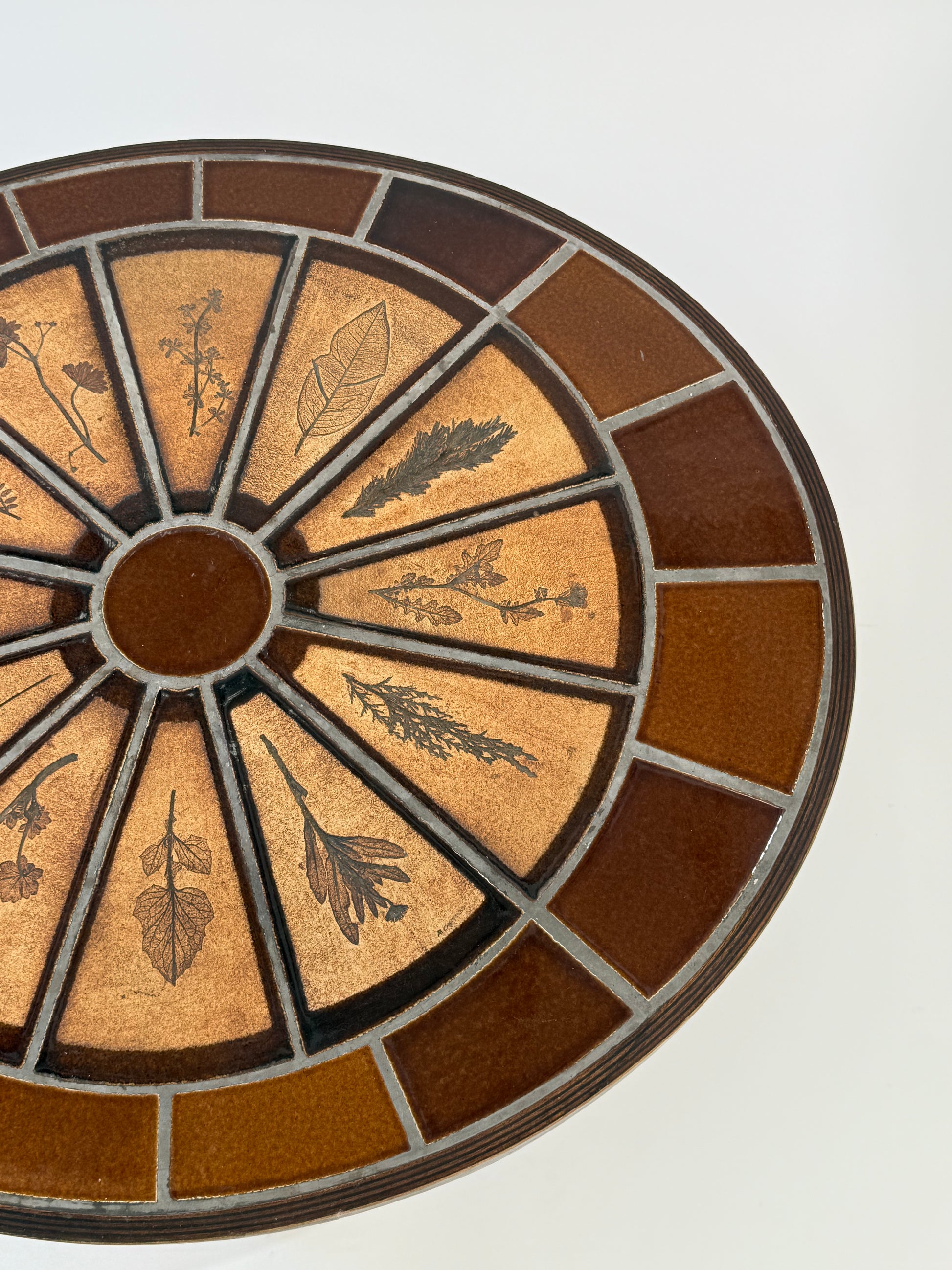 Original and rare oval ceramic tiled coffee table by Roger Capron. Made in France, Vallauris, circa 1960’s. The table top features ceramic tiles with Capron’s signature Herbarium motifs, and the base is made of timber. Signed. In wonderful condition