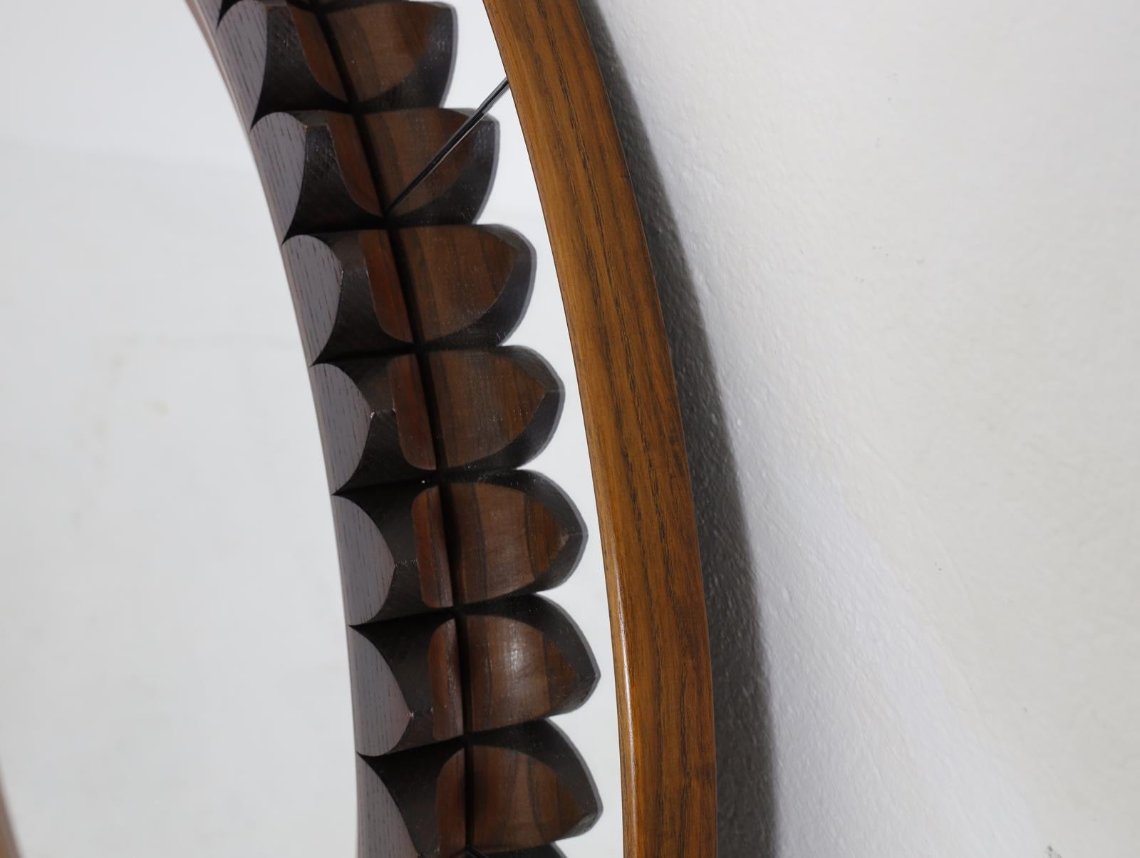 Exceptional and rare 1950’s walnut wall mirror designed by Fratelli Marelli. Incredible design with a carved scalloped inner frame in walnut and outer frame edged in walnut. Exquisite craftsmanship and a rare piece of Italian design.
