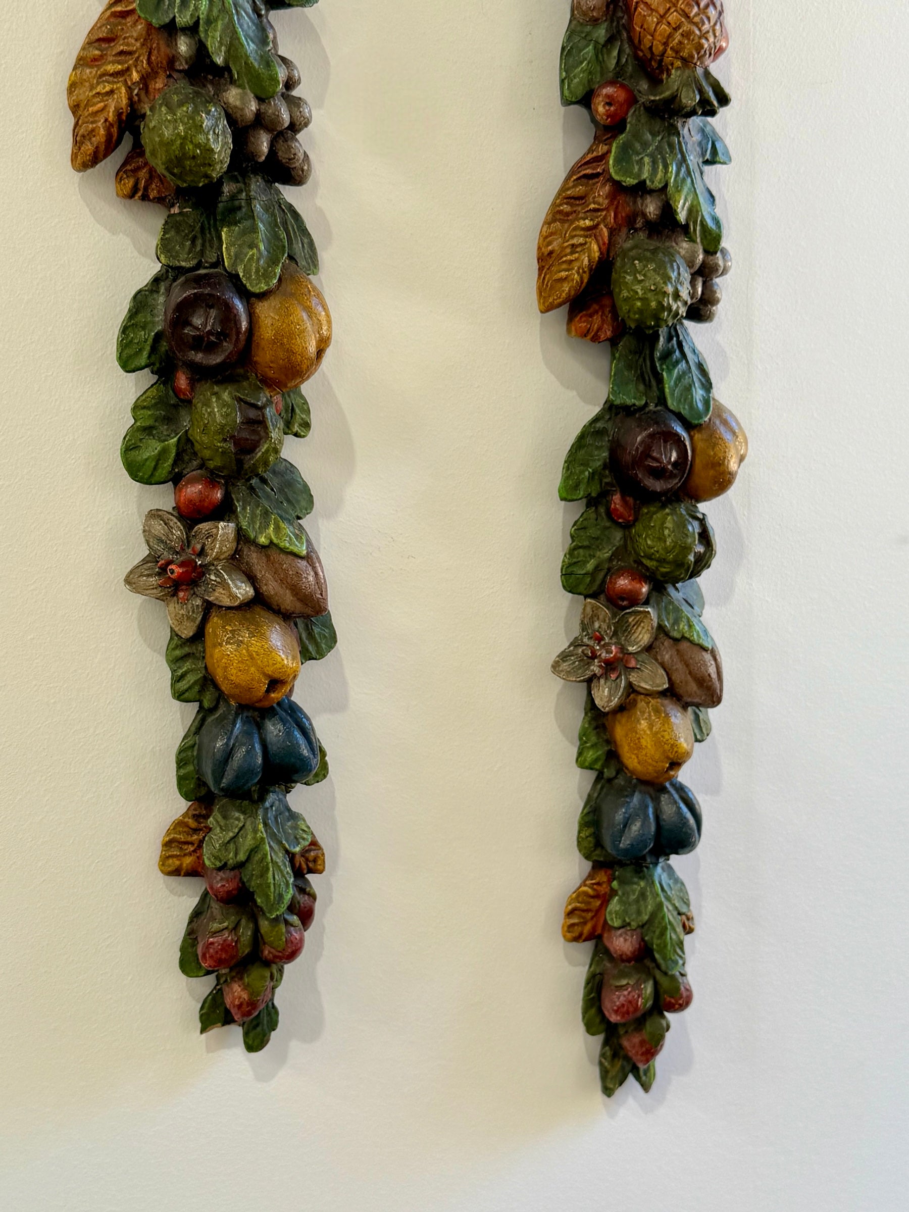 Beautiful vintage timber decorative wall hangings. Hand carved and painted with fruit, foliage and ribbon detailing. Early 1900’s. Fabulous decorative design