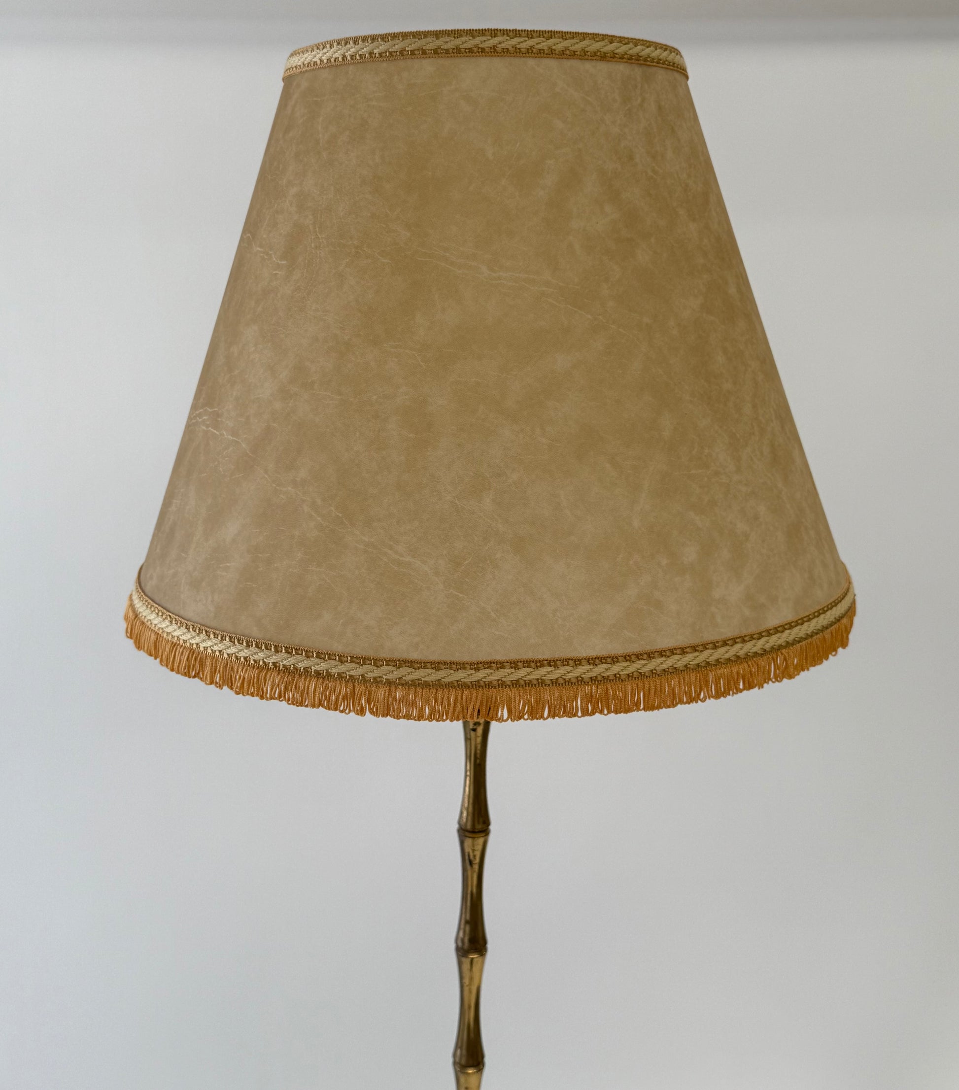 Vintage French faux bamboo brass floor lamp by Maison Bagues. Circa 1960’s. Classic French design with a faux bamboo tripod stem and original parchment shade with fringe in excellent condition. Sourced in France.