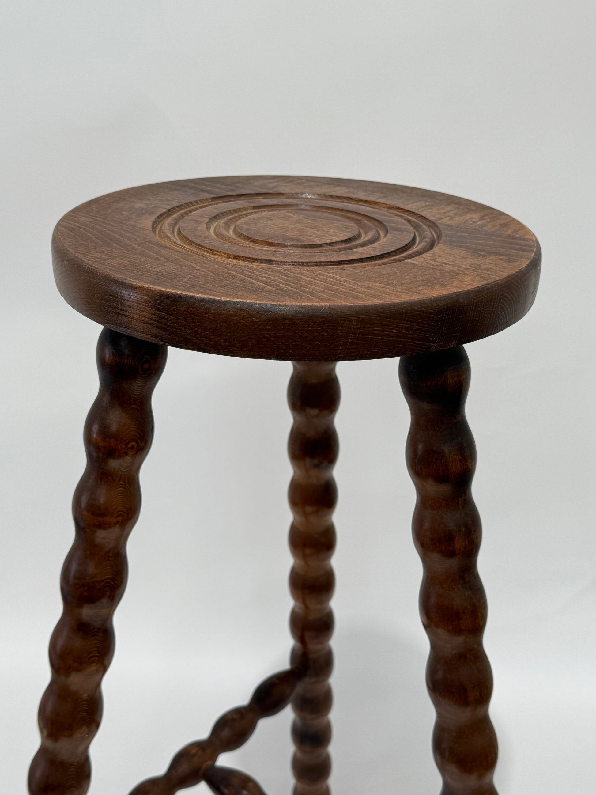 Vintage French Dudouyt style three legged bobbin high stool. Tall style suitable as a kitchen stool