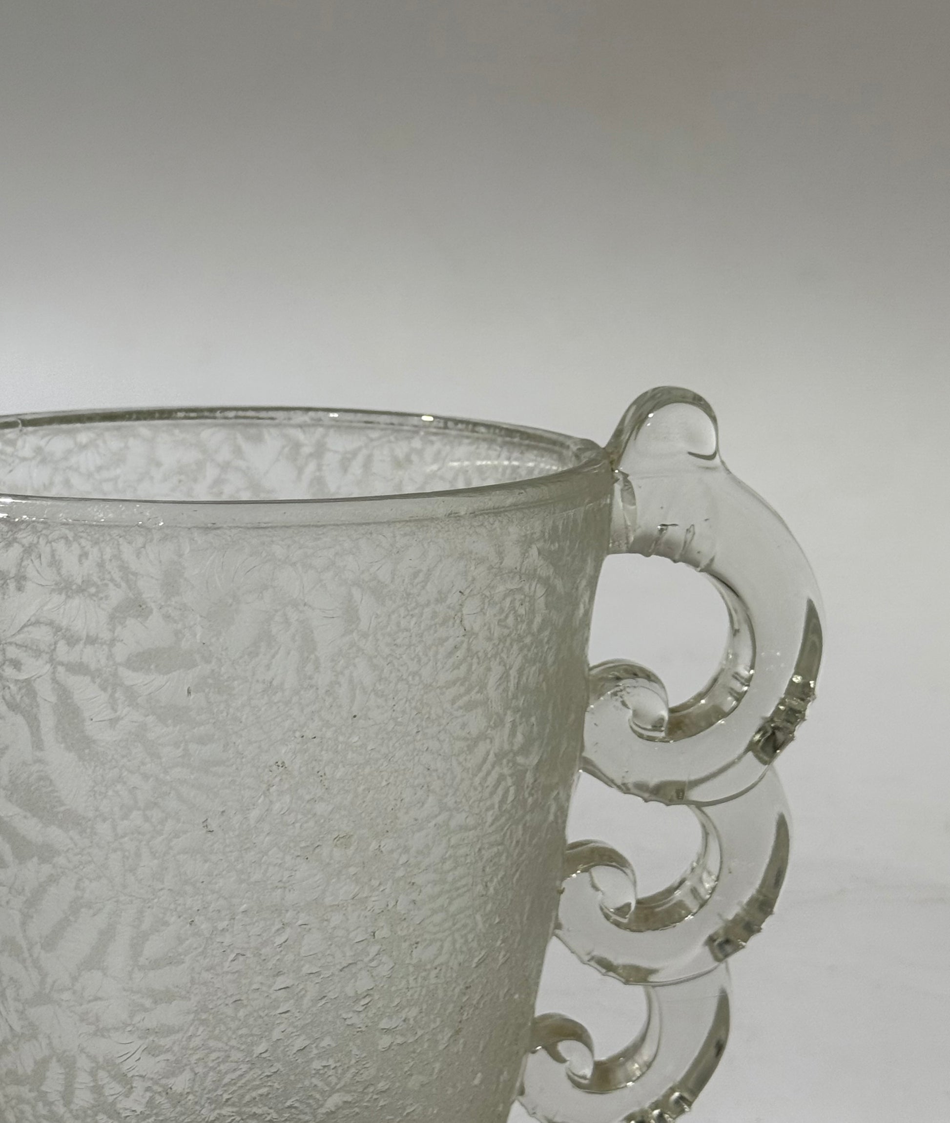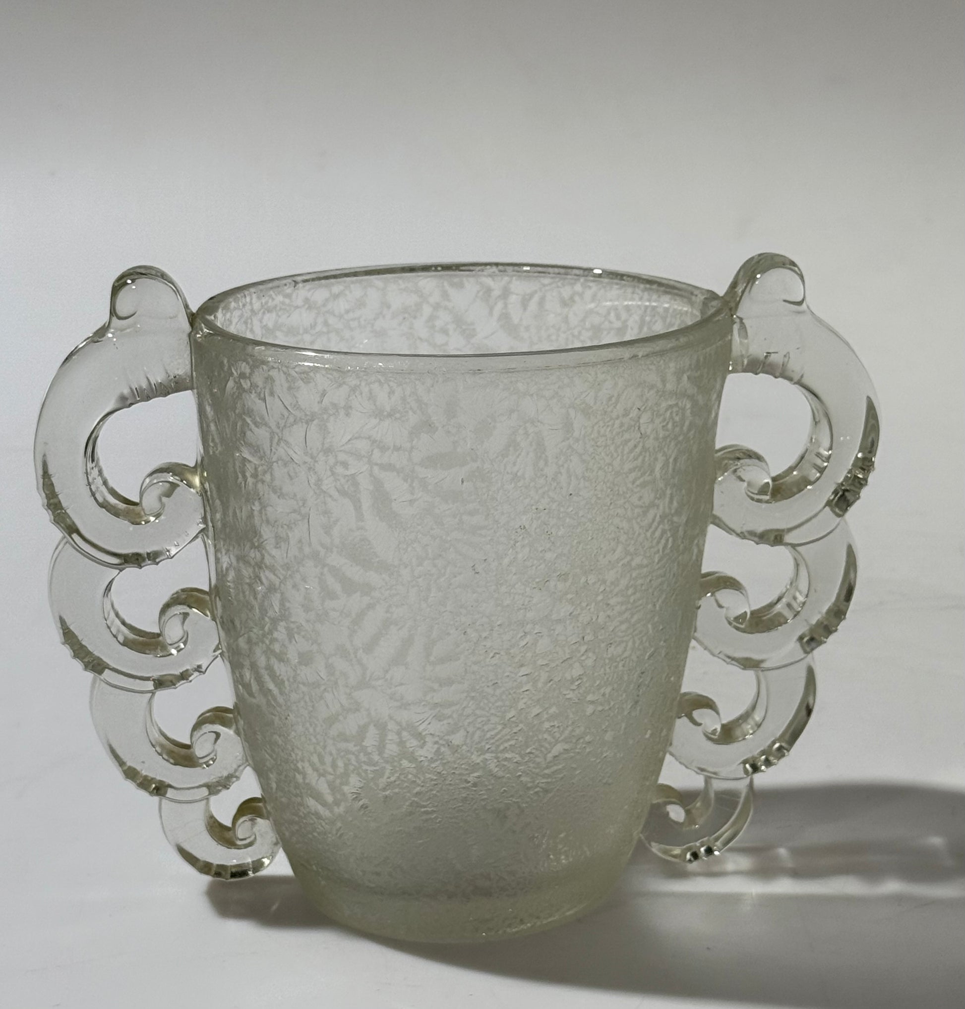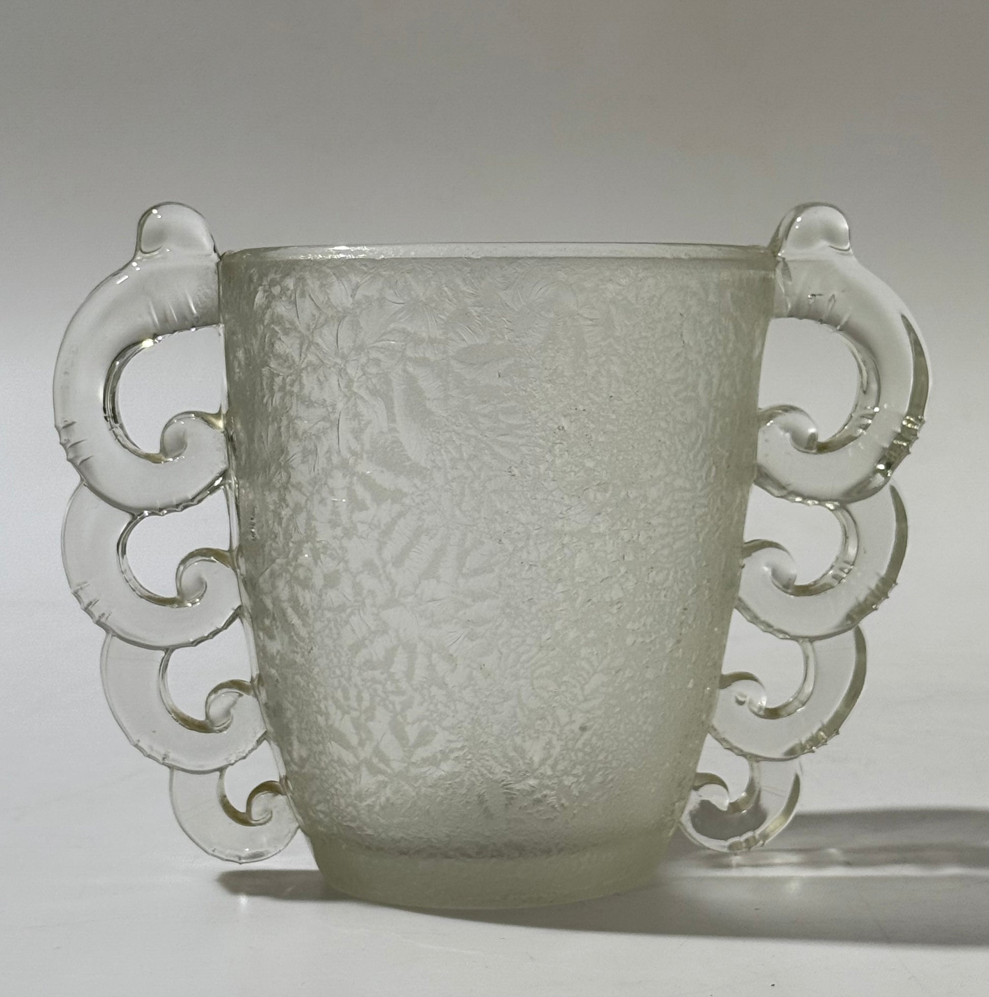 Absolutely beautiful French crystal glass vase attributed to Pierre D‘Avesn for Daum. Featuring a stunning design in thick moulded glass with a textured finish and decorative loop handles. Circa 1930’s.