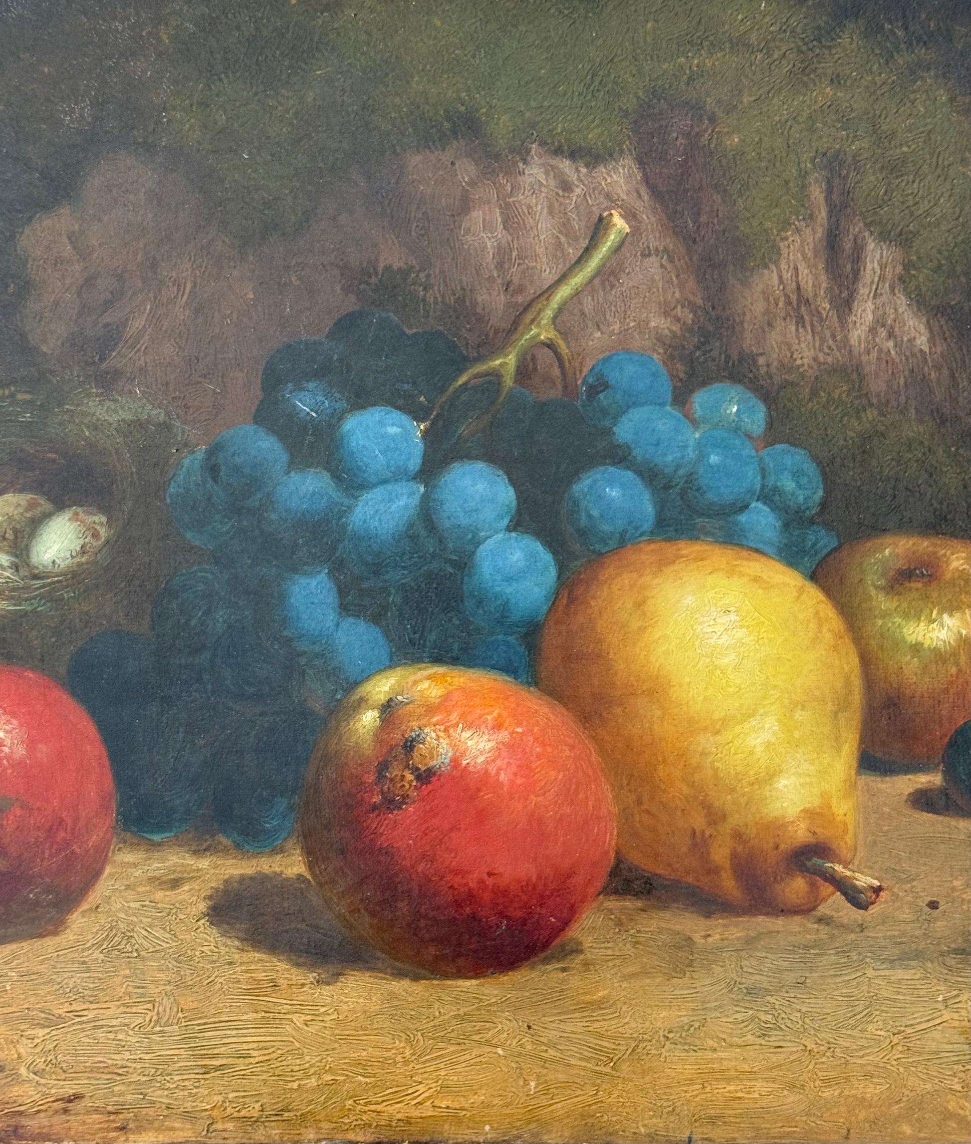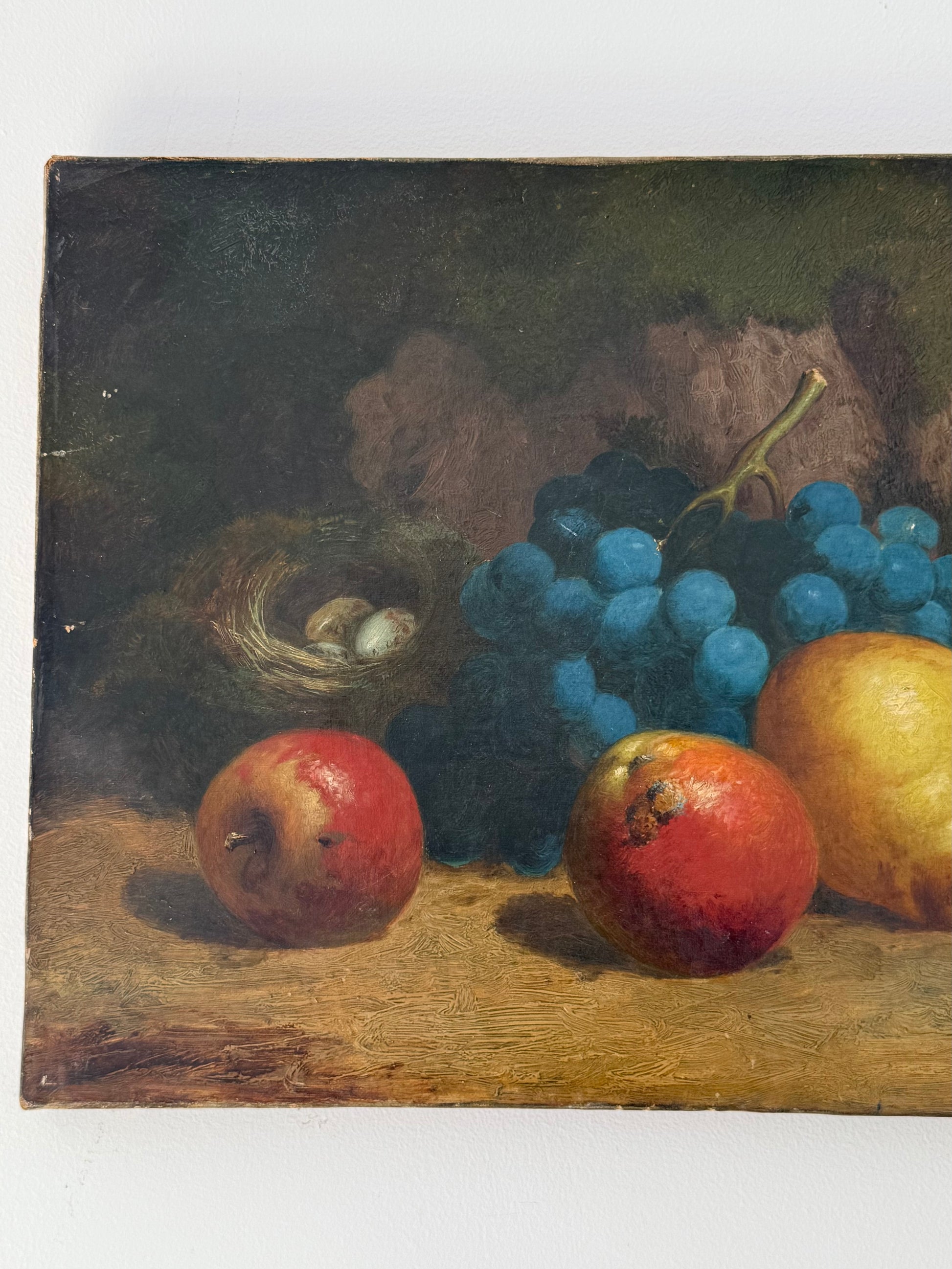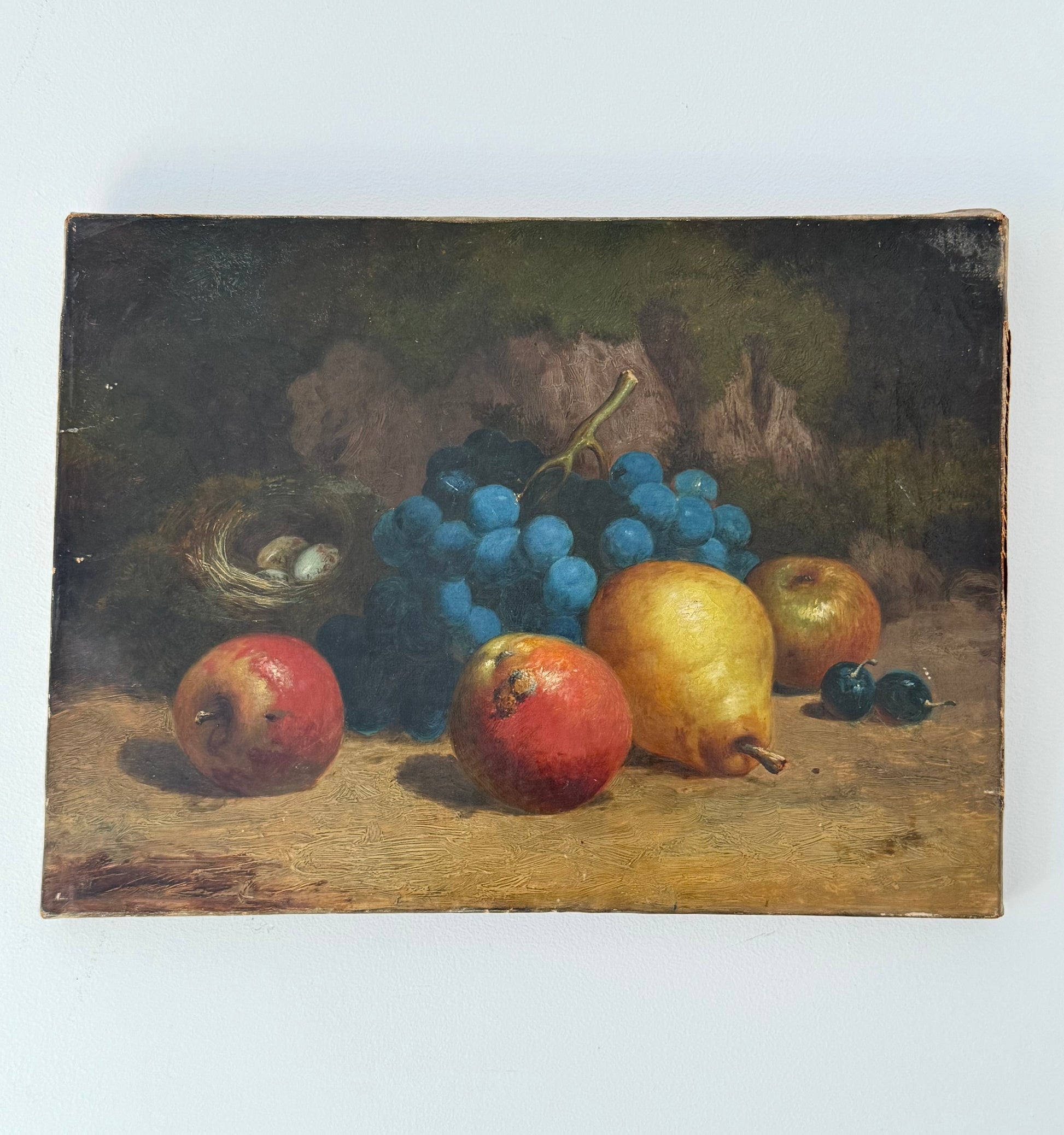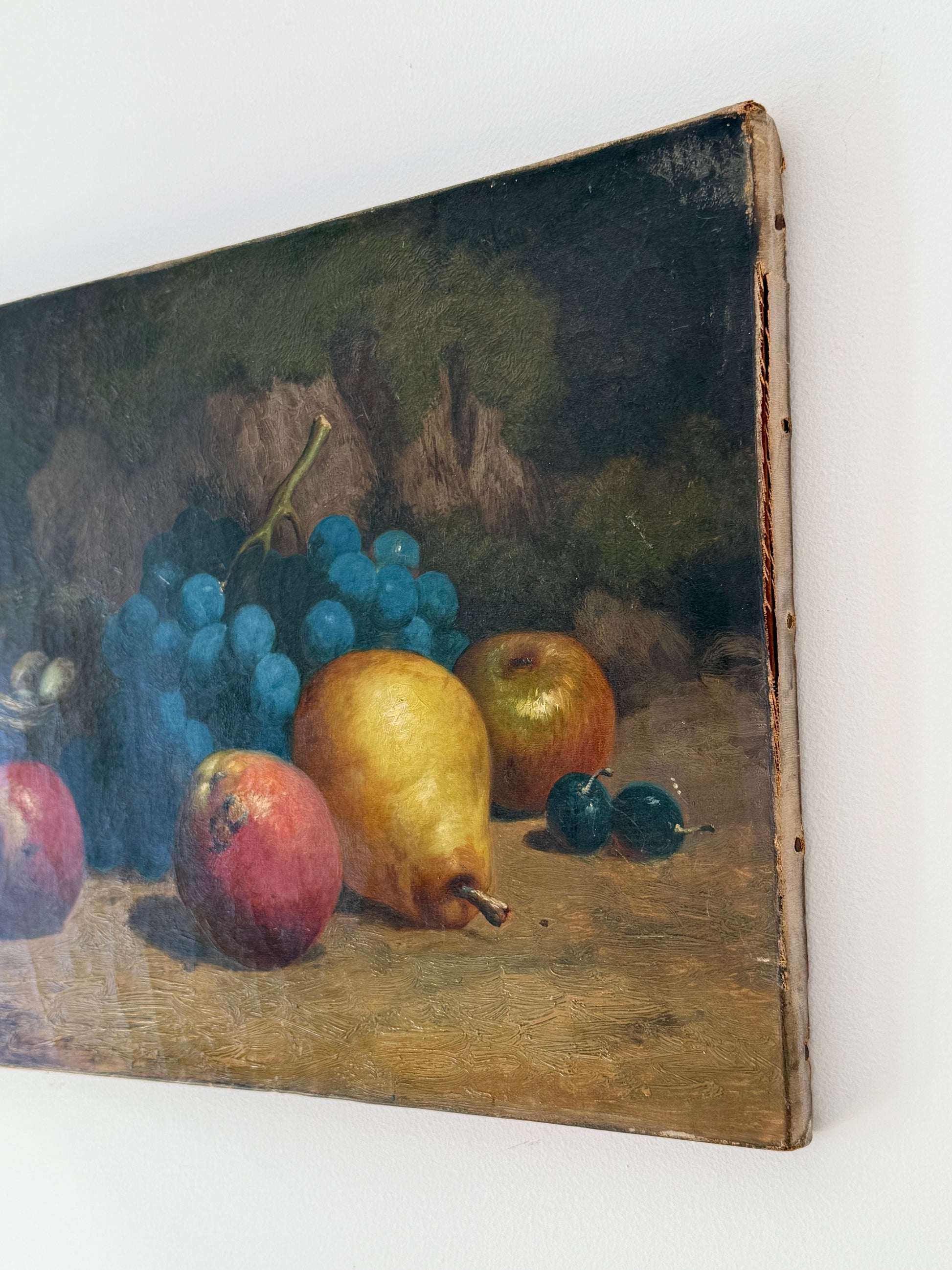 Moody French still life painting depicting fruit. Circa 1940’s. Oil on canvas.