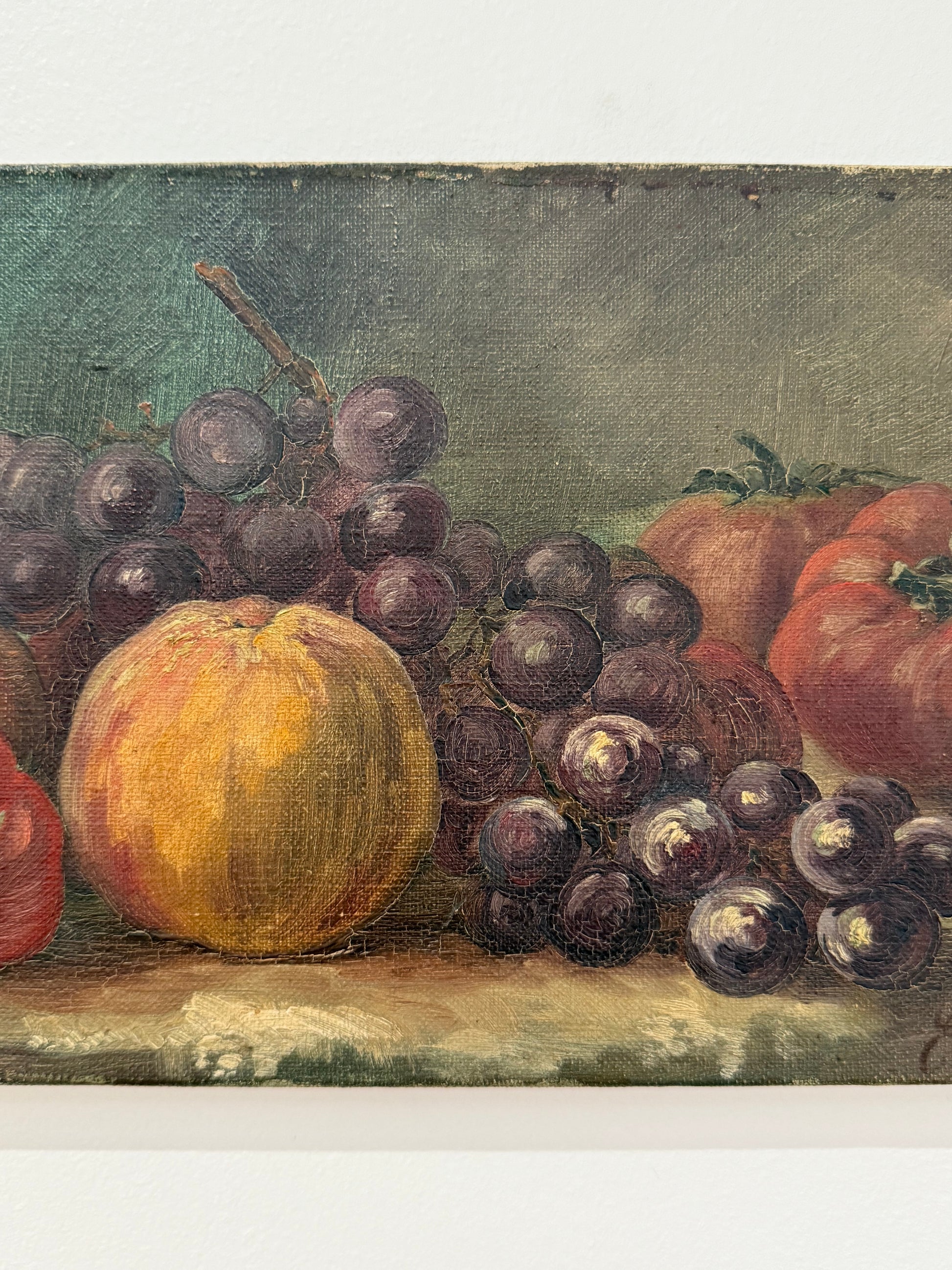 Vintage French still life painting depicting fruit. Circa 1940’s. Oil on canvas. Signed