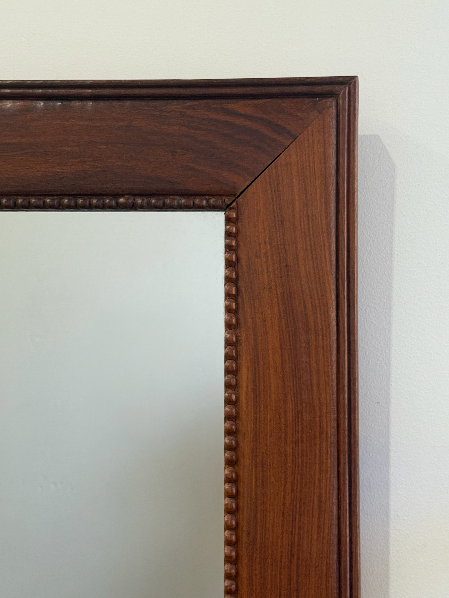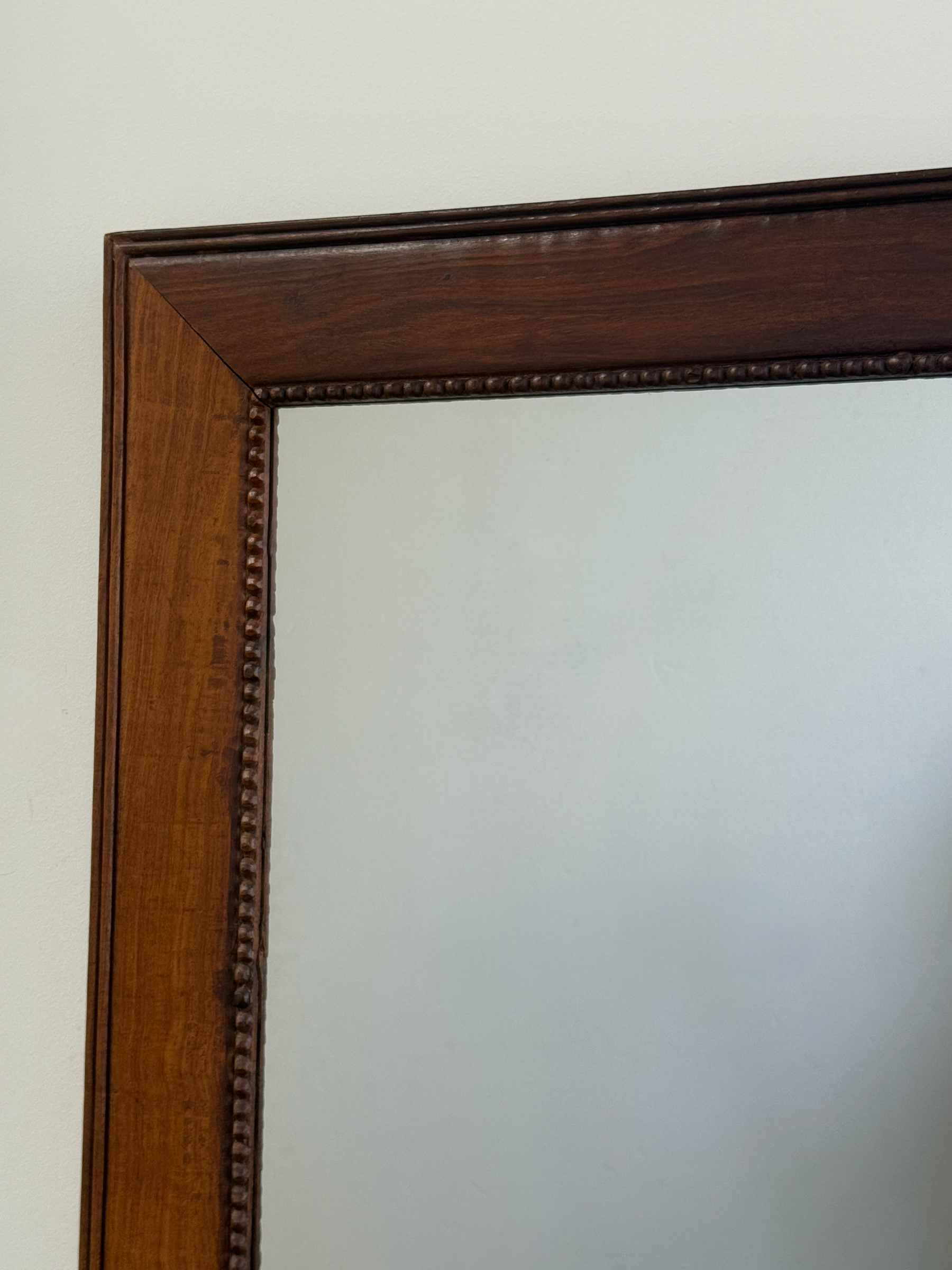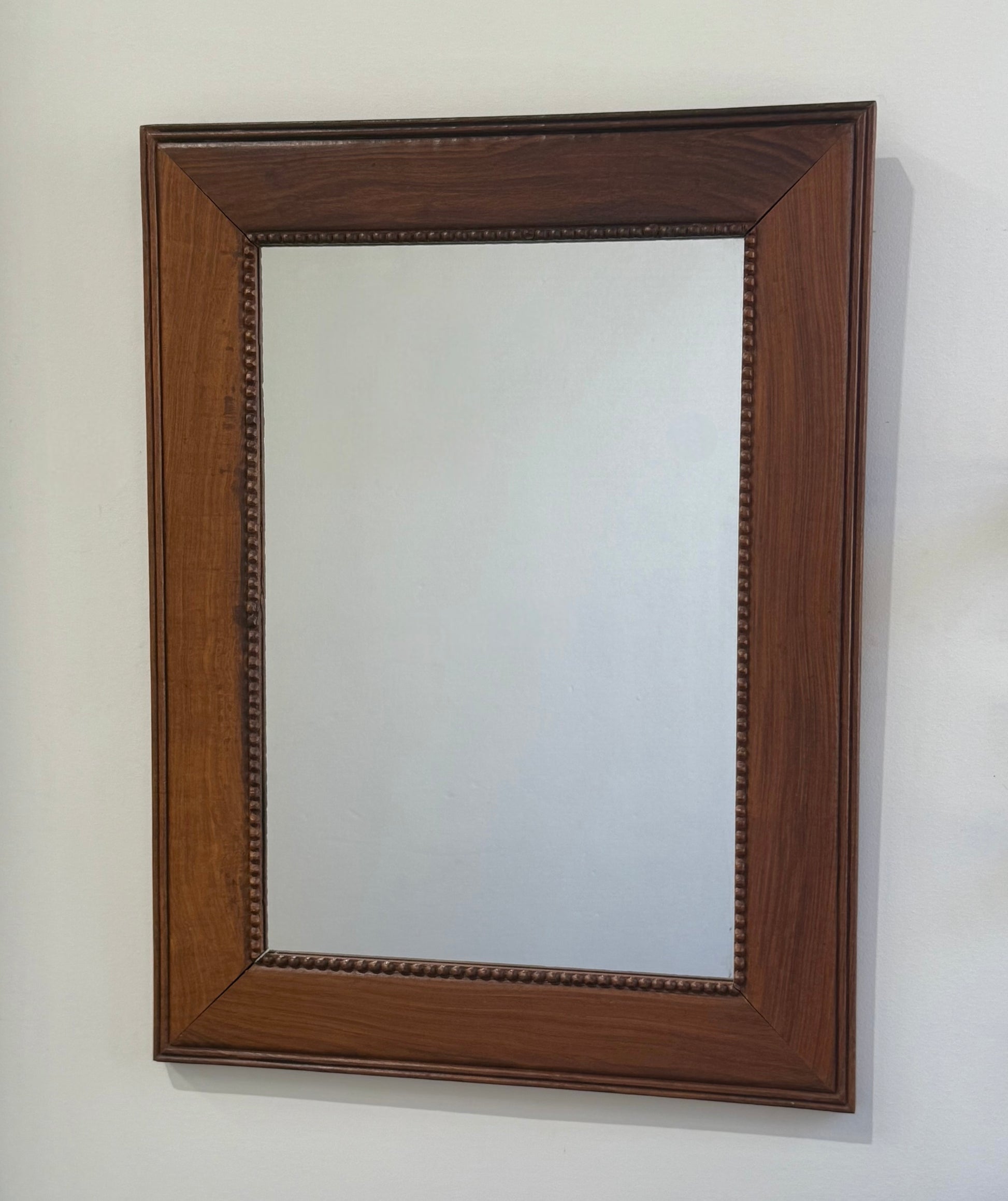 Vintage French timber mirror designed with carved detailing on the inside rim of the frame. Unique artisanal vintage style.