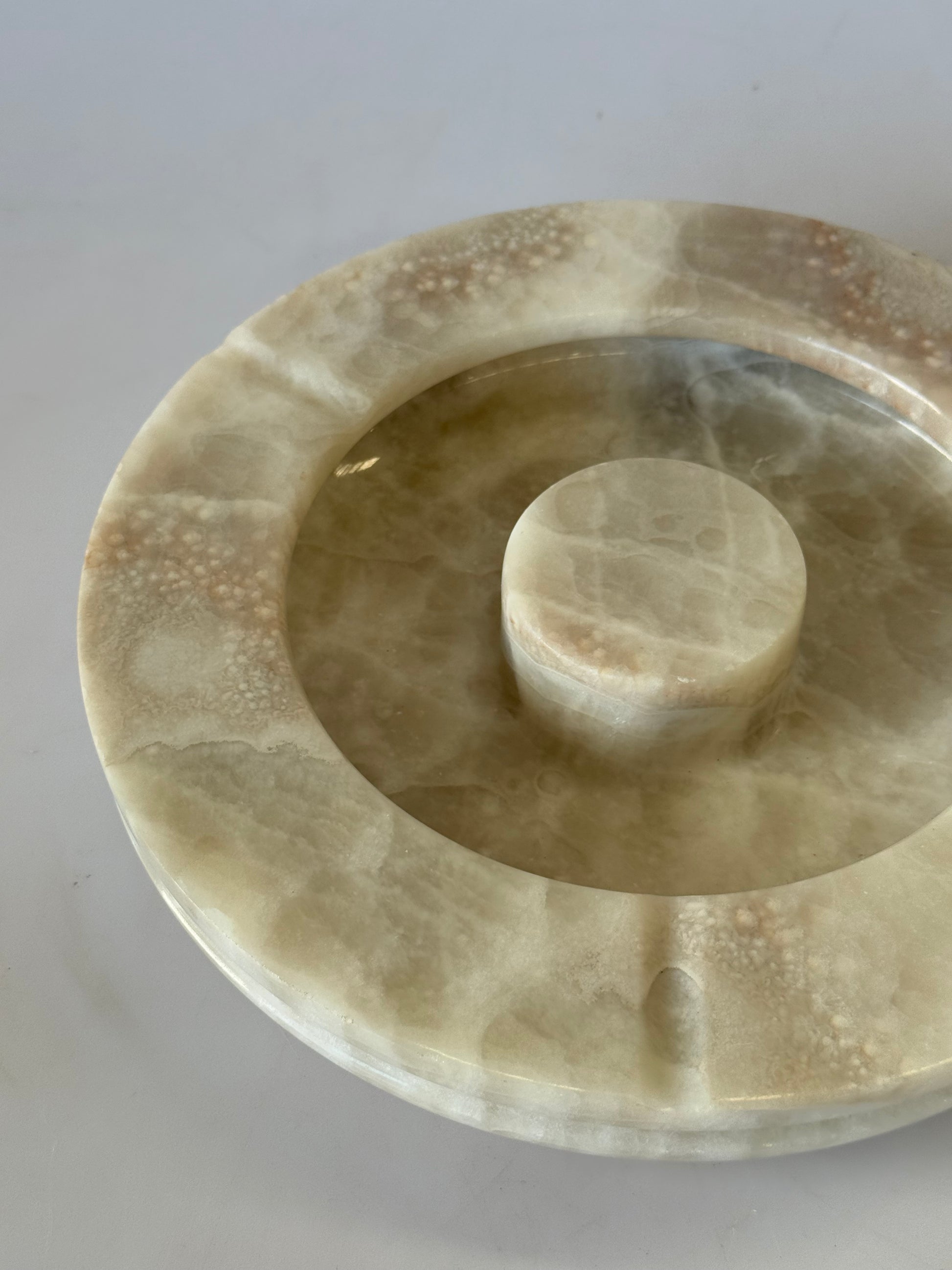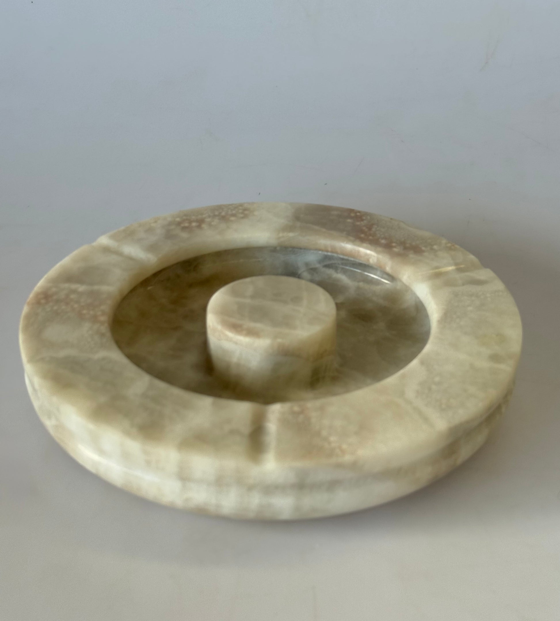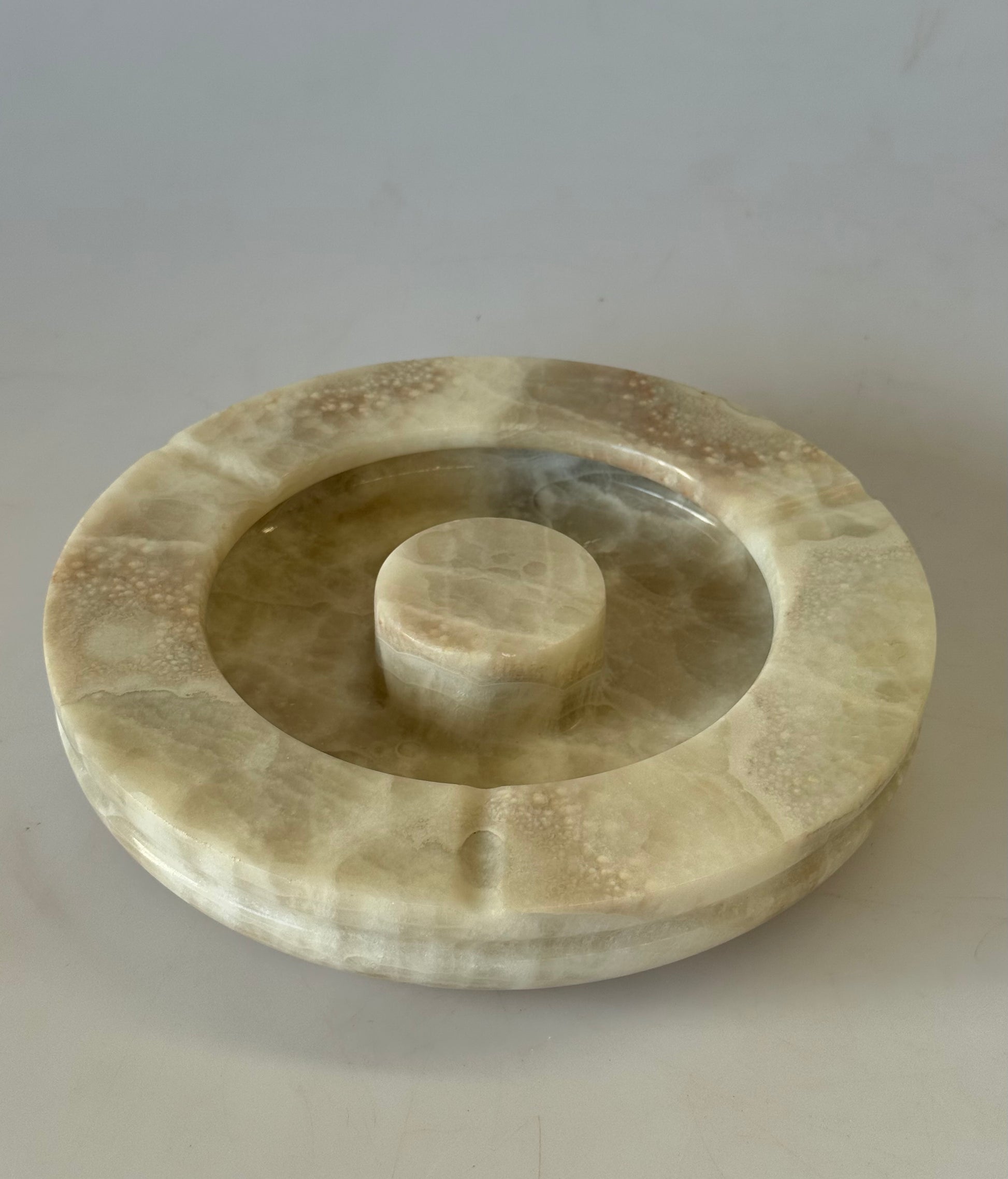 Vintage Italian onyx ashtray / centre piece in the style of Angelo Mangiarotti. Circa 1970’s. Beautiful natural shades and veins throughout. Sourced in Italy.
