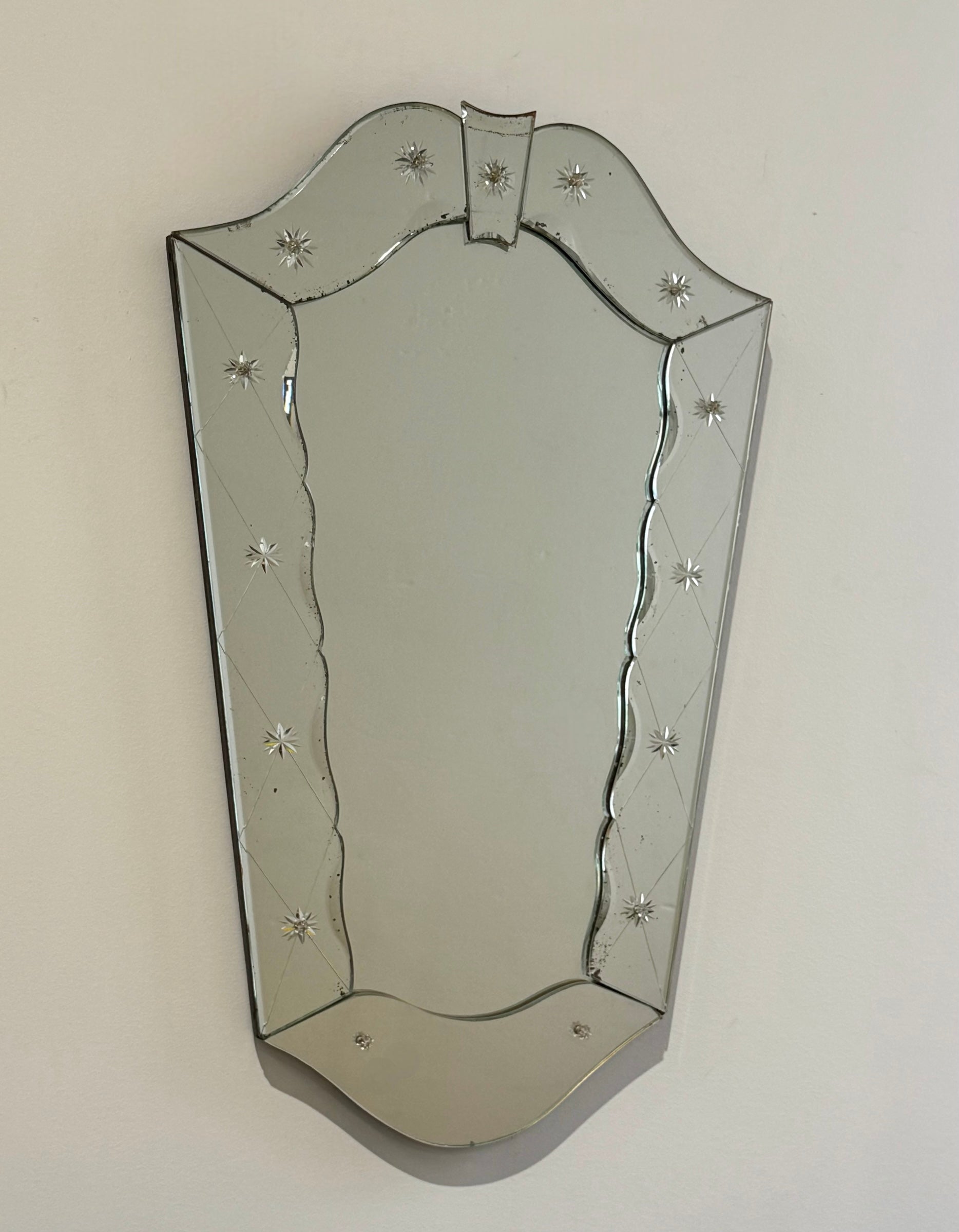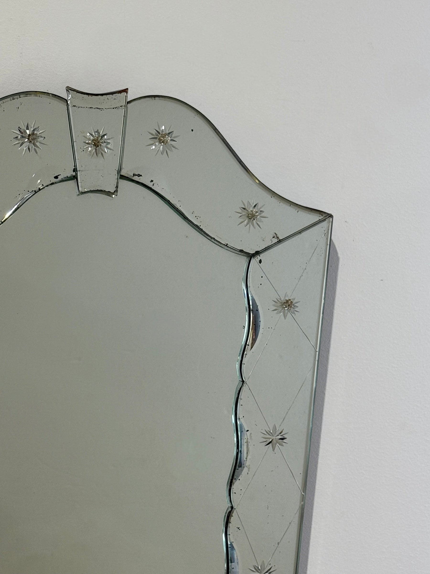 Beautiful vintage Venetian etched glass mirror. Lovely detailing with glass floral screws and bevelled edge.