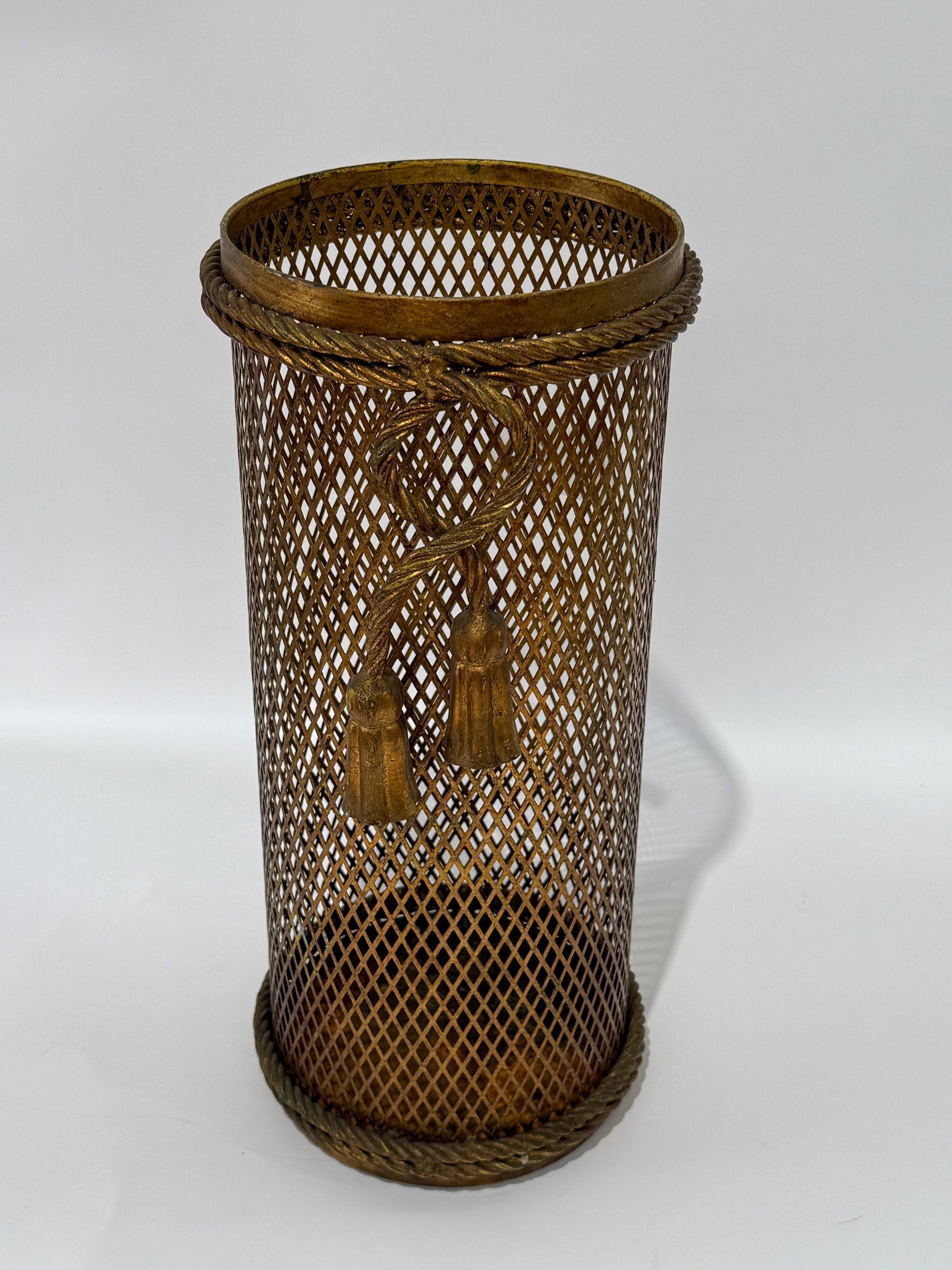 Elegant vintage Italian umbrella stand with decorative rope detailing. attributed to Li Puma Firenze. Golden perforated metal, surrounded by rope pompoms. In good condition with signs of wear. No defects or structural damage.