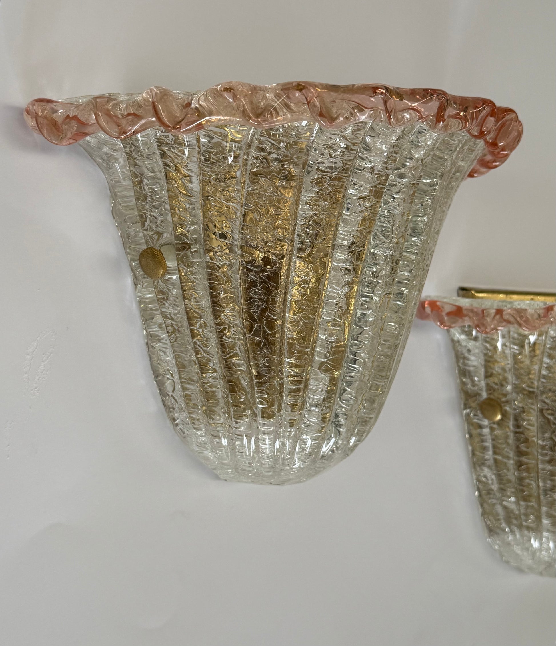 Pair of Vintage Murano glass wall lights with pink frill trim. Ribbed smooth exterior with glass granular effect on the inner side of the shade, referred to as “Graniglia”. Brass hardware. Sourced in Italy.