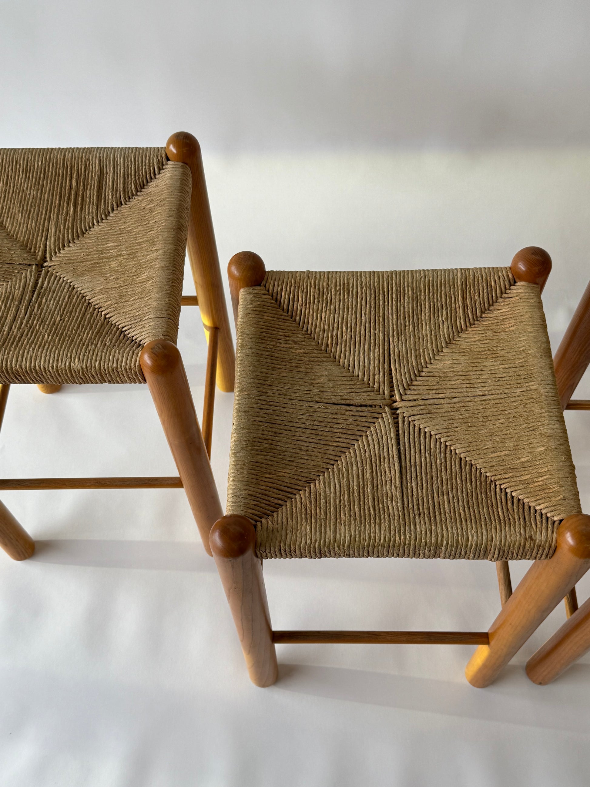 Vintage stool with rush seating attributed to Charlotte Perriand. Circa 1960’s. Sturdy frames in pine with woven rush seating. Sourced in France.