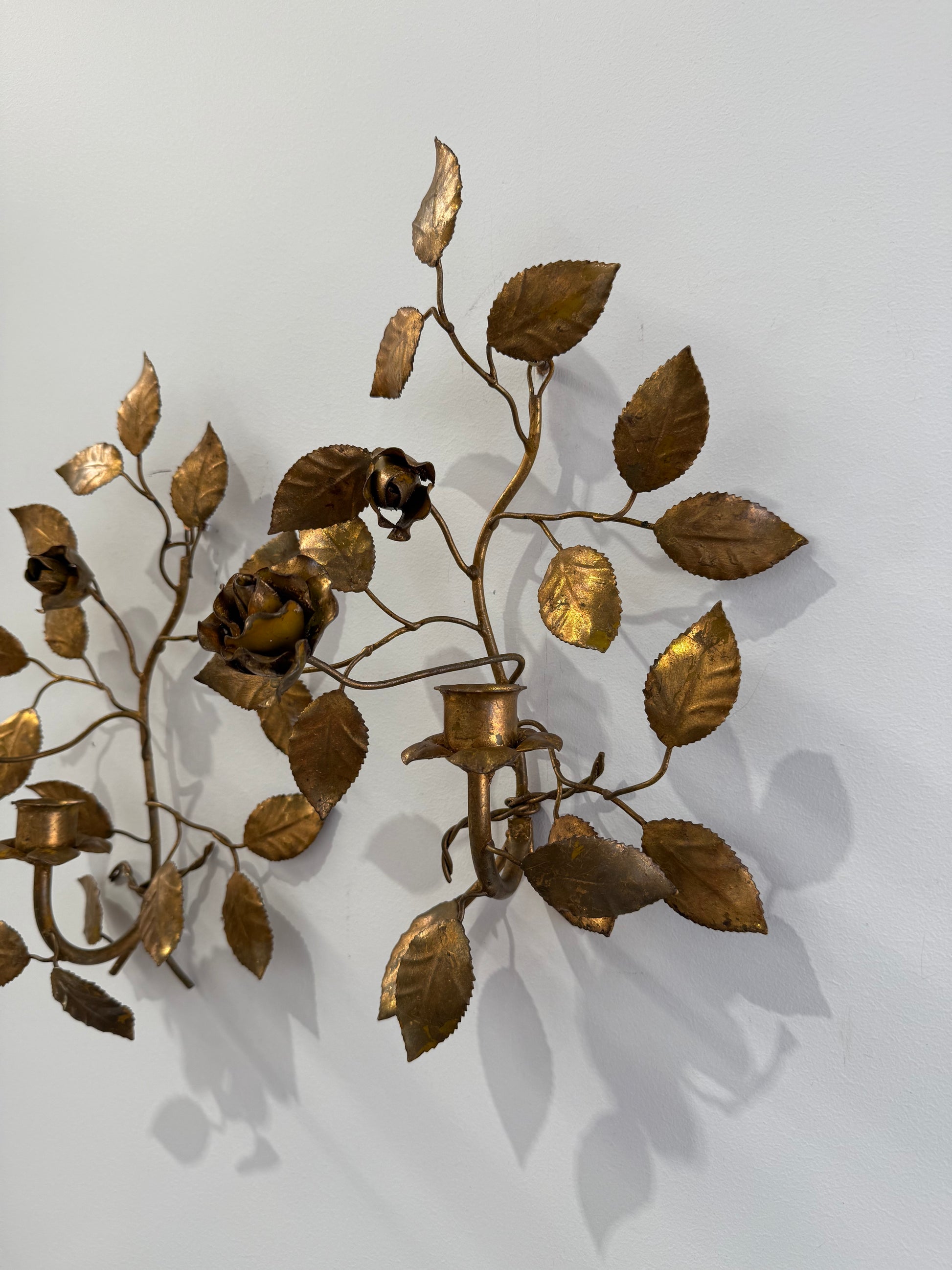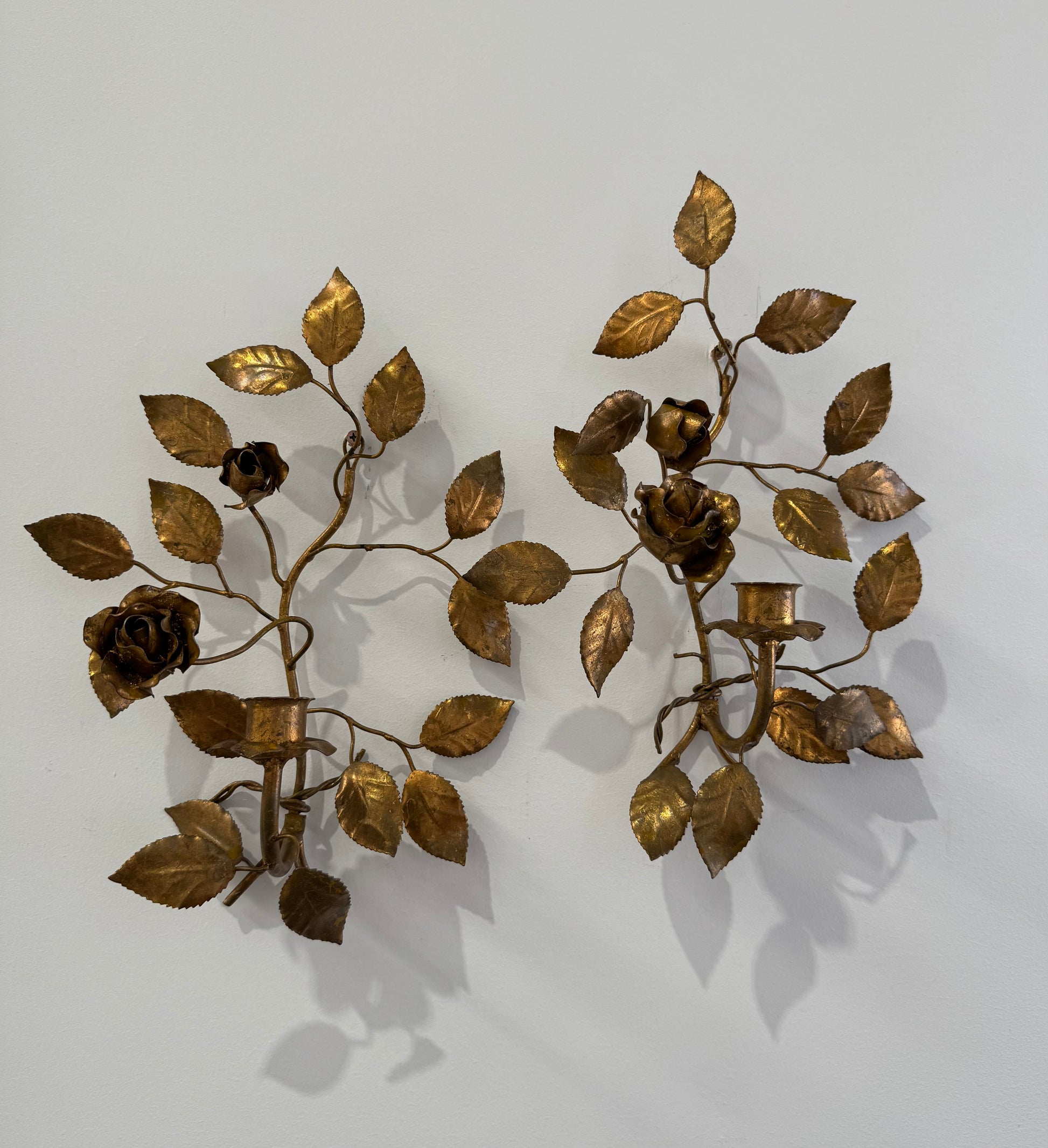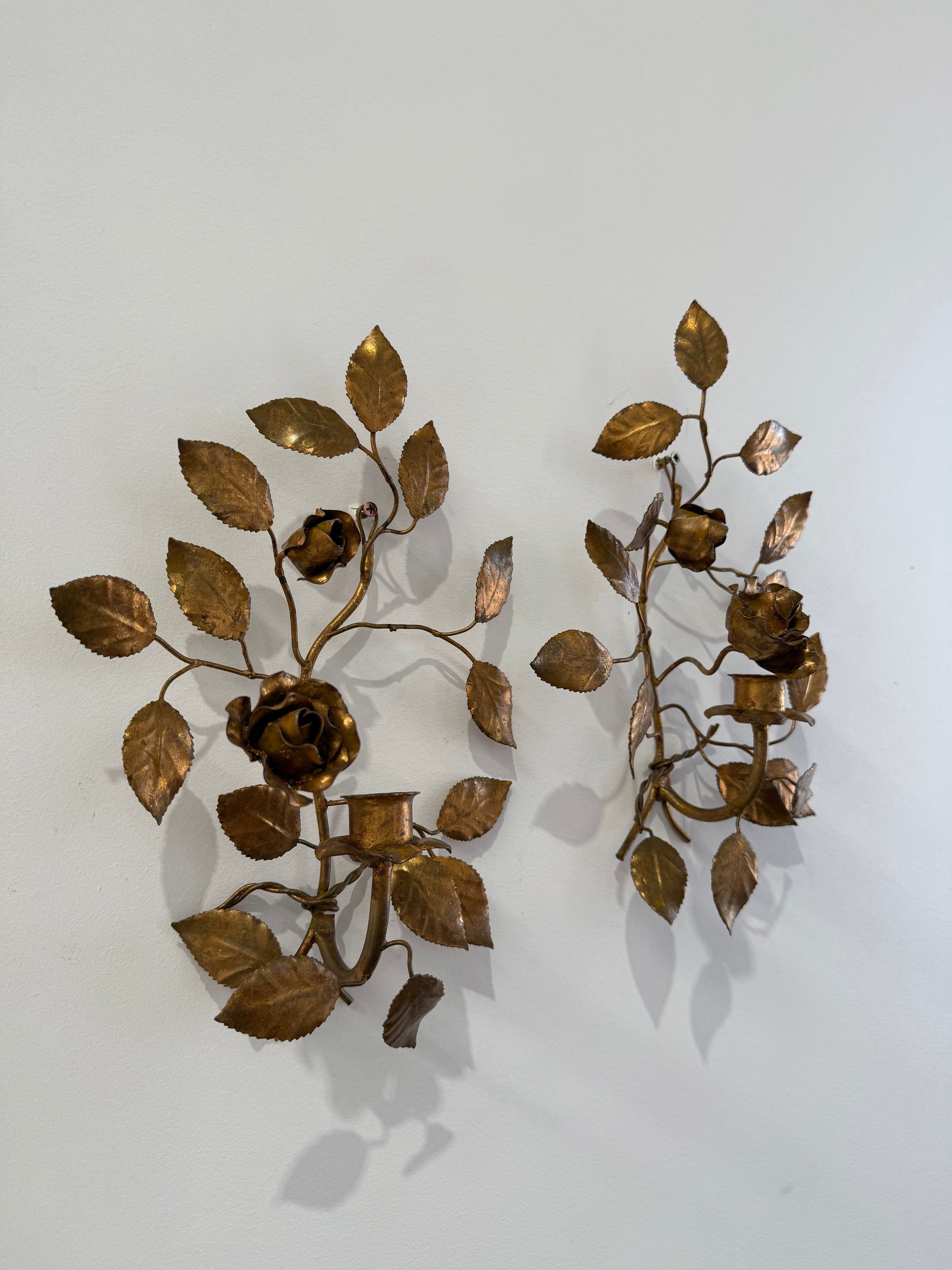 Pair of vintage Italian brass tolware wall mounted candle holder. Beautiful detailing with decorative flowers. Circa 1960’s. Sourced in France