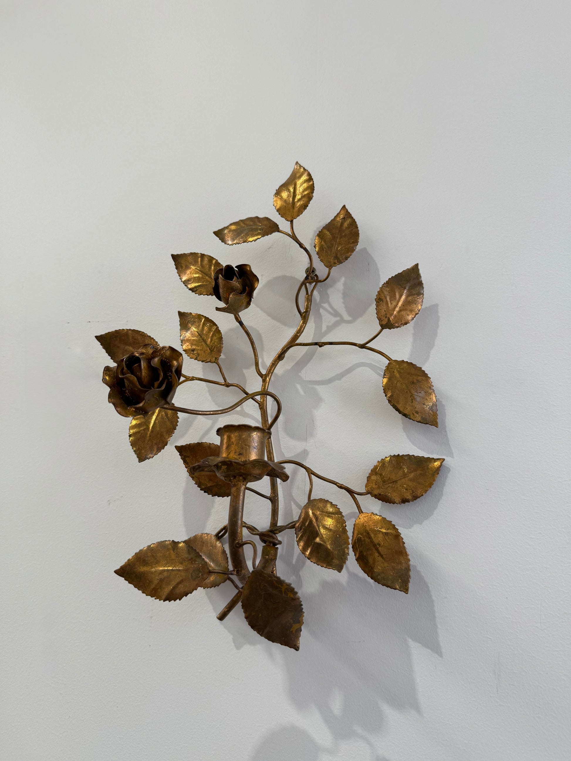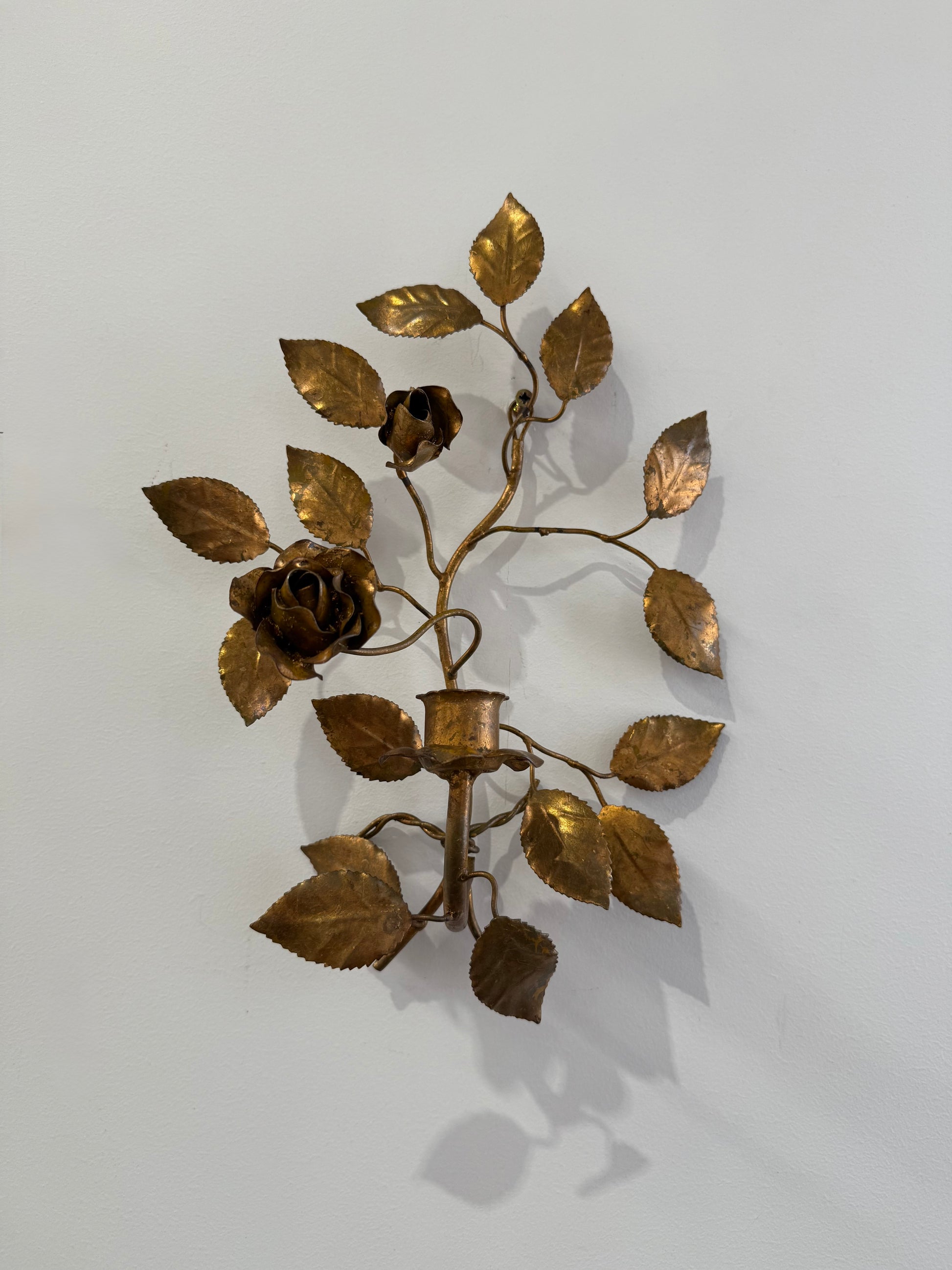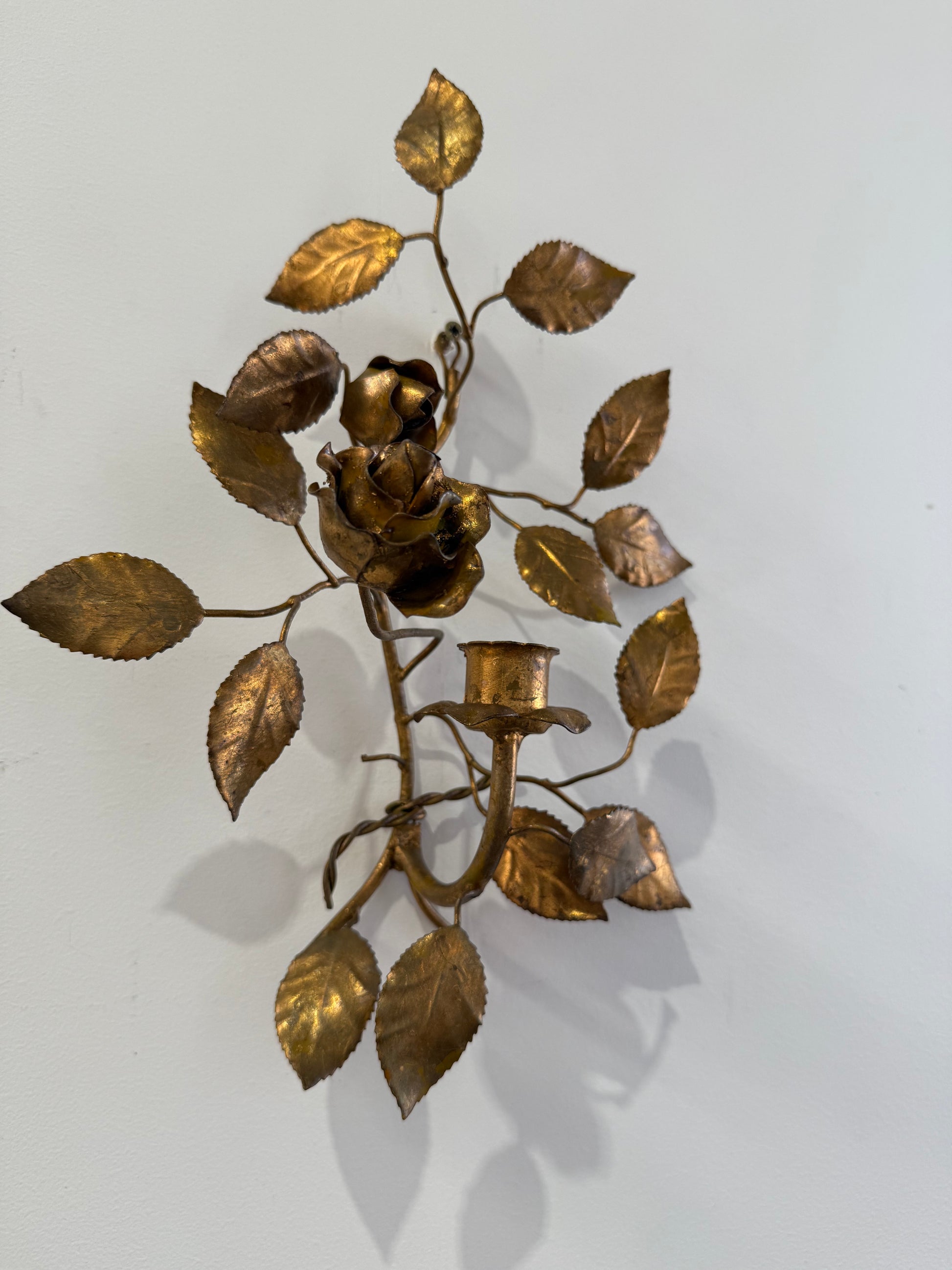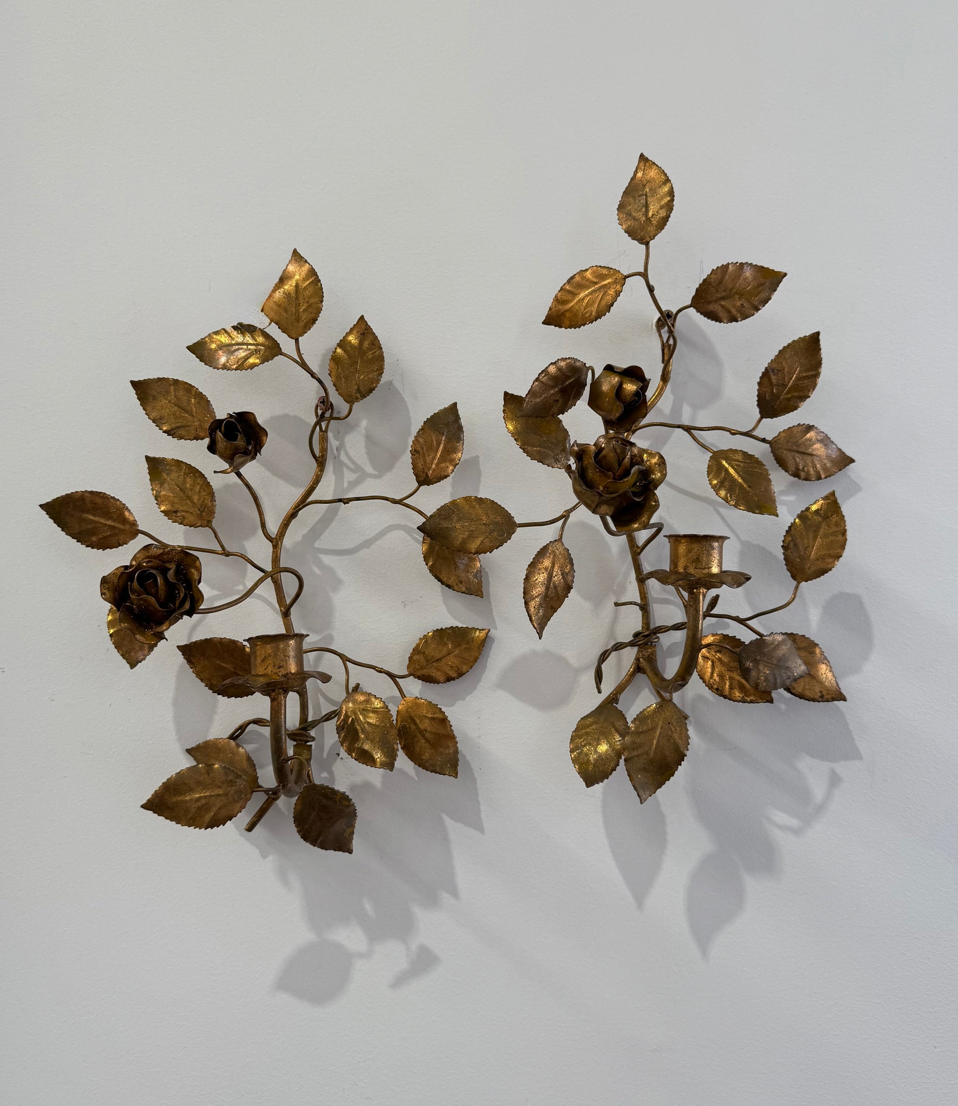 Pair of vintage Italian brass tolware wall mounted candle holder. Beautiful detailing with decorative flowers. Circa 1960’s. Sourced in France