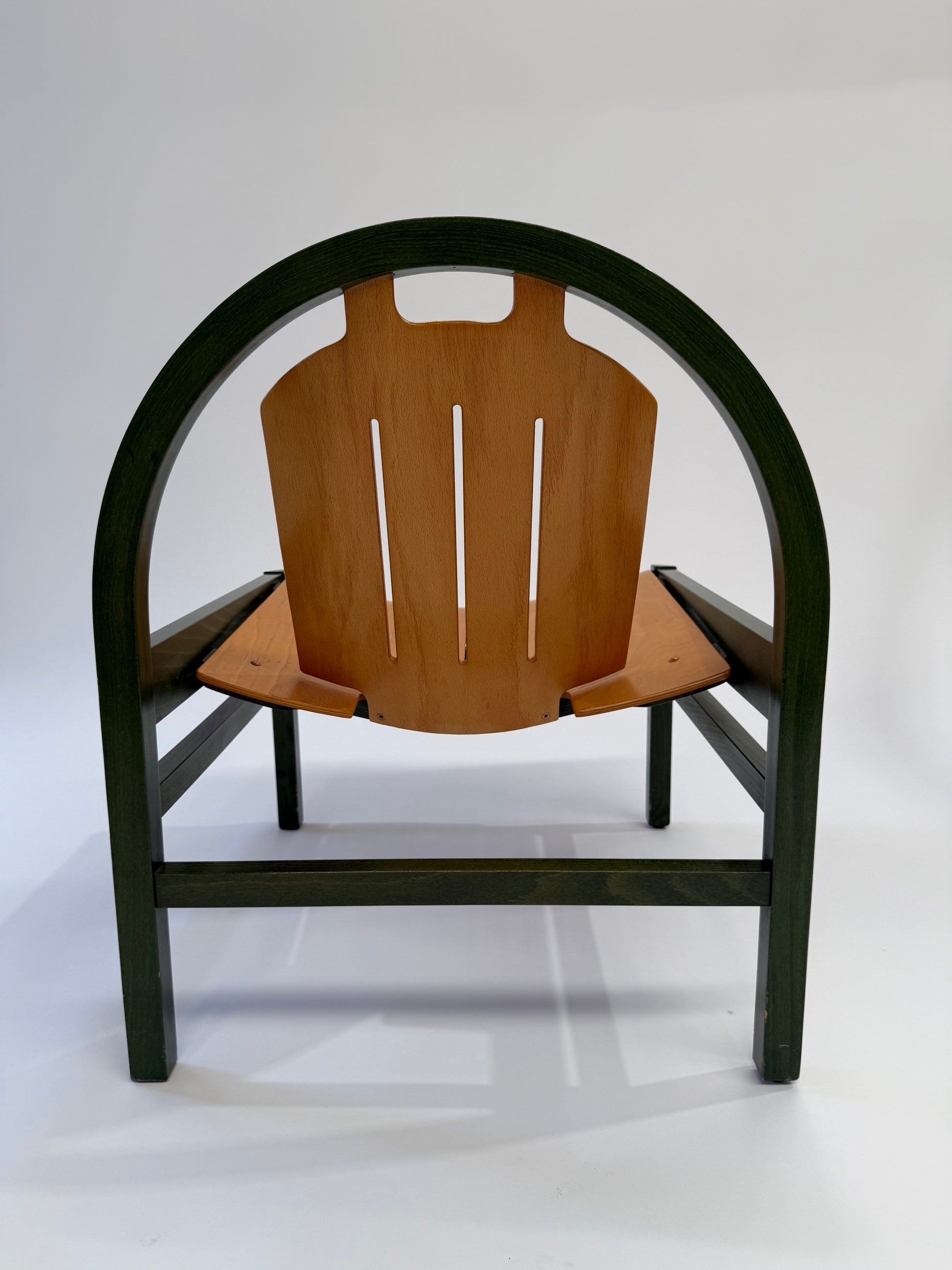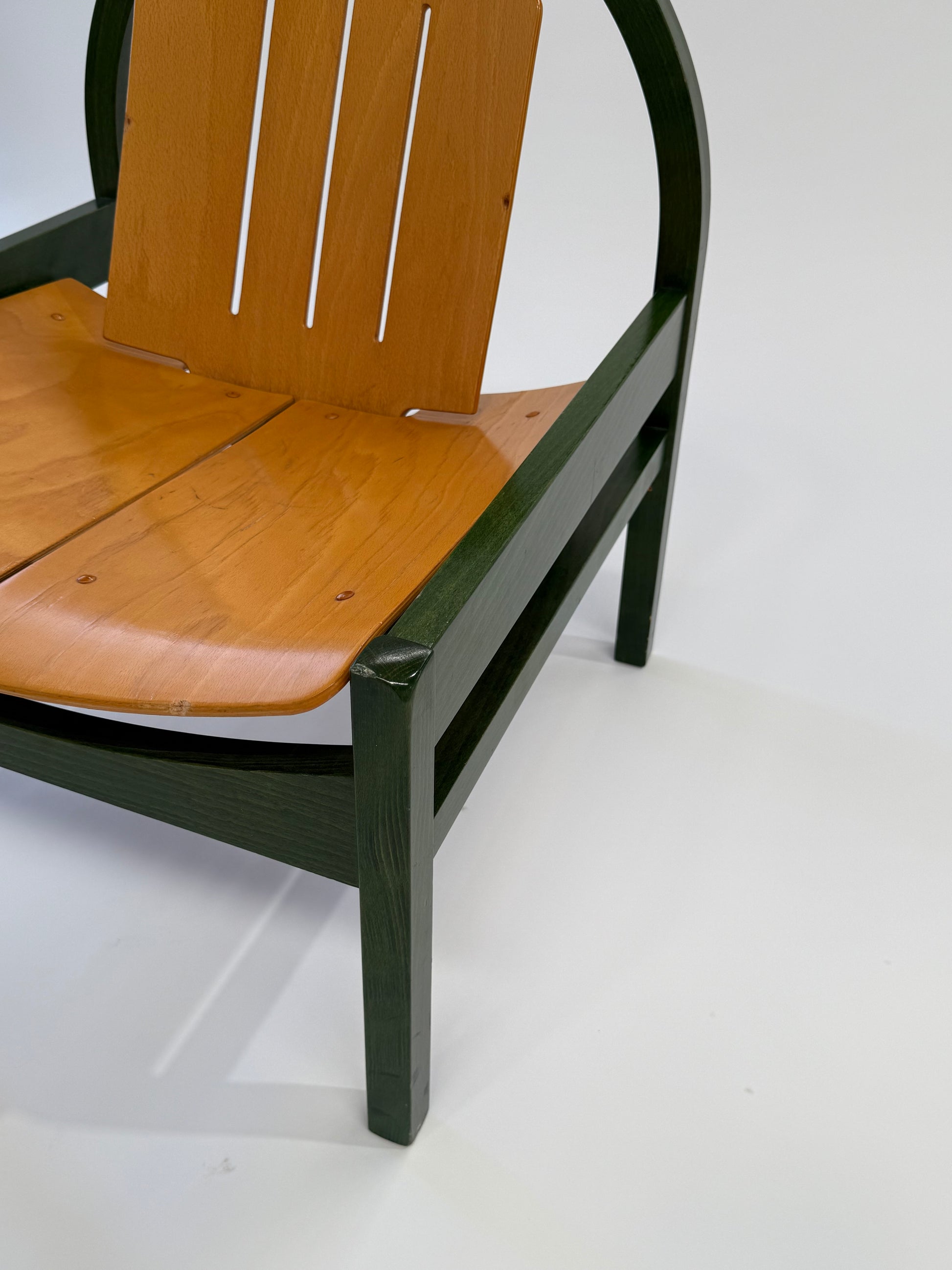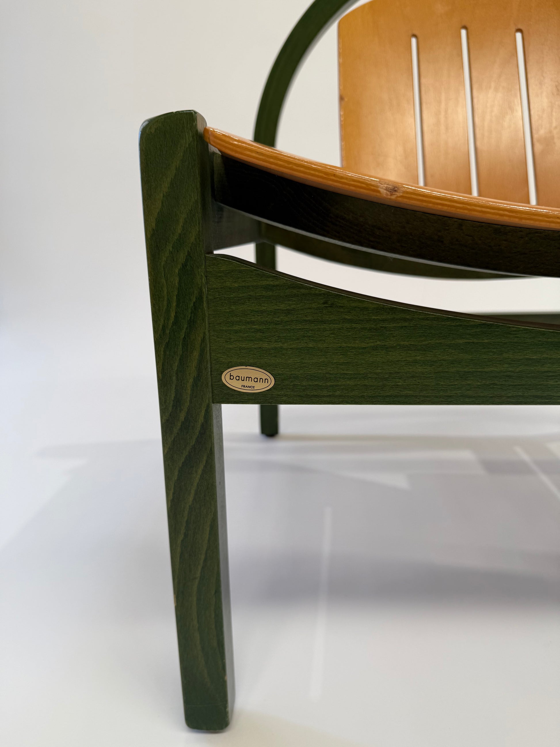Vintage French “Argos” armchair designed by Baumann. Circa 1980’s. Fabulous sculptural design with a fun mix of natural pine on a painted green frame. Sourced in France