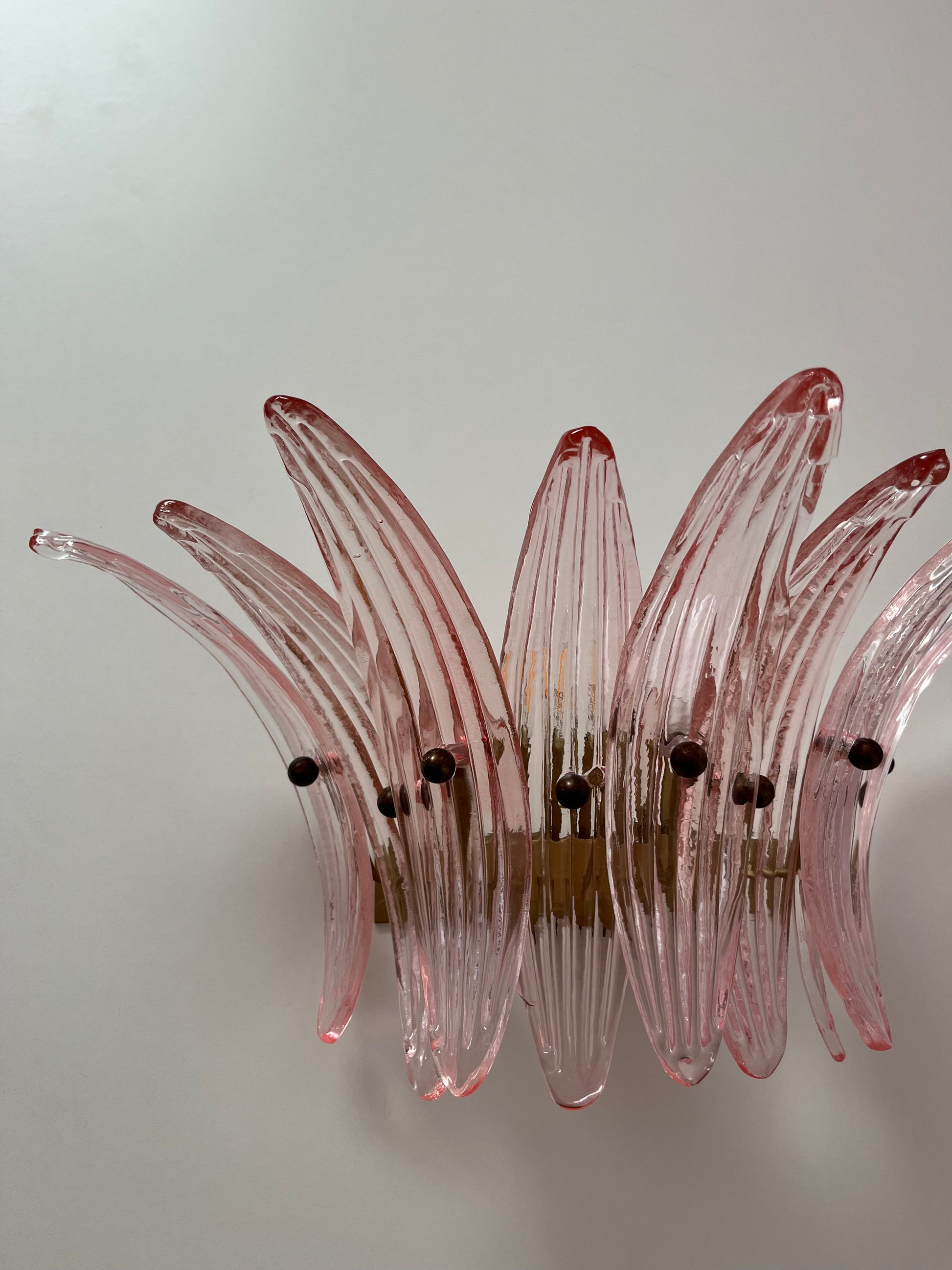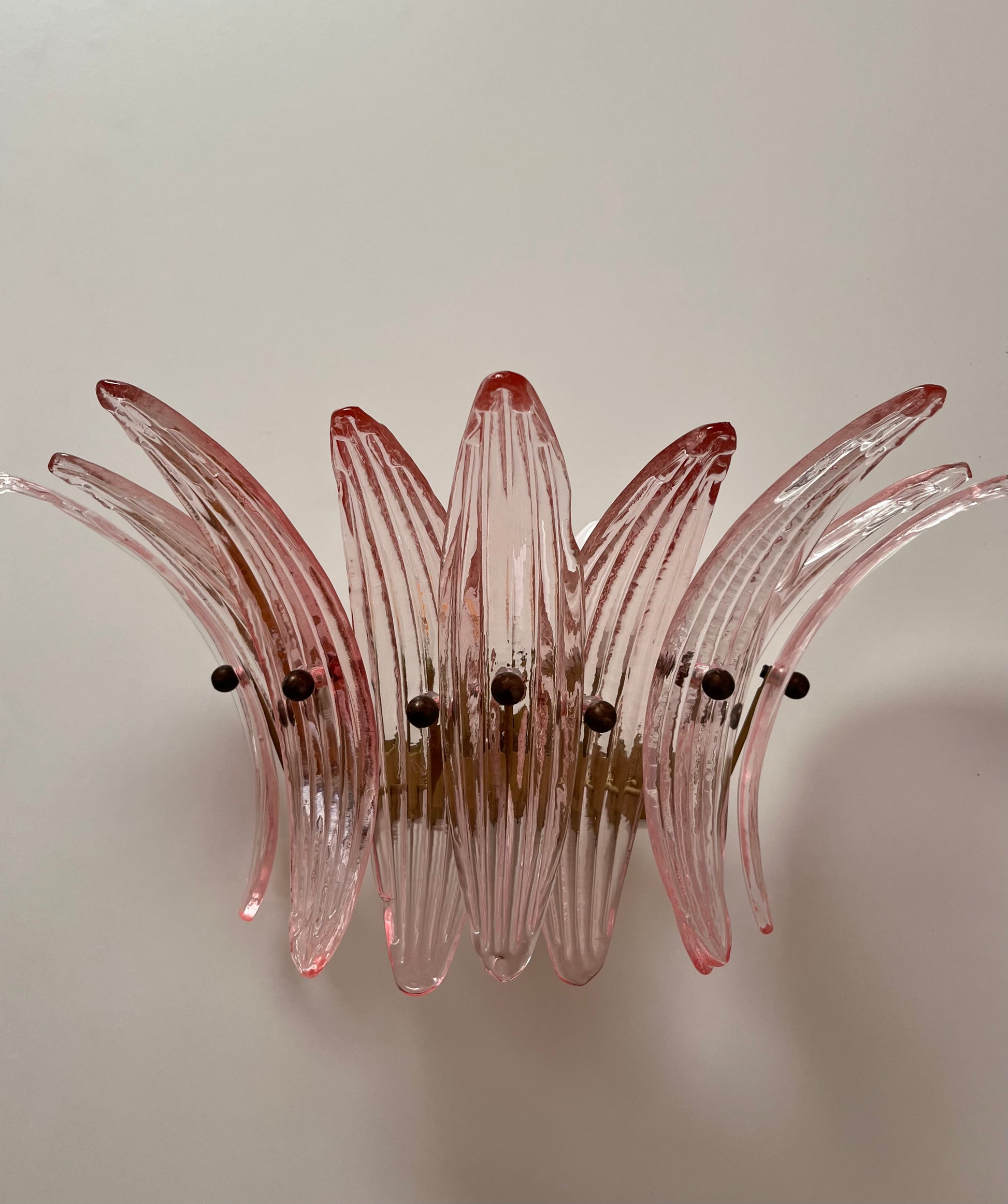Stunning pair of Murano glass wall lights featuring nine pale pink palmette panels on a brass fitting. Sourced in Italy