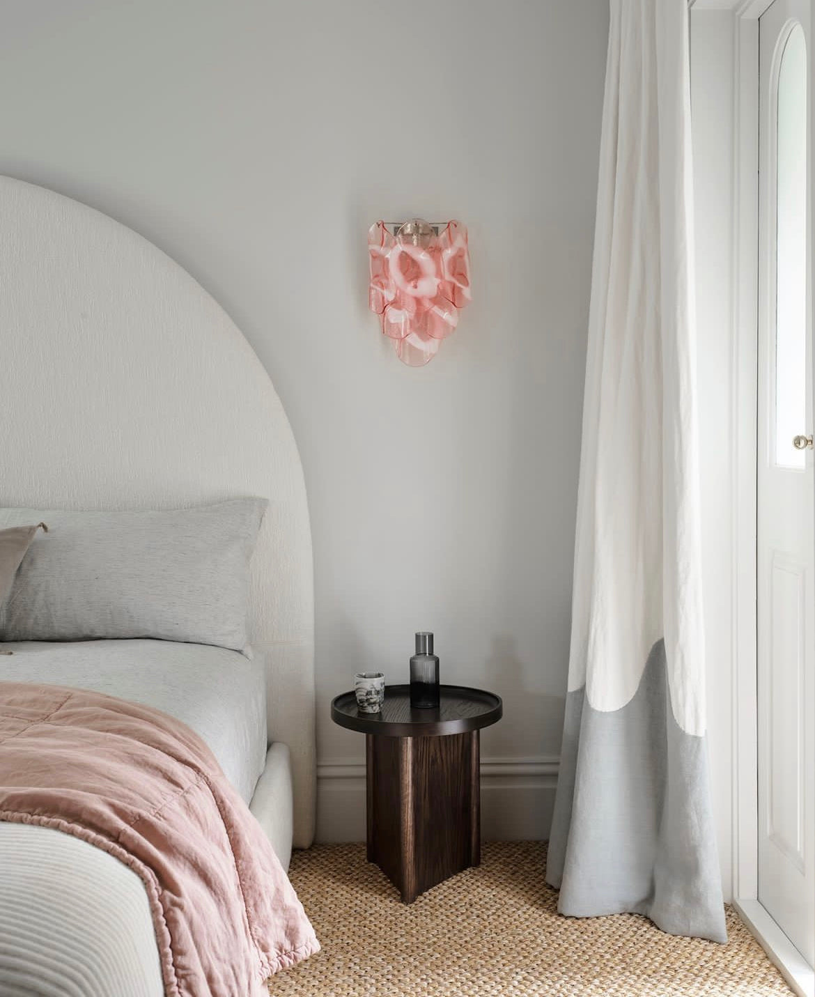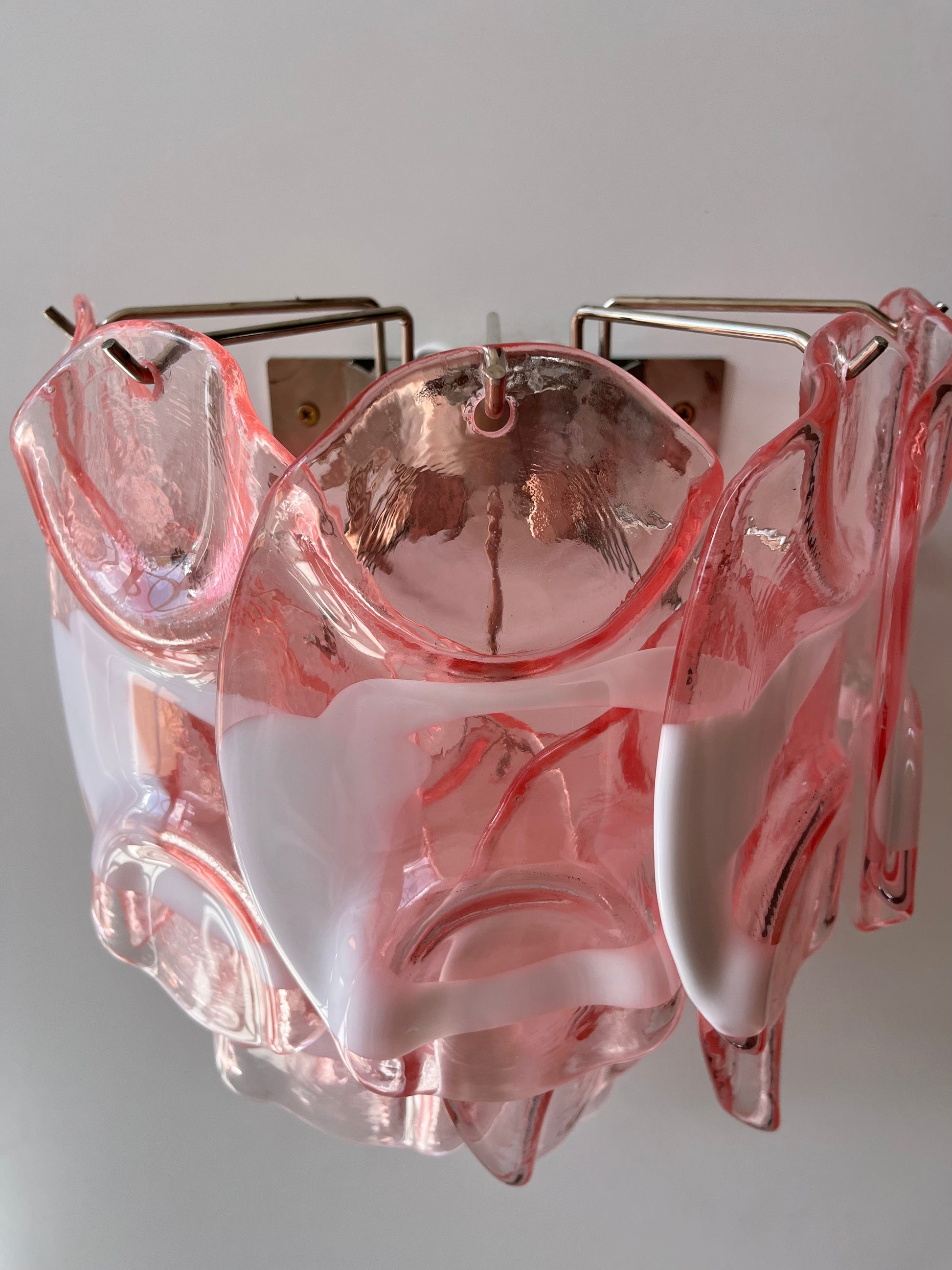 Stunning pair of Murano glass wall lights attributed to Vistosi. Featuring ten pink and clear glass scallop petals on a chrome fitting. Sourced in Italy